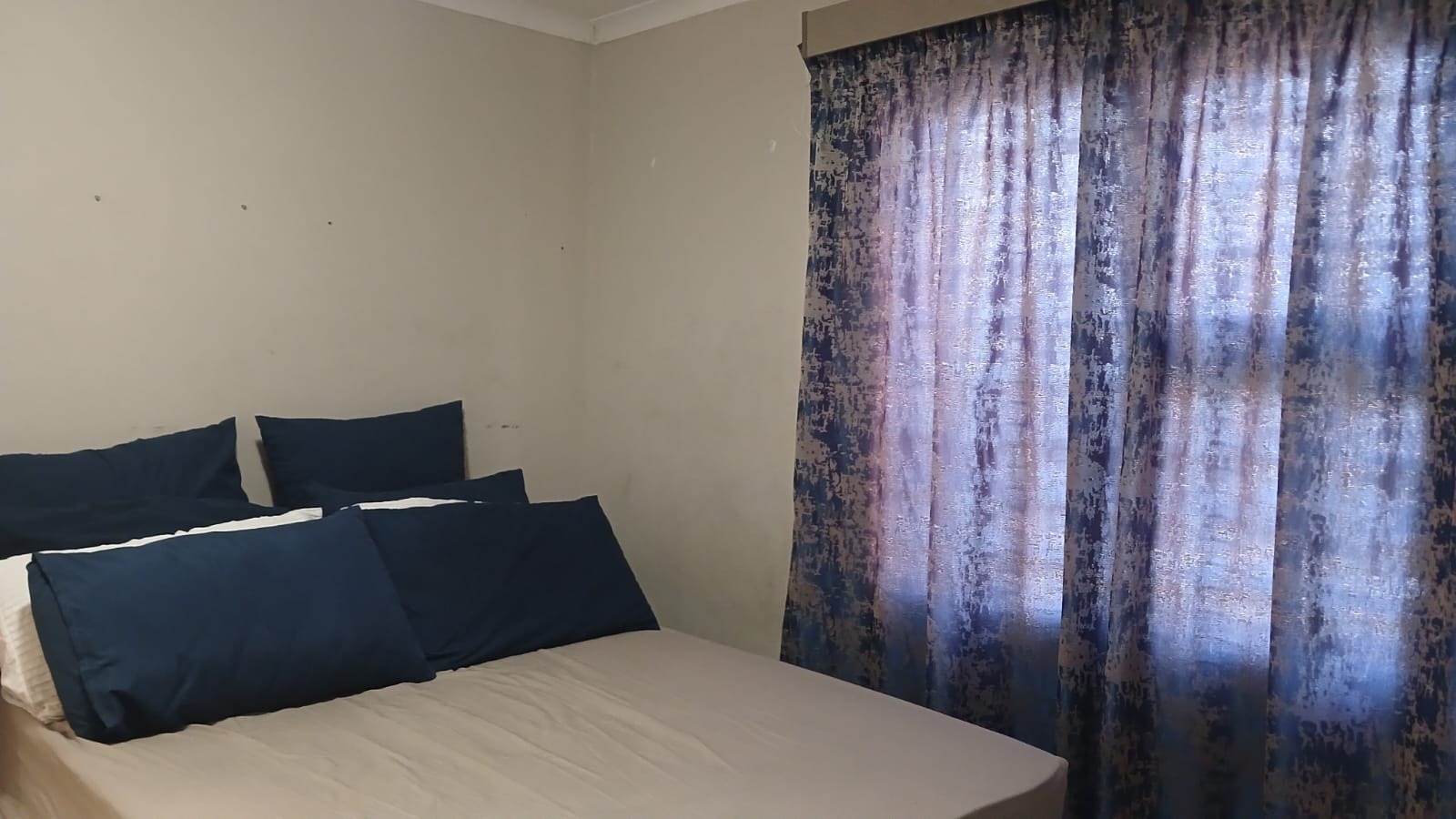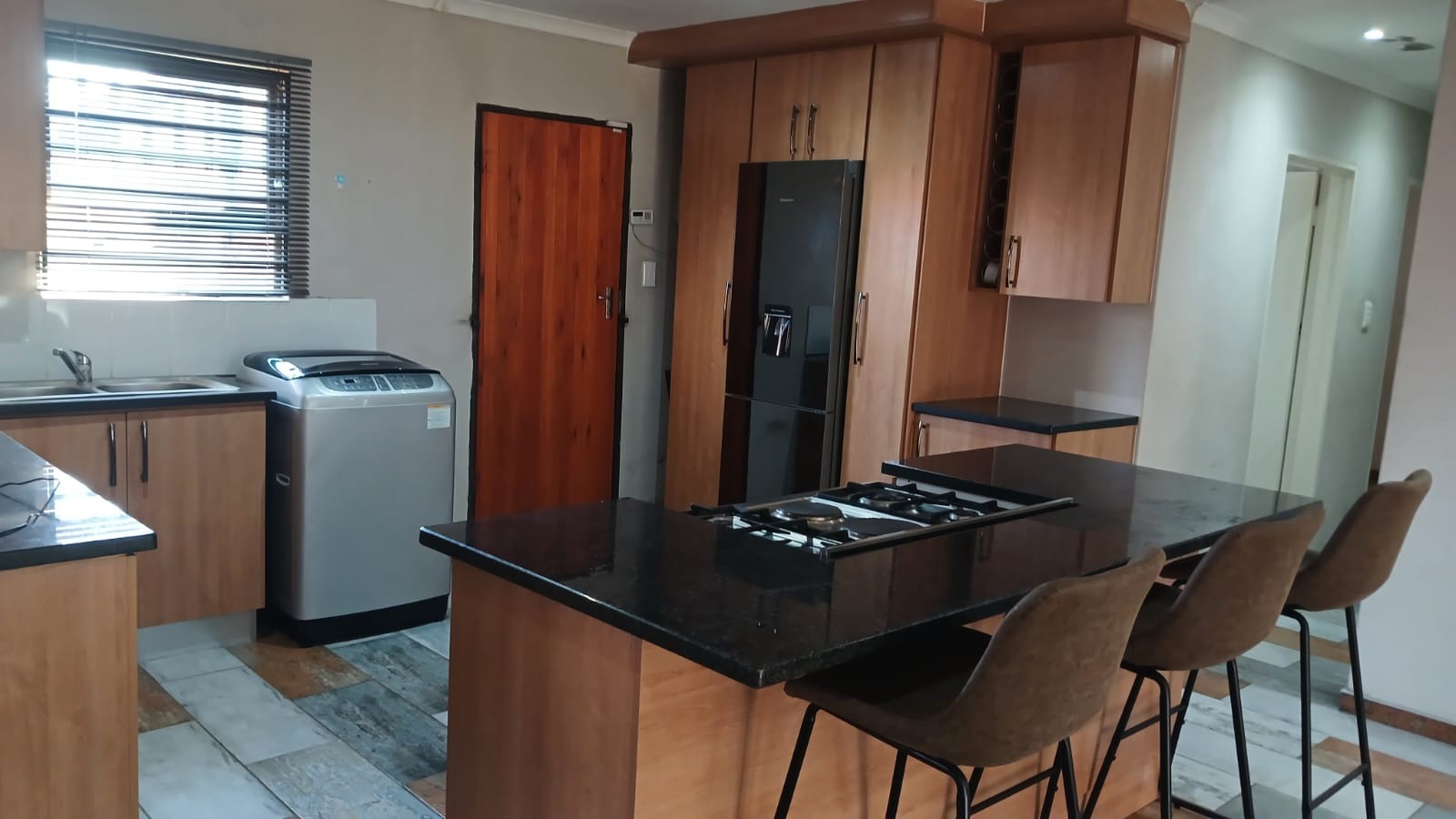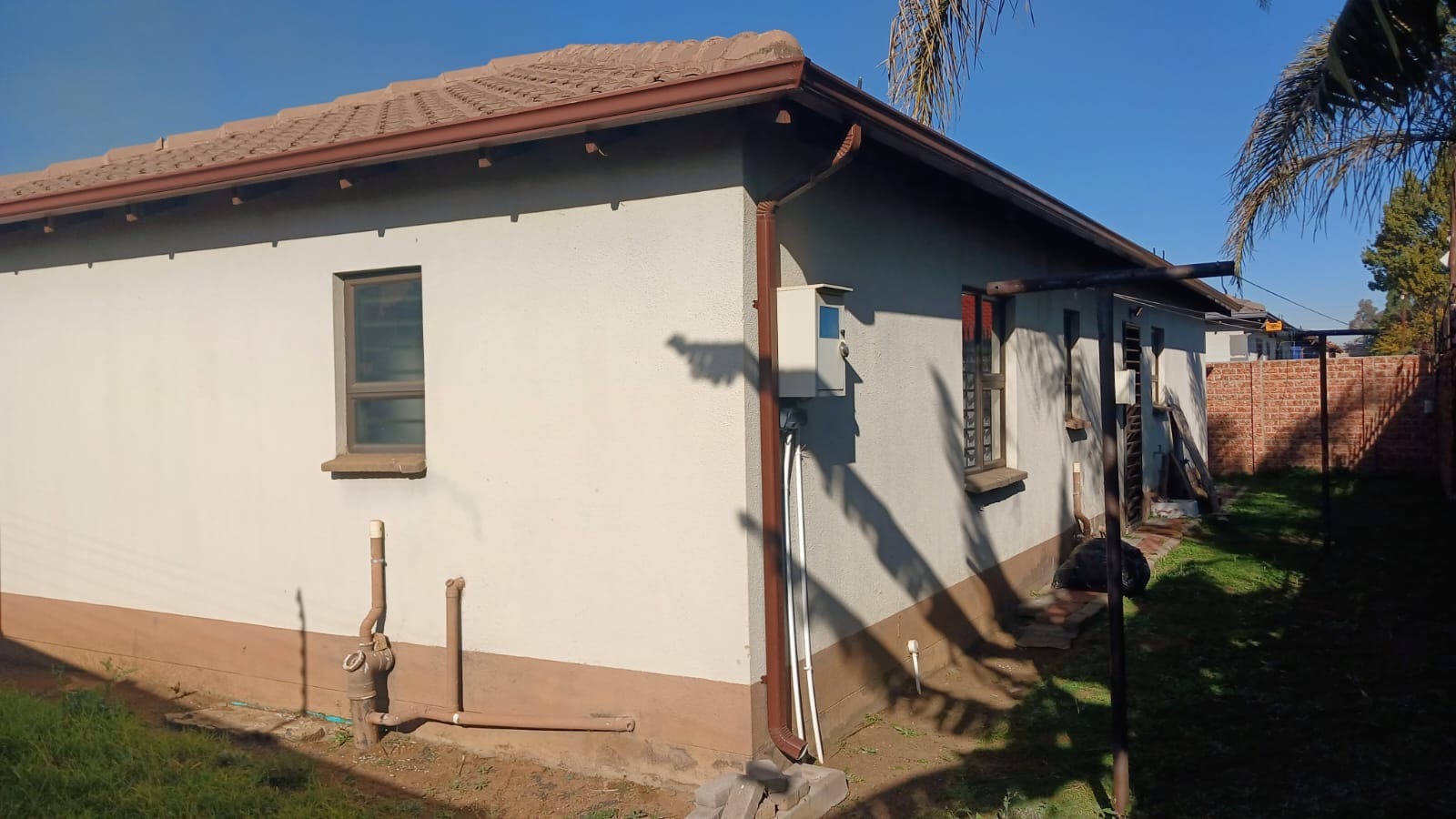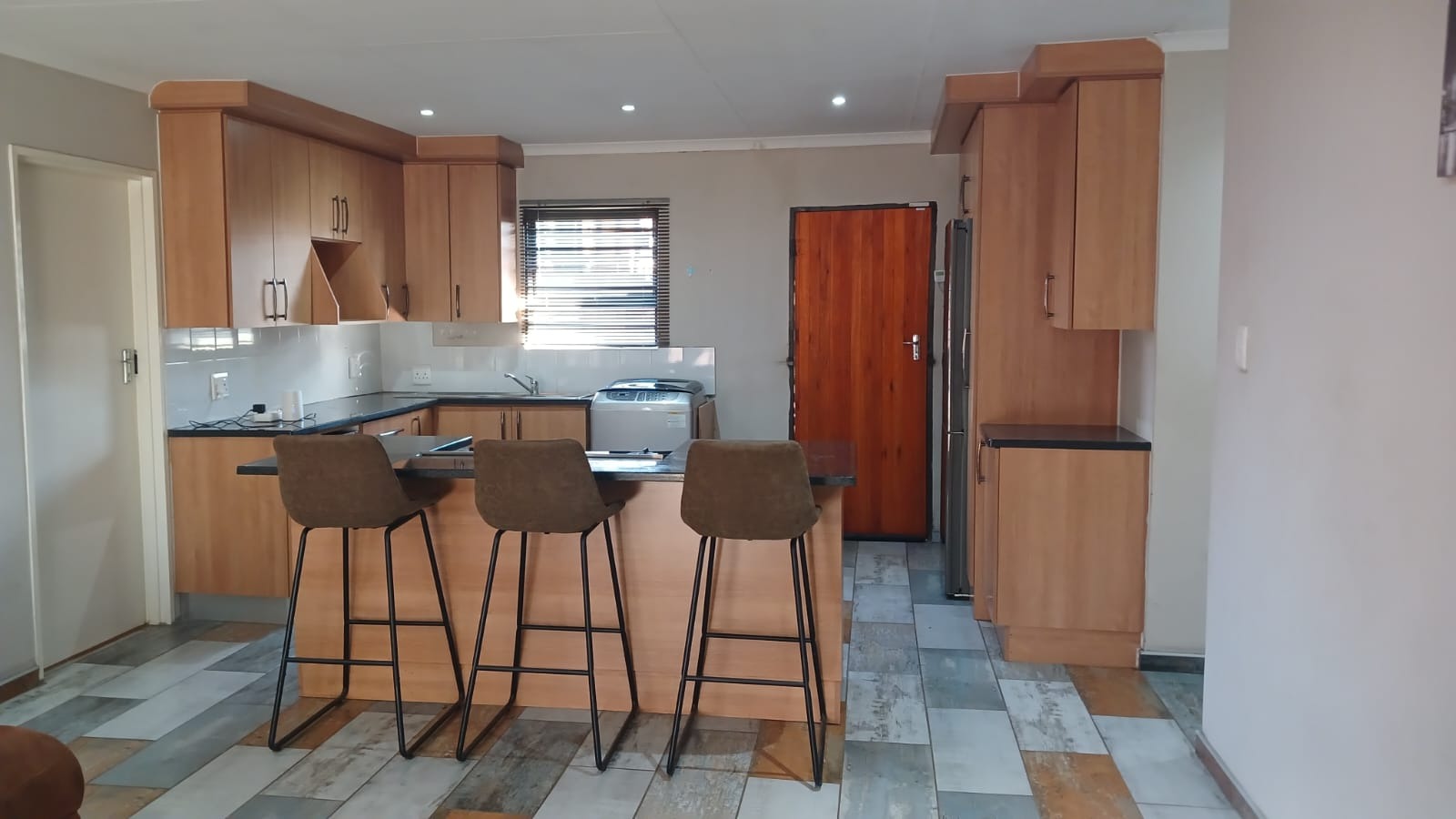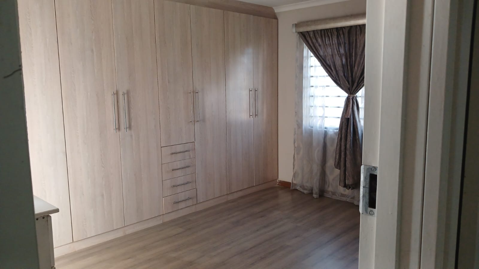 Inside, you'll find an open-plan kitchen with ample cupboard space, flowing seamlessly into a tiled dining area and lounge. The house boasts four bedrooms with wooden floors-three of which have built-in cupboards. There are two bathrooms: the first with a bath, basin, and toilet, the second, an en-suite in the main bedroom, with a shower, basin, and toilet.