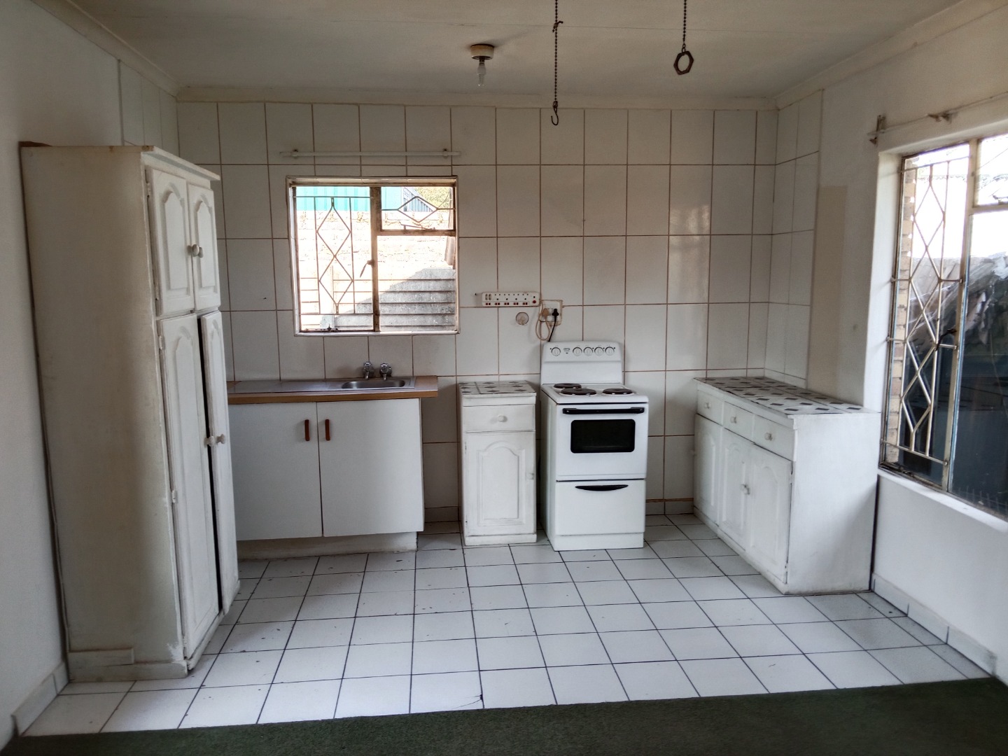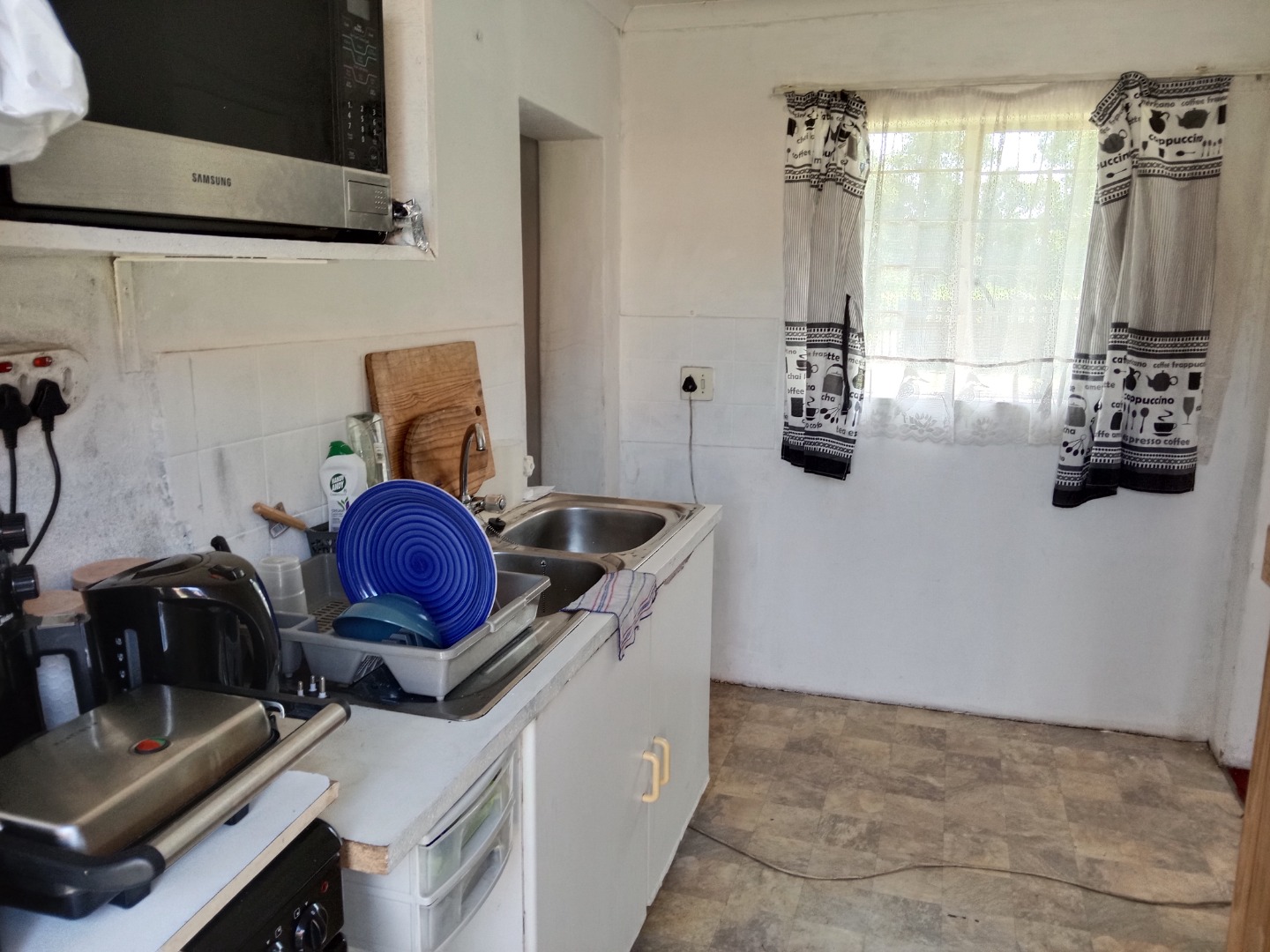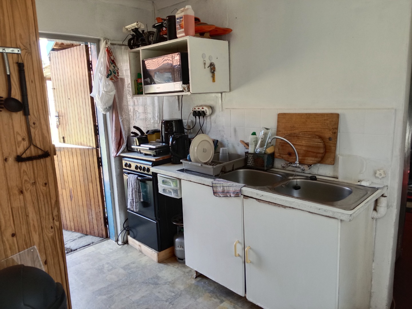 Inside, the home features a lounge area, benefiting from natural light, providing ample room for relaxation and family gatherings. The functional kitchen is equipped with a double sink and a gas stove/oven, offering direct outdoor access for convenience. While currently basic, this space holds significant potential for modern upgrades to suit your culinary preferences.
