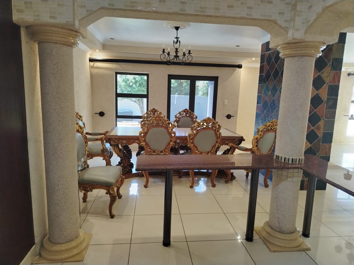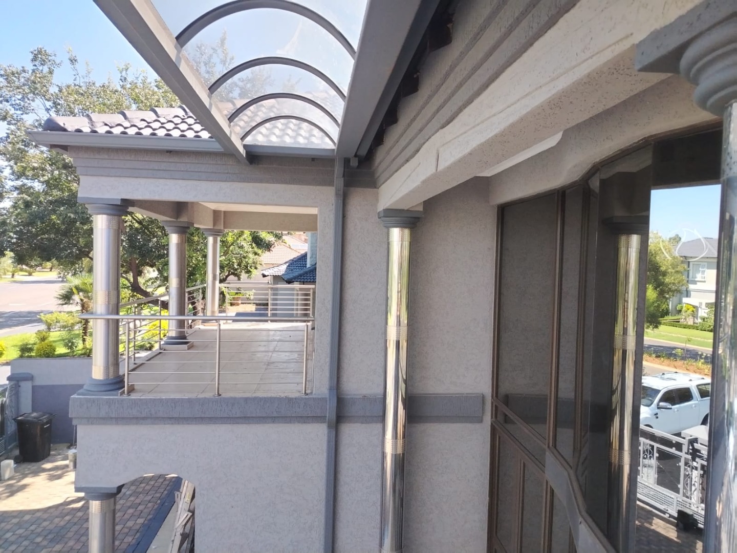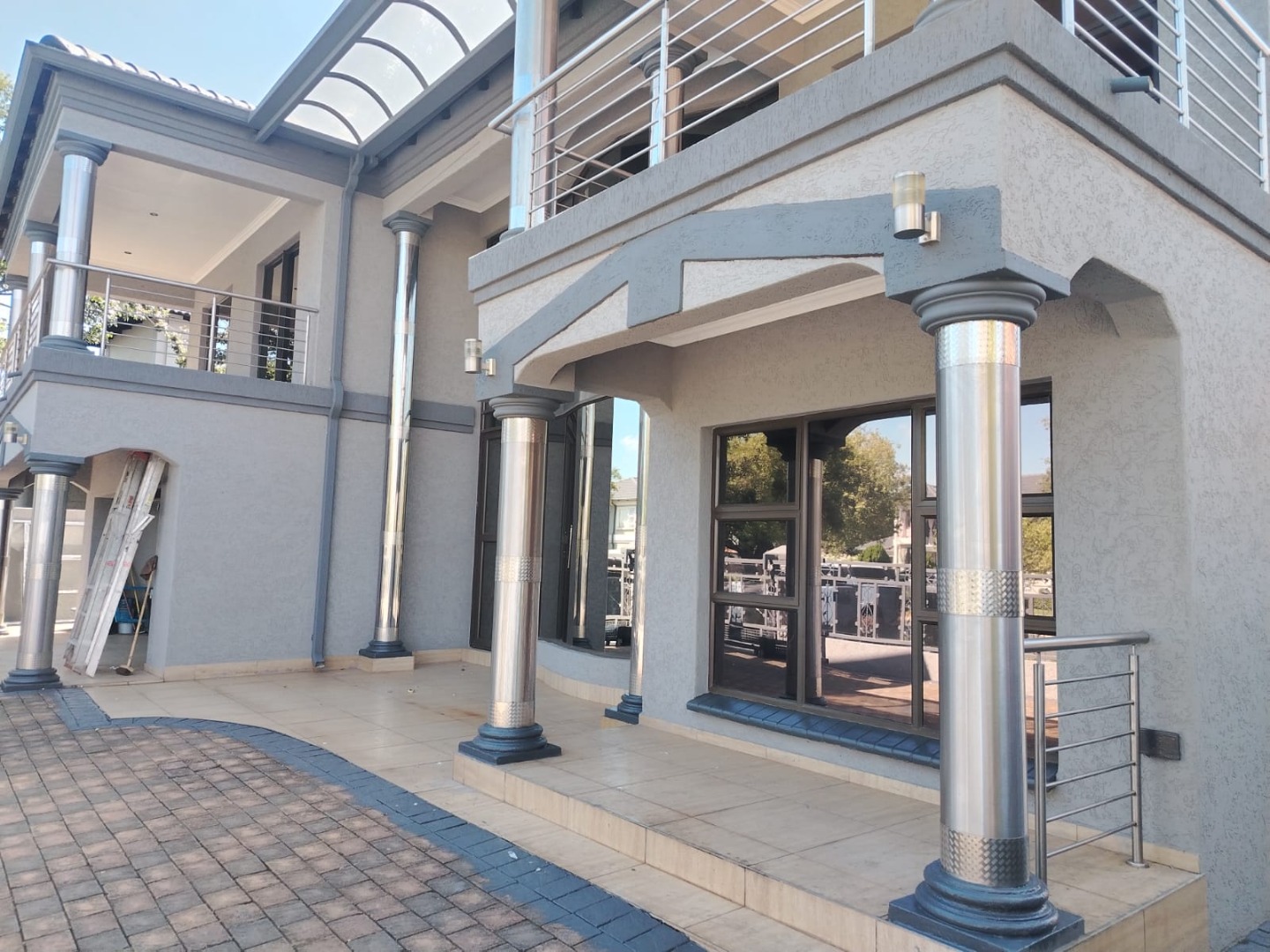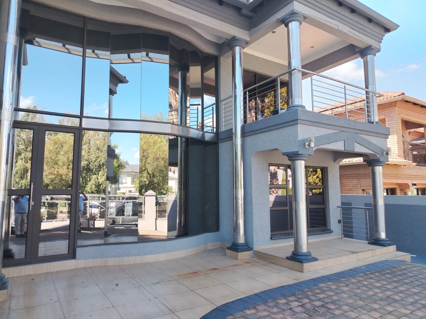 This modern, multi-story residence in Helderwyk presents a striking grey exterior with prominent architectural features and chrome accents. Inside, discover three lounges, a dining room, and a well-appointed kitchen with a pantry. The open-plan layout, modern tilled flooring, and neutral walls create versatile living spaces, complemented by a dedicated study and special doors.
