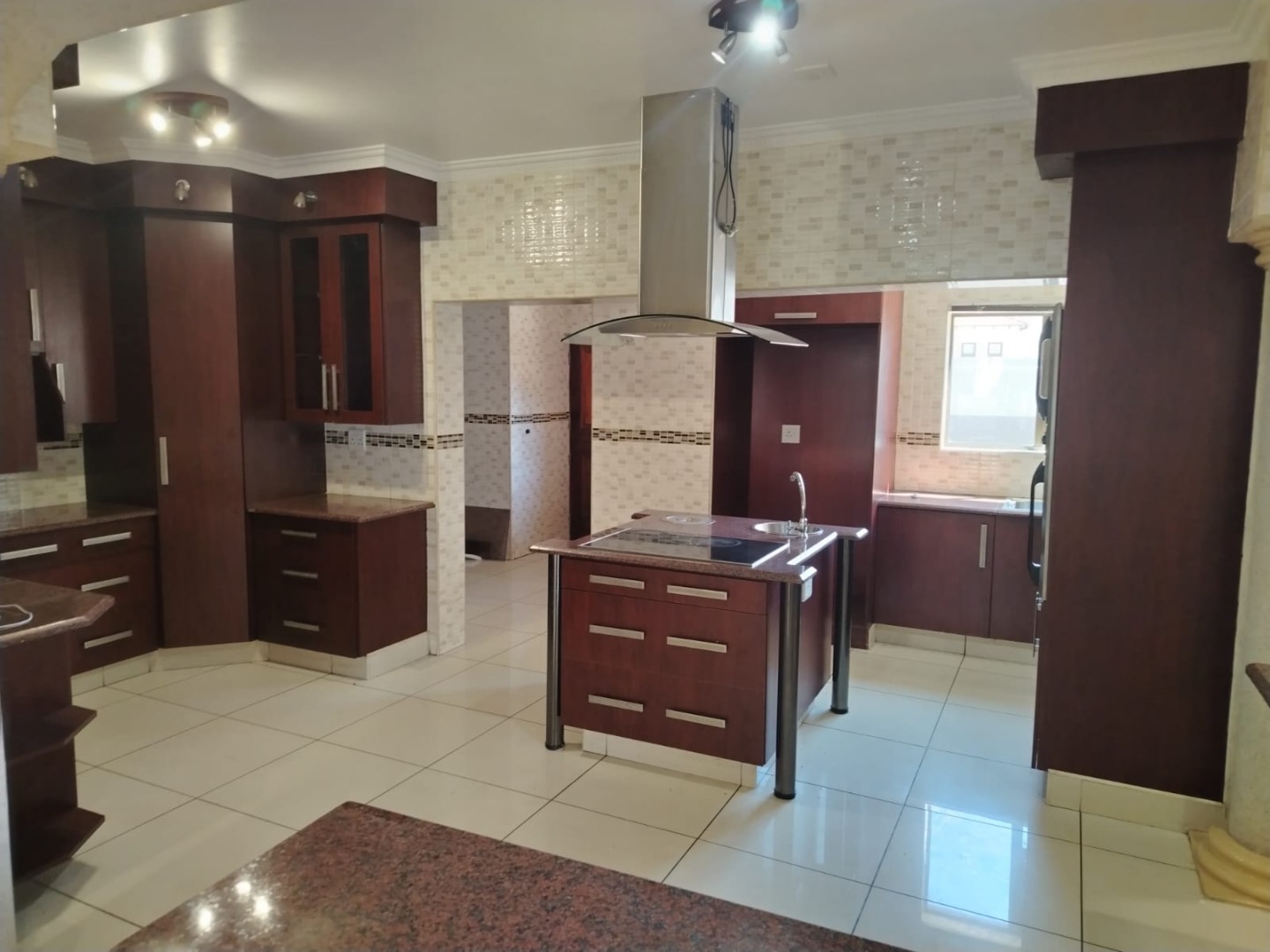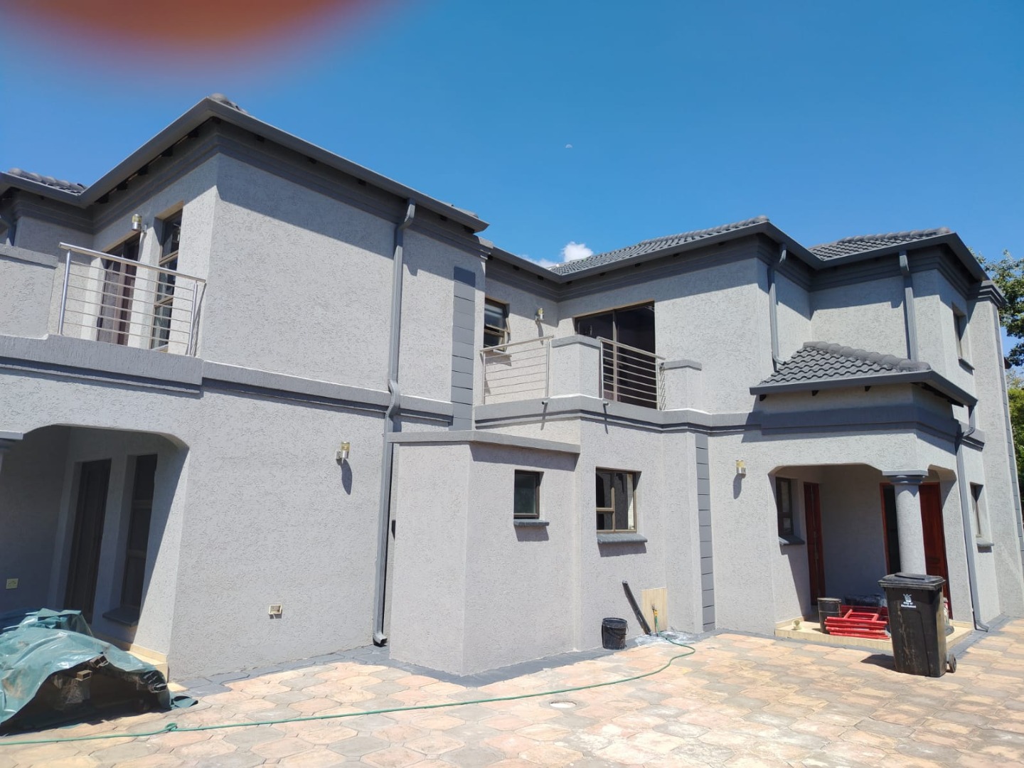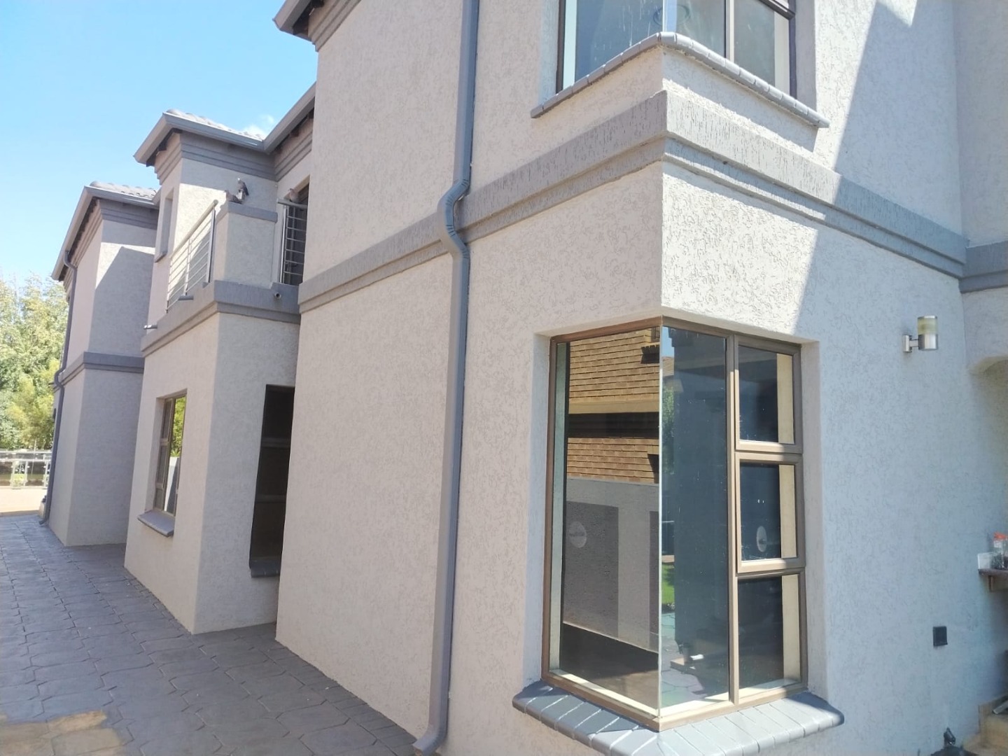 This modern, multi-story residence in Helderwyk presents a striking grey exterior with prominent architectural features and chrome accents. Inside, discover three lounges, a dining room, and a well-appointed kitchen with a pantry. The open-plan layout, modern tilled flooring, and neutral walls create versatile living spaces, complemented by a dedicated study and special doors.