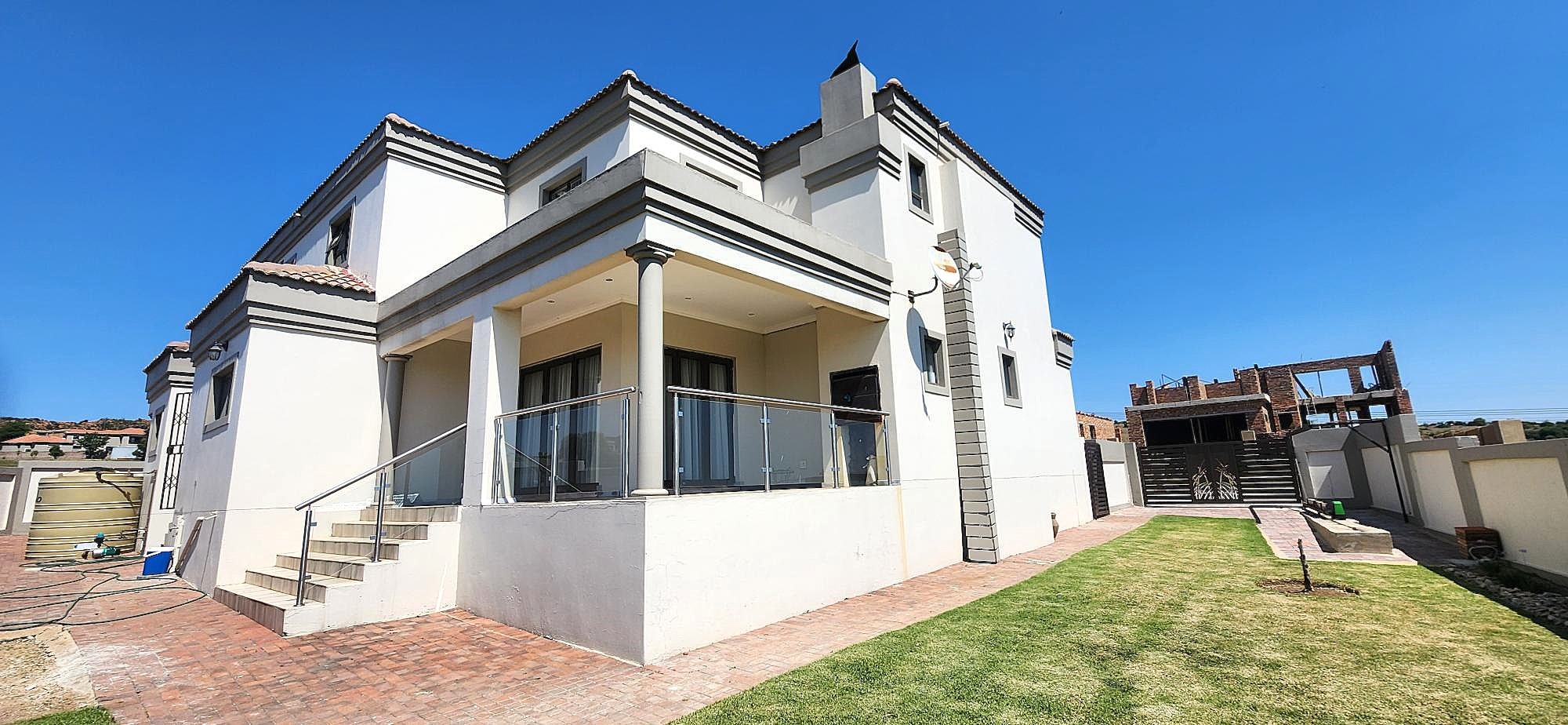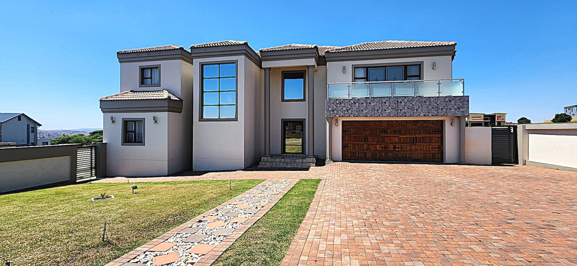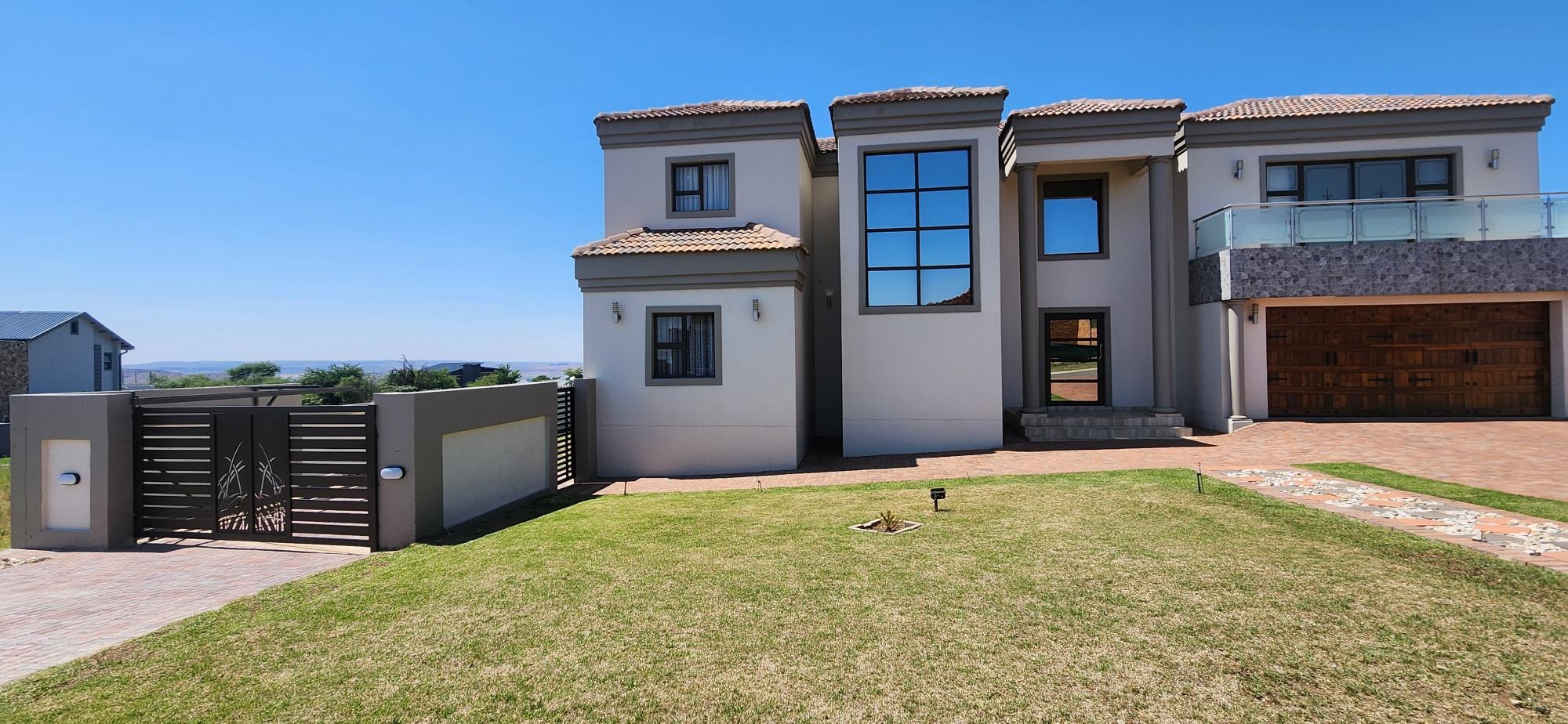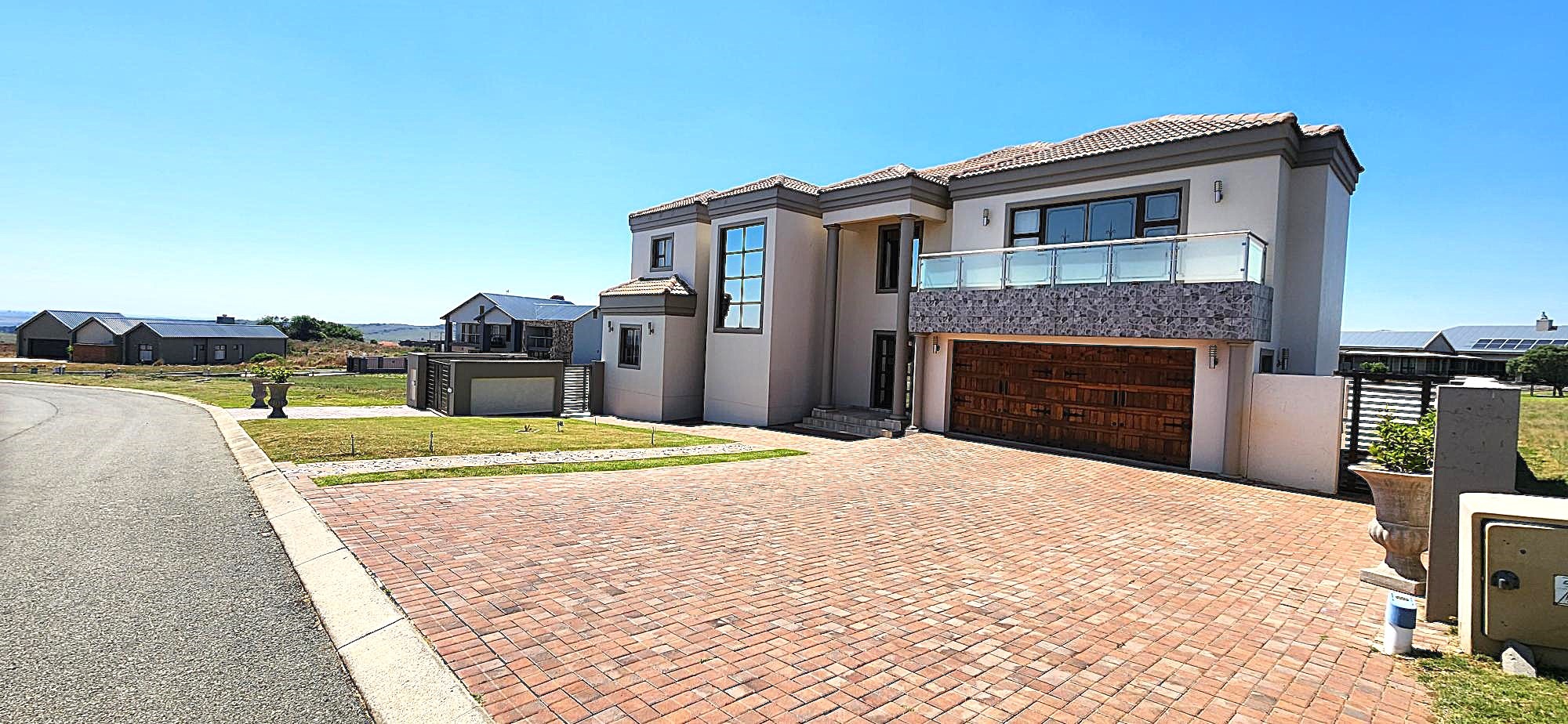 Discover an unparalleled lifestyle within this magnificent four-bedroom, three-bathroom residence, perfectly positioned in the esteemed Berg En Dal, Heidelberg. This modern, double-story architectural masterpiece immediately captivates with its striking kerb appeal, featuring a secure, decorative gated entrance, an expansive paved driveway, and a double garage with an attractive wooden door, offering ample parking for four vehicles. The elevated position promises breathtaking scenic views, enhancing the allure of this South African gem.