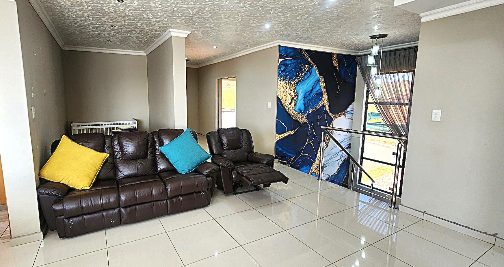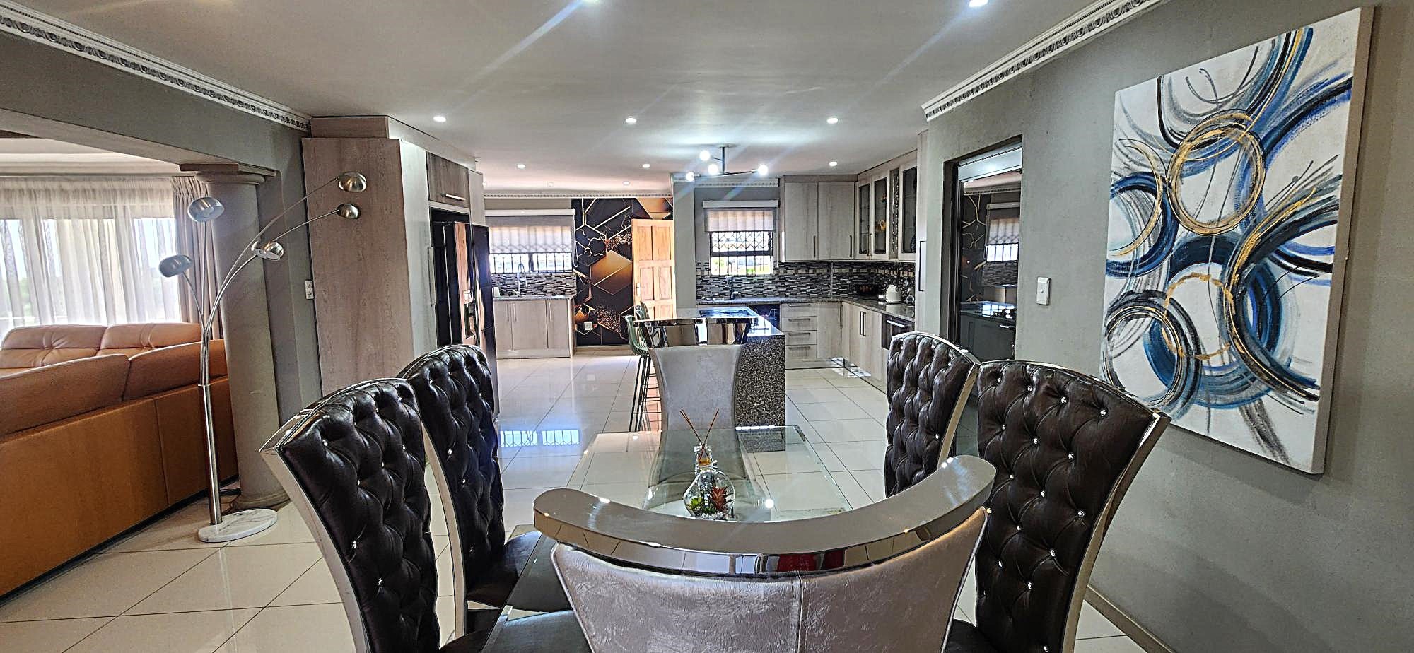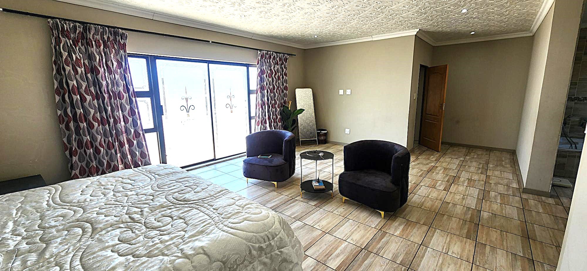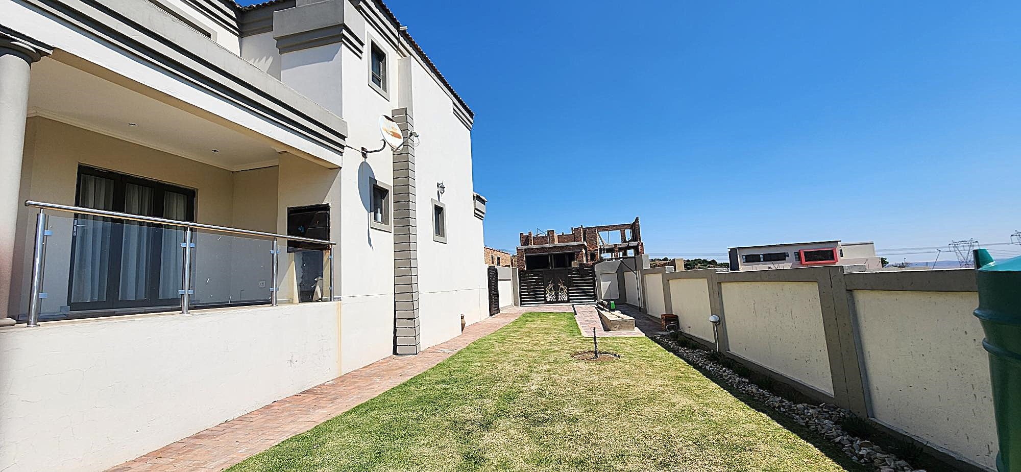 Discover an unparalleled lifestyle within this magnificent four-bedroom, three-bathroom residence, perfectly positioned in the esteemed Berg En Dal, Heidelberg. This modern, double-story architectural masterpiece immediately captivates with its striking kerb appeal, featuring a secure, decorative gated entrance, an expansive paved driveway, and a double garage with an attractive wooden door, offering ample parking for four vehicles. The elevated position promises breathtaking scenic views, enhancing the allure of this South African gem.