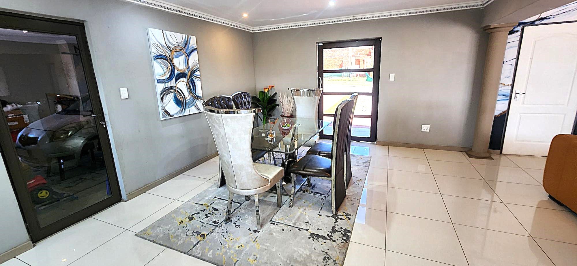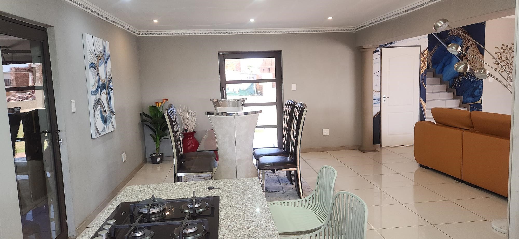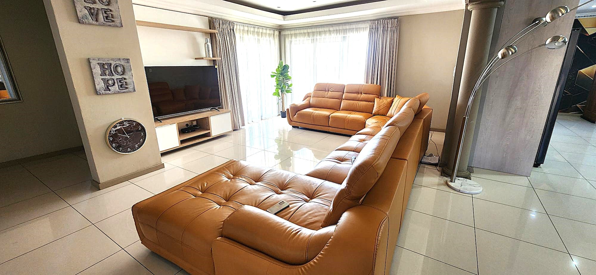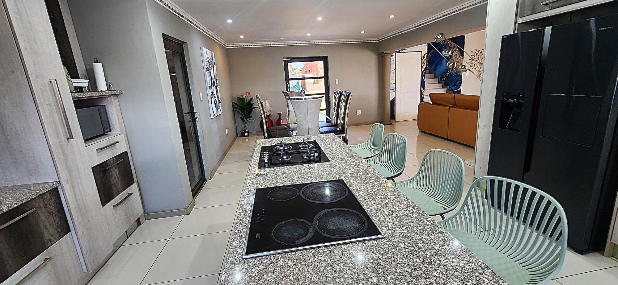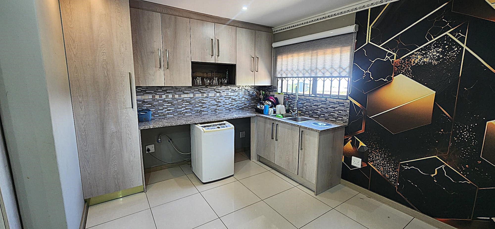 Outdoor living is equally refined, with a well-maintained garden providing a serene backdrop for relaxation. The property includes a built-in braai, perfect for entertaining, and domestic rooms for added convenience. Security is paramount within this gated community, offering peace of mind with 24-hour security, an intercom system, burglar bars, and security gates. Essential modern amenities include fibre connectivity and water tanks, ensuring a comfortable and connected lifestyle.
