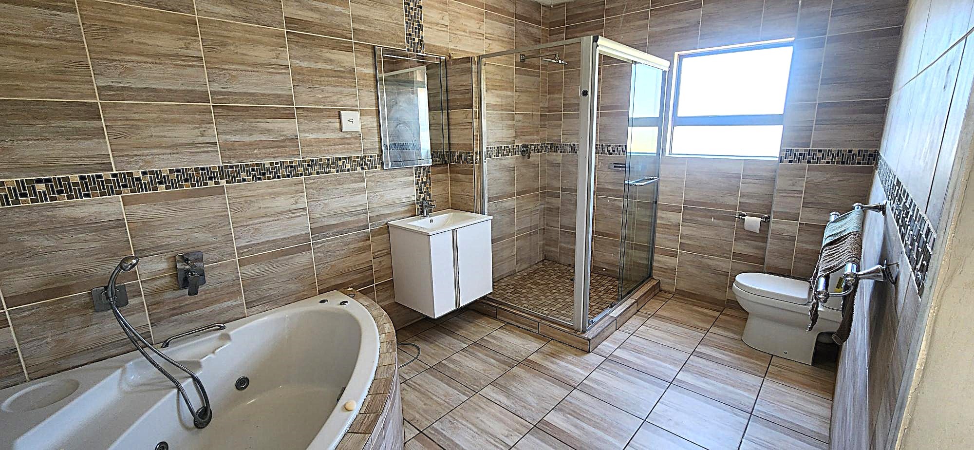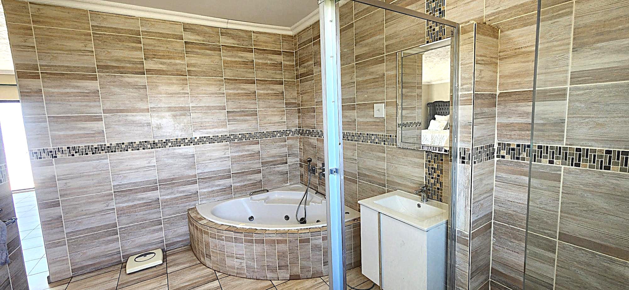 Step inside to an interior designed for sophisticated living, boasting an open-plan layout that seamlessly connects the elegant lounge, dining area, and a well-appointed kitchen. The flow is impeccable, leading to a family TV room, ideal for intimate gatherings. Each of the four spacious bedrooms offers a private sanctuary, with two featuring luxurious en-suite bathrooms. The master suite is a true indulgence, complete with a walk-through dressing room featuring extensive built-in light wood wardrobes and shelving, leading to a lavish en-suite bathroom with a corner jacuzzi tub and modern glass-enclosed shower, all adorned with stylish wood-look tiling and mosaic accents.