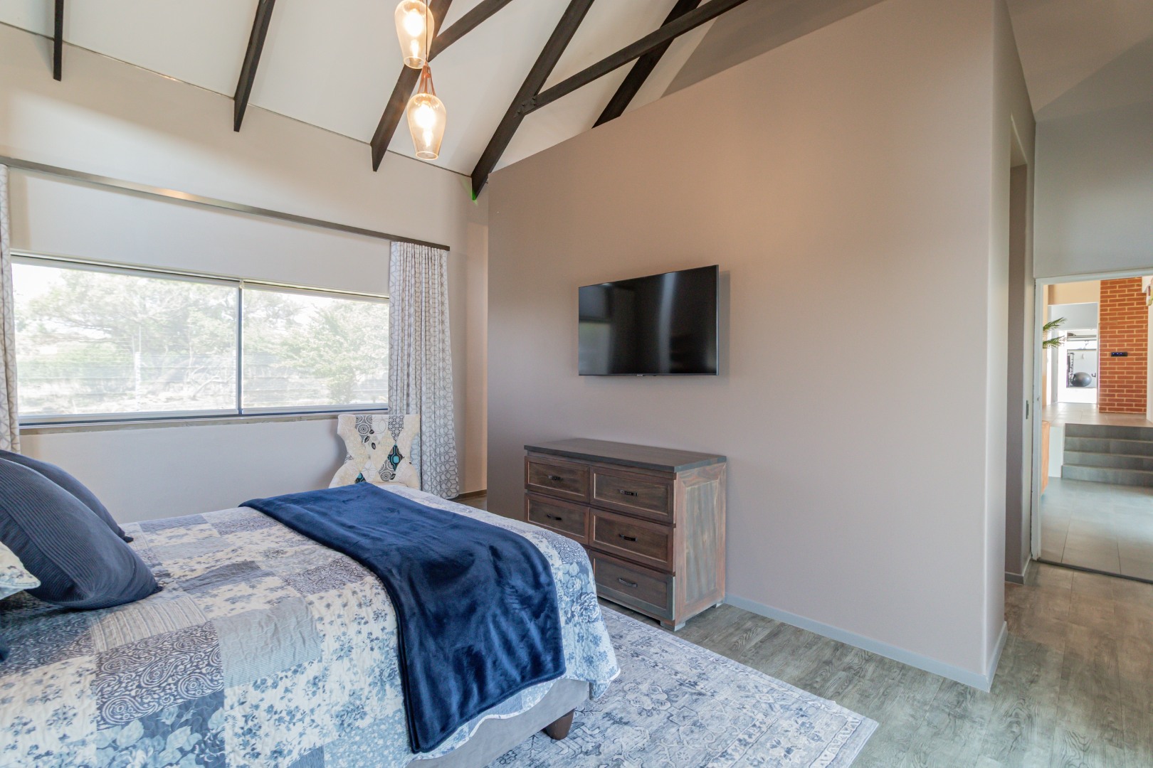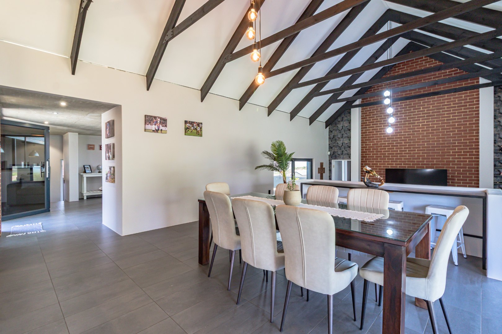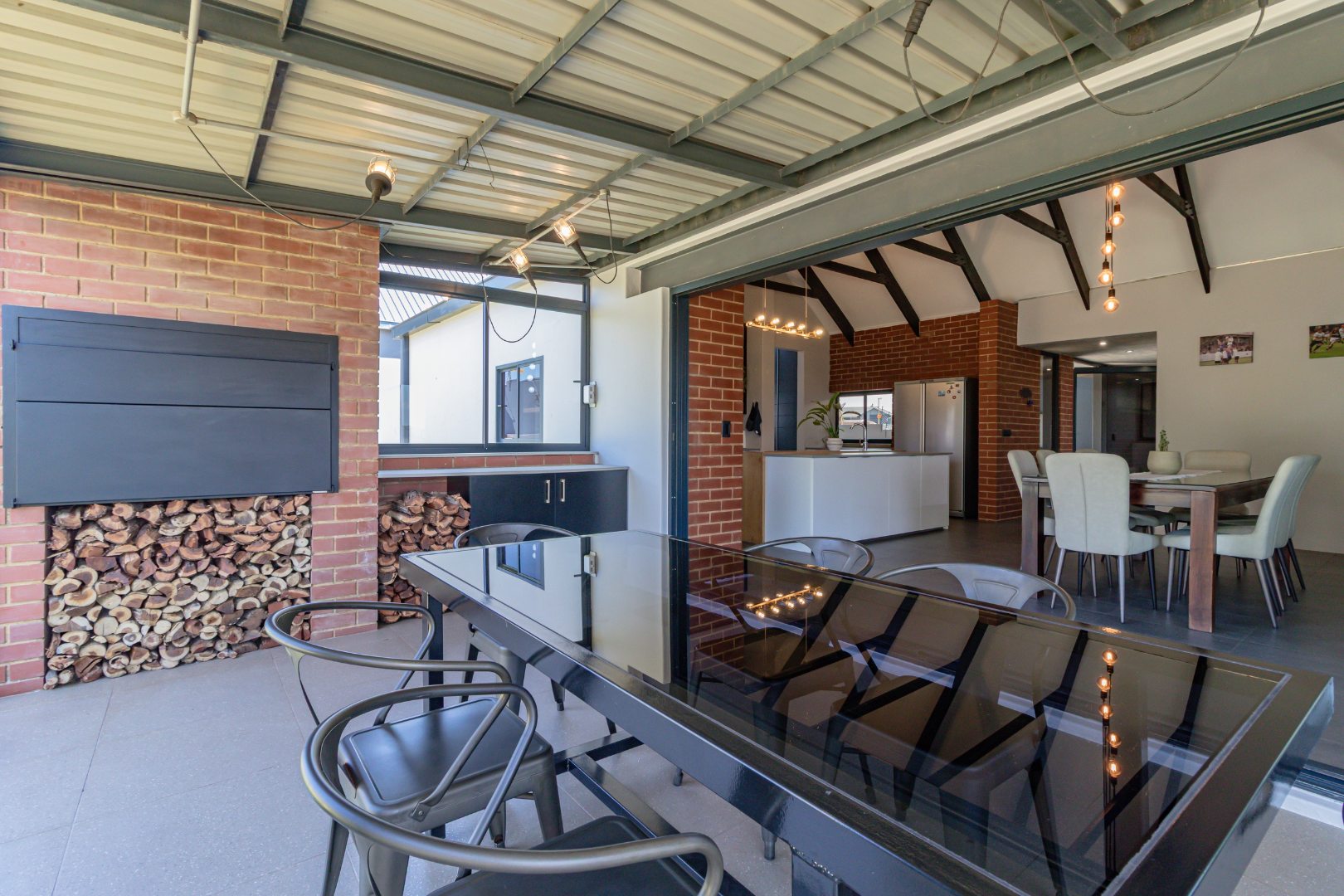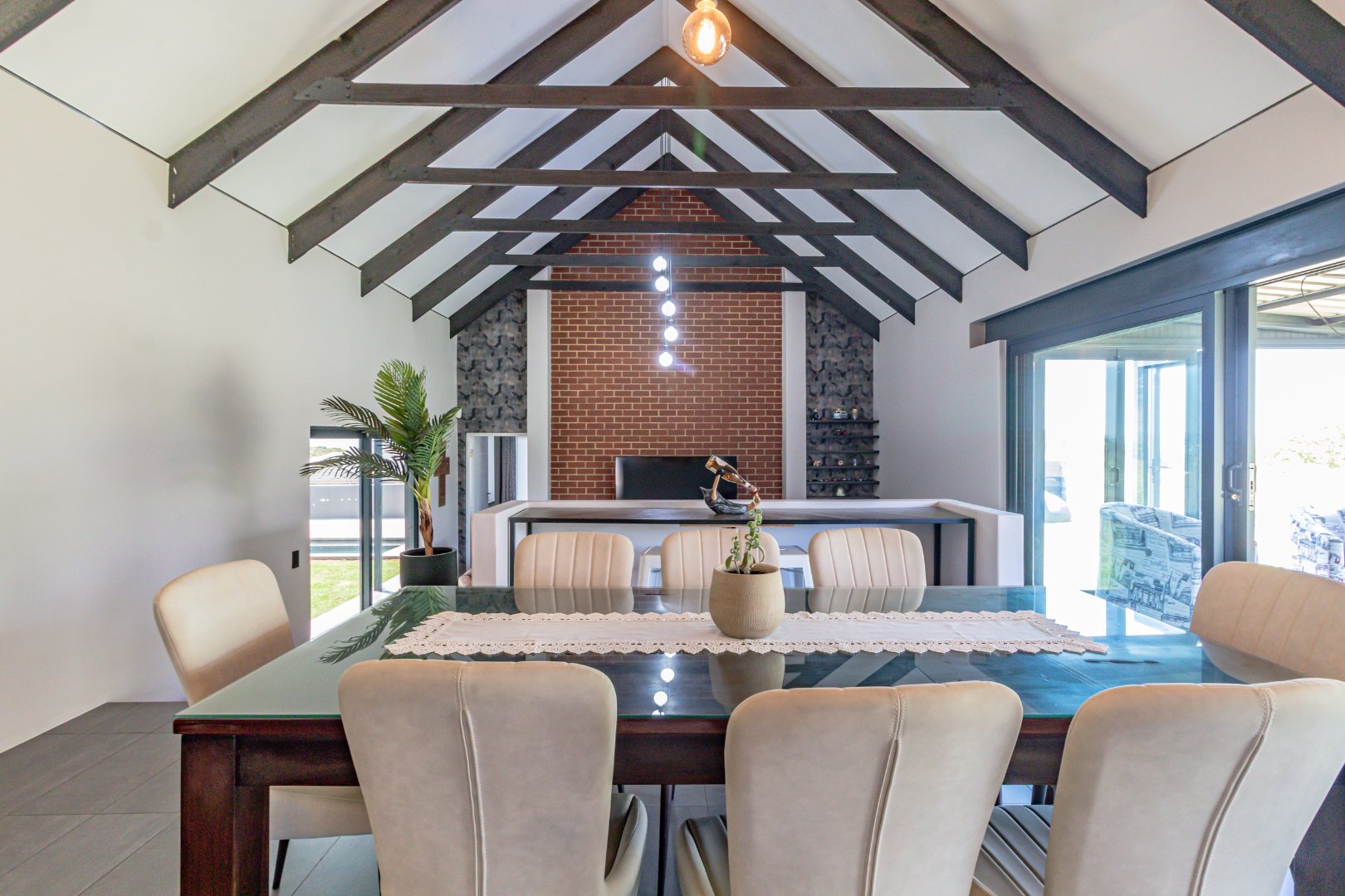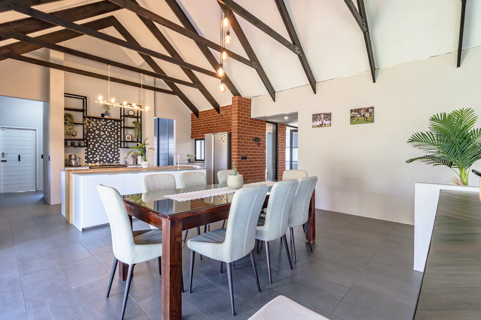 Step inside to an expansive open-plan living space featuring high vaulted ceilings with exposed beams in the dining and kitchen areas. The modern industrial kitchen is a chef's delight, equipped with a large island and a unique hexagonal tile backsplash. Seamless indoor-outdoor flow is achieved through large sliding glass doors, leading to a covered patio perfect for entertaining.