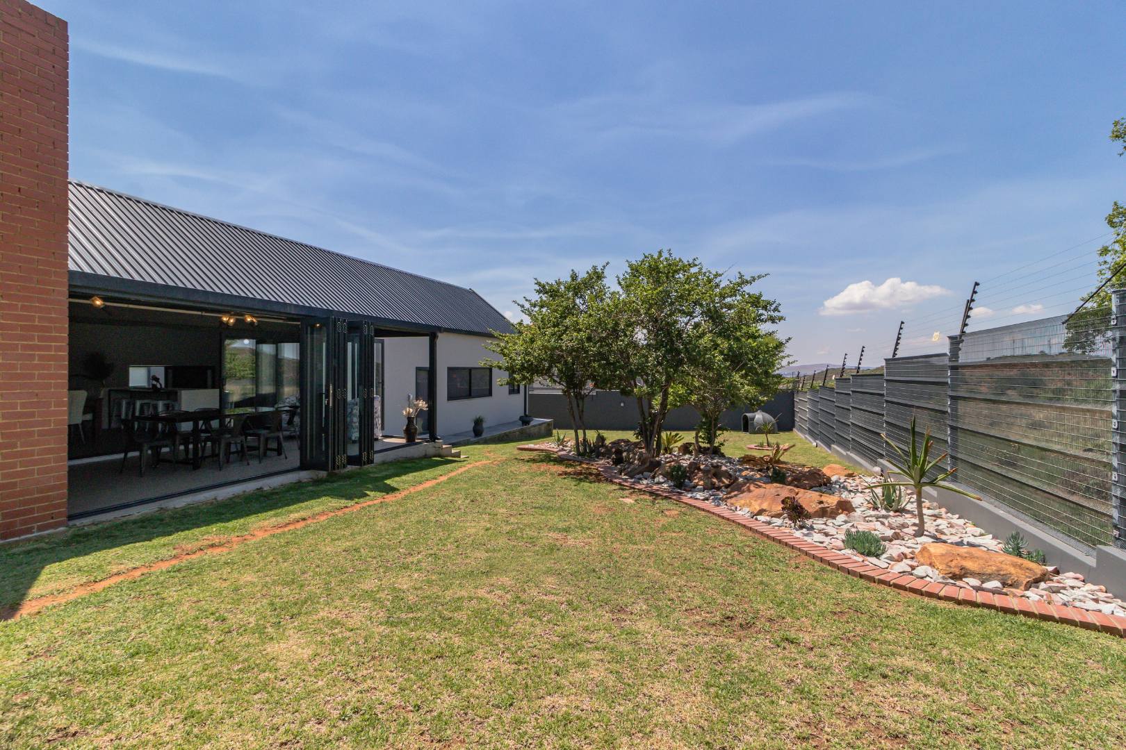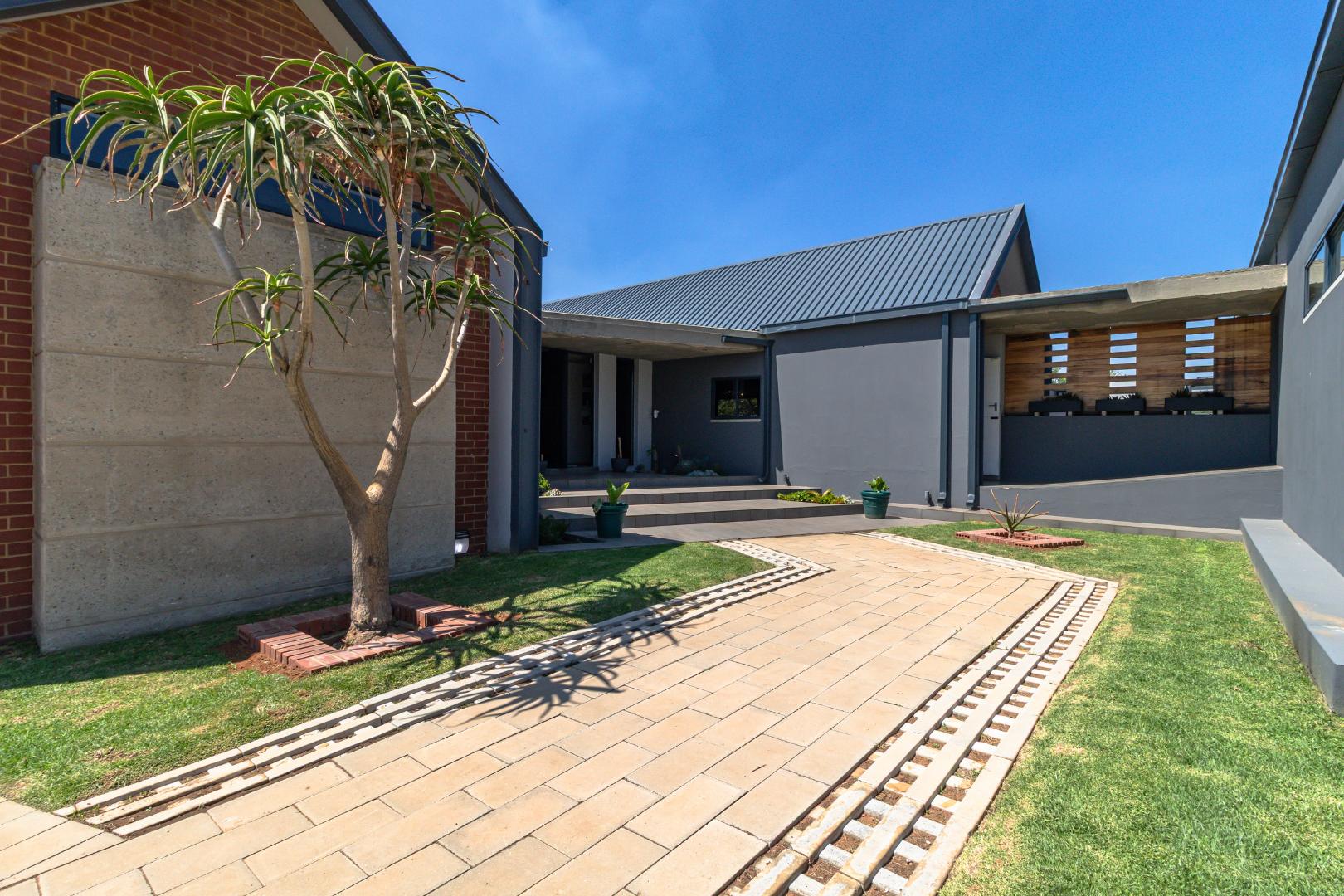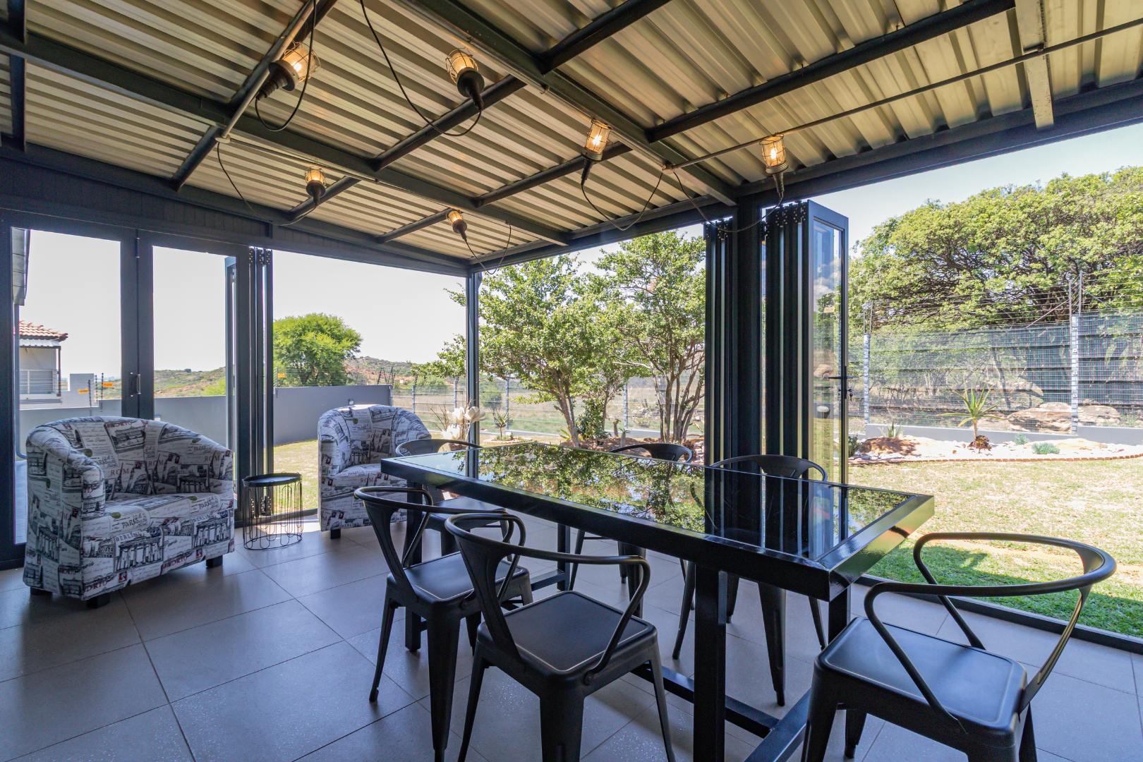 This contemporary 4-bedroom, 3.5-bathroom residence is nestled within a secure estate in Berg En Dal, Heidelberg, South Africa, offering scenic views never to be spoilt as it is bordering the Suikerbosrand Nature Reserve. The property boasts a striking modern architectural design with clean lines, varied materials, and a well-maintained exterior, creating excellent kerb appeal.