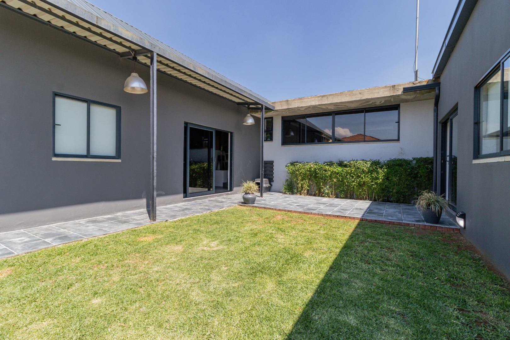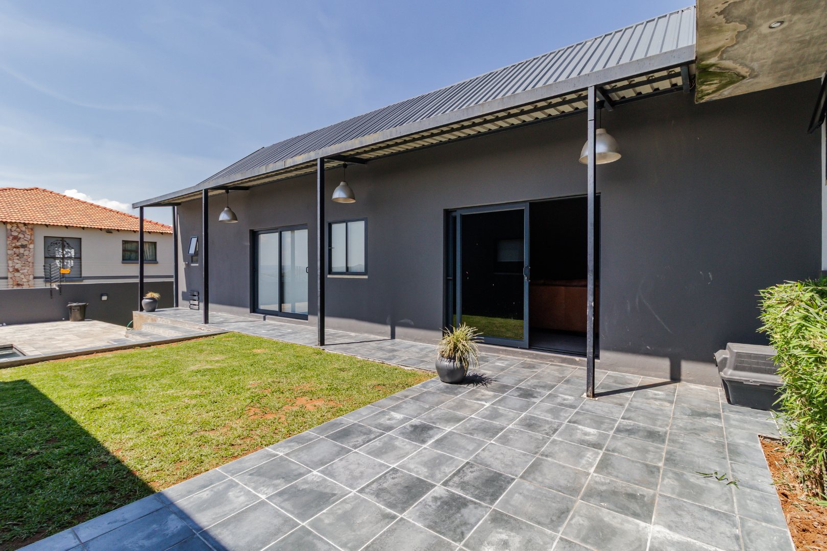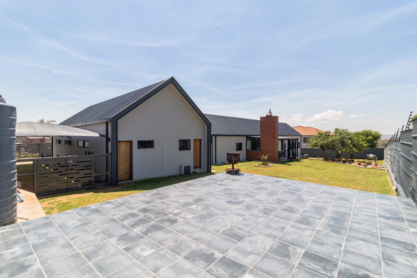 This contemporary 4-bedroom, 3.5-bathroom residence is nestled within a secure estate in Berg En Dal, Heidelberg, South Africa, offering scenic views never to be spoilt as it is bordering the Suikerbosrand Nature Reserve. The property boasts a striking modern architectural design with clean lines, varied materials, and a well-maintained exterior, creating excellent kerb appeal.