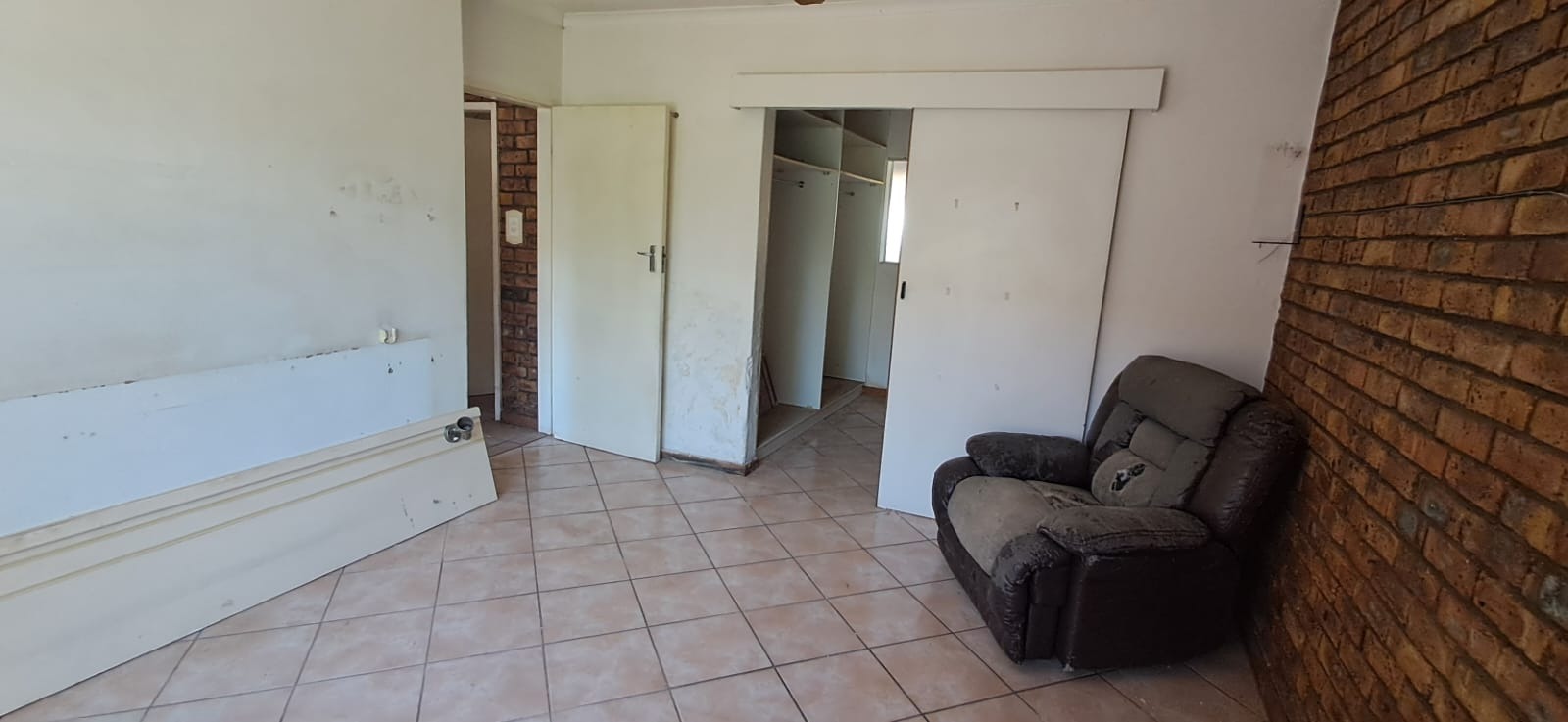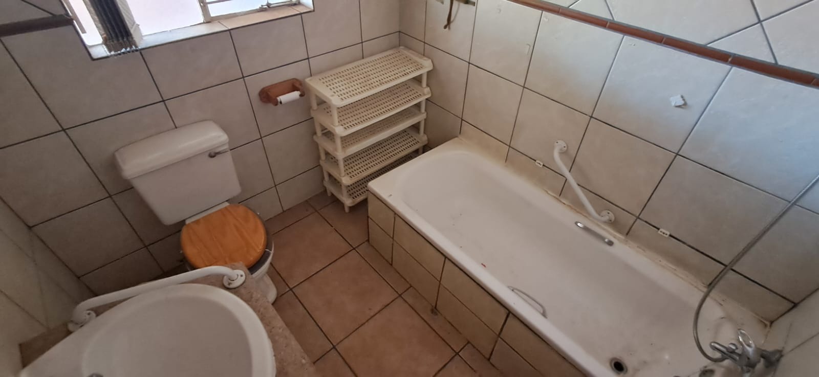 Down a short hallway, you’ll find the bathroom, complete with a bath, basin, toilet, and safety railings—thoughtfully installed for those who need extra support. The main bedroom features a small walk-in closet that could be transformed with some repairs, while the second bedroom includes built-in cupboards.