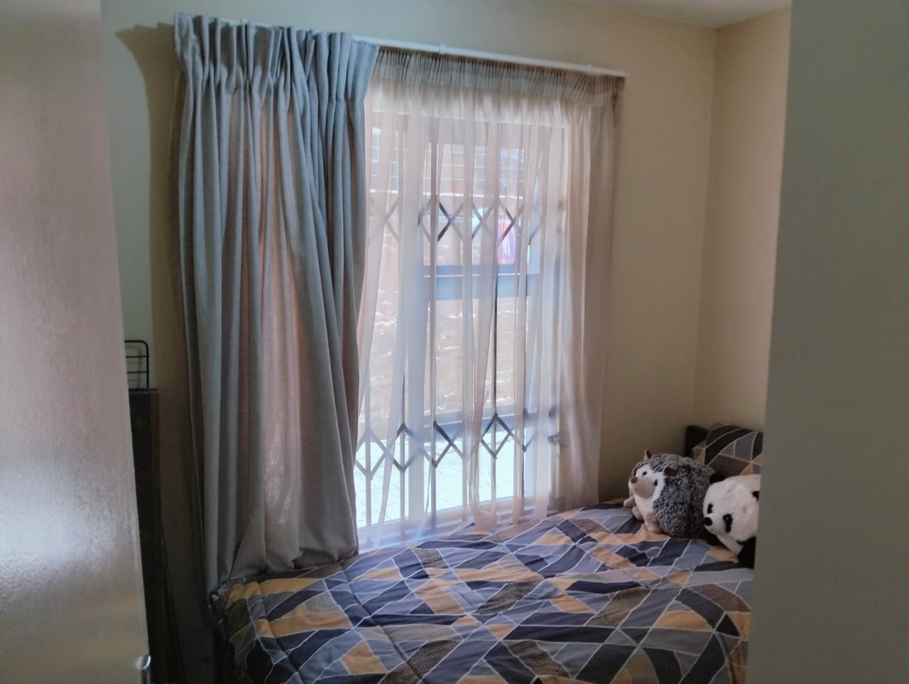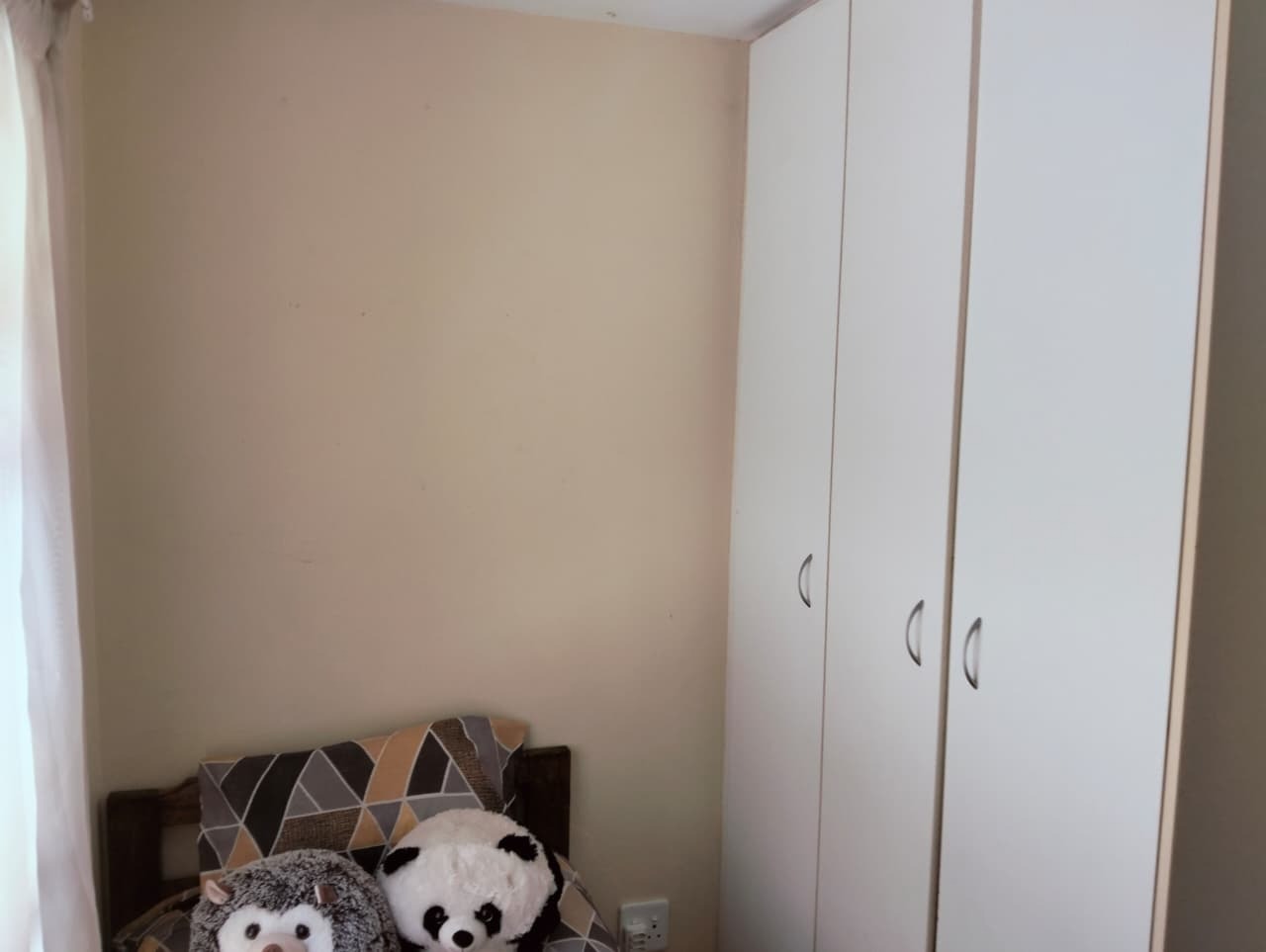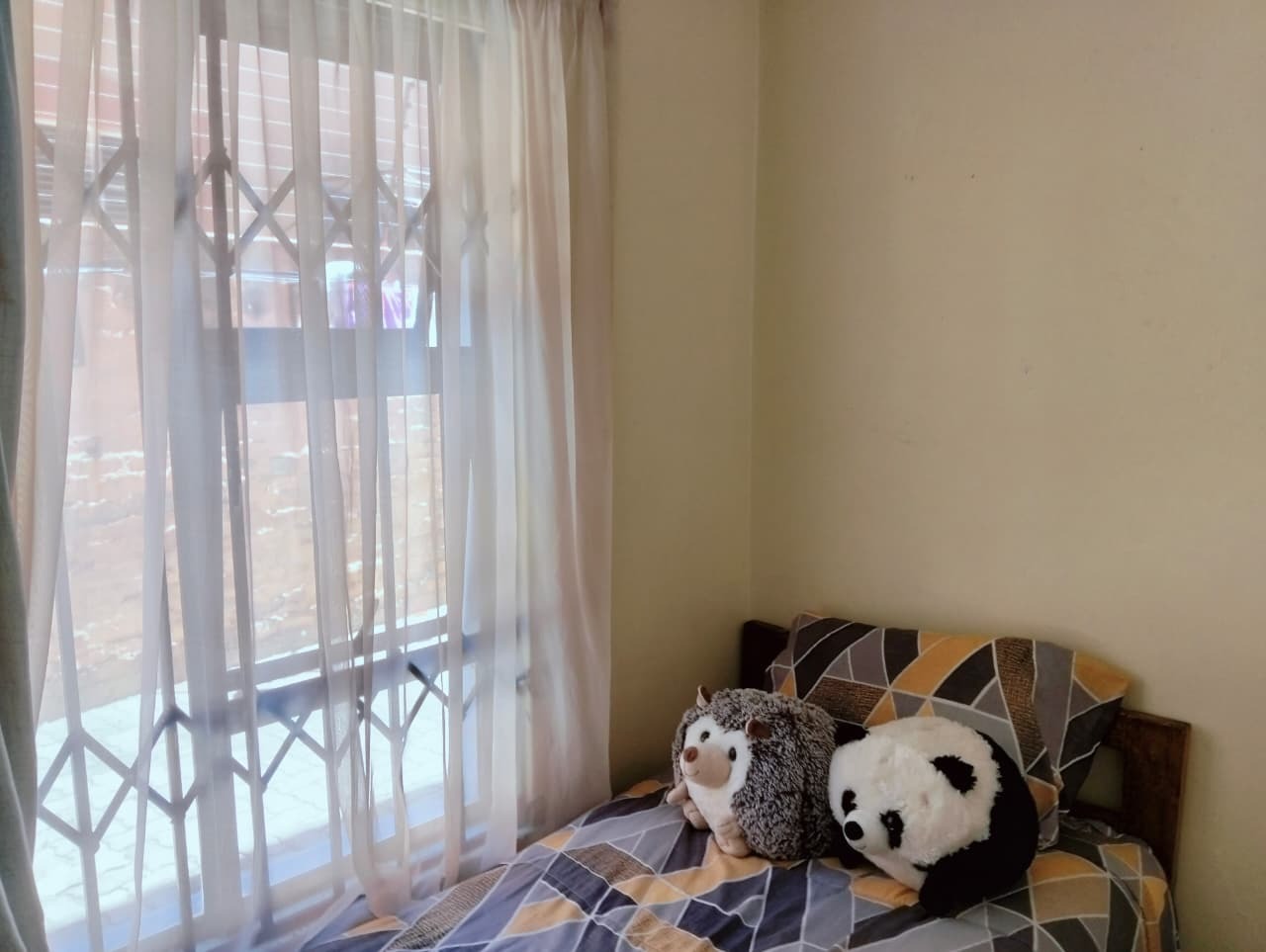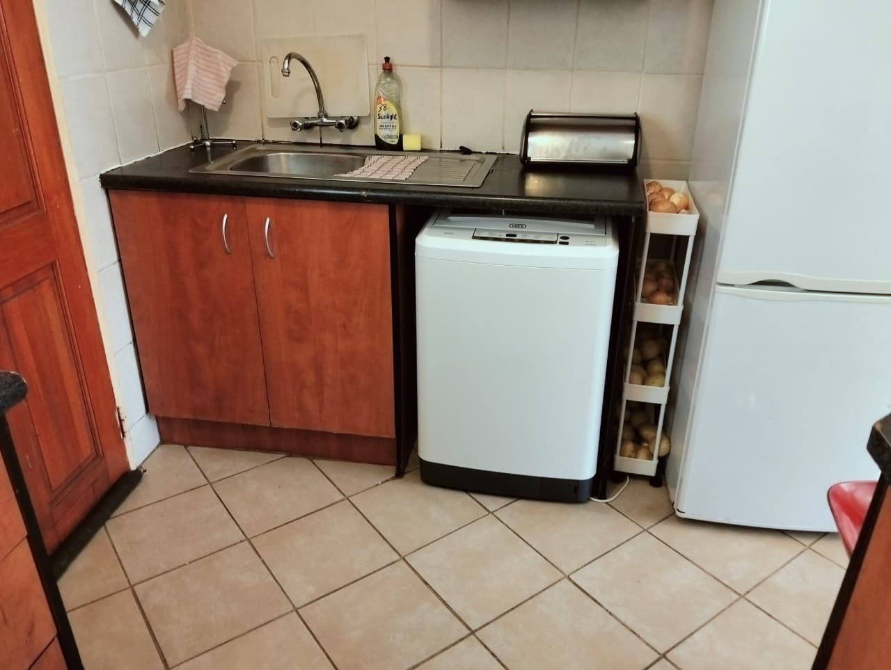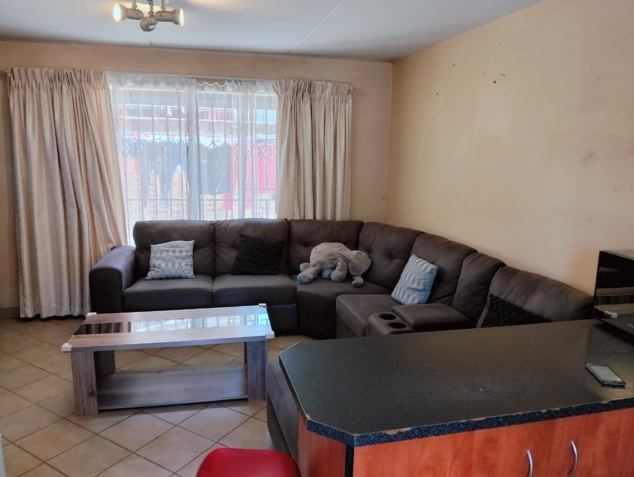 Inside, the residence features a comfortable lounge area with tiled flooring and ample natural light, creating a welcoming atmosphere for relaxation and family time. The functional kitchen boasts a U-shaped layout with dark countertops, wood-look cabinetry, an integrated oven and electric hob, and practical tiled flooring. It offers good counter space and includes provisions for a washing machine and a full-size refrigerator, catering to everyday needs. The open-plan design ensures a seamless flow within the living spaces.