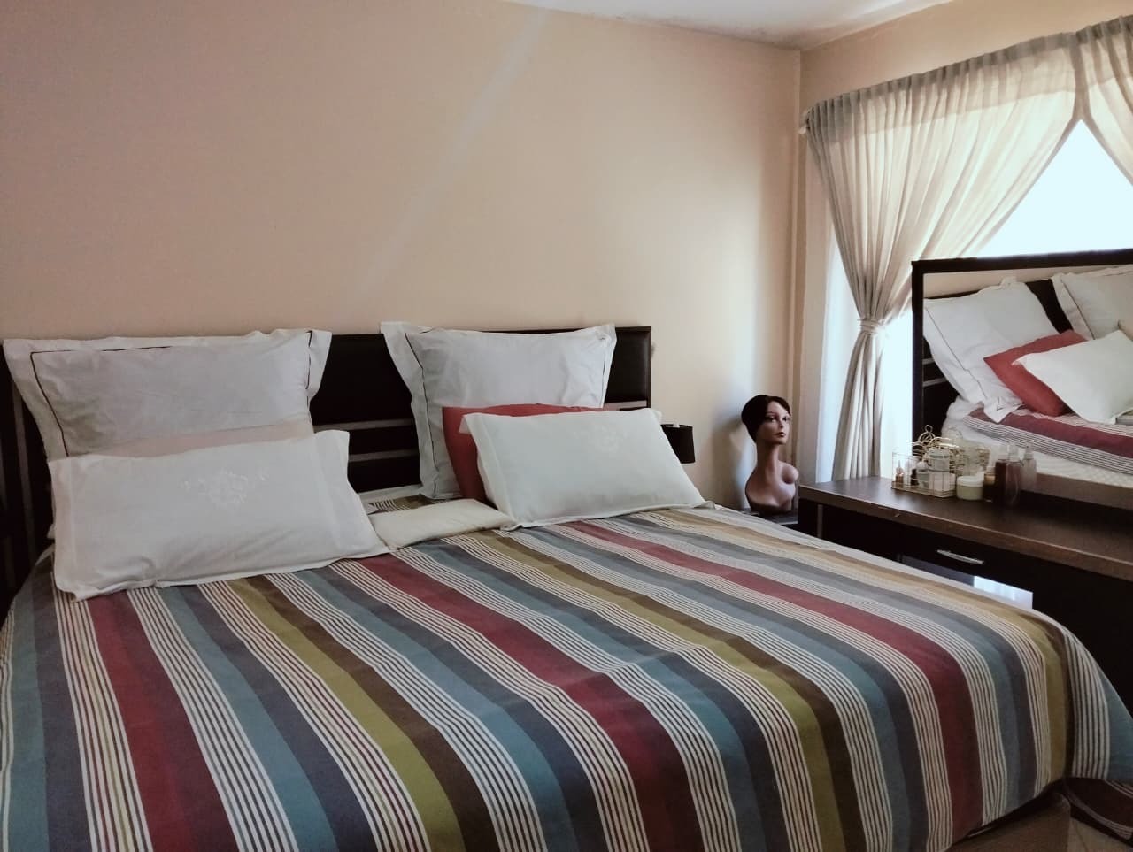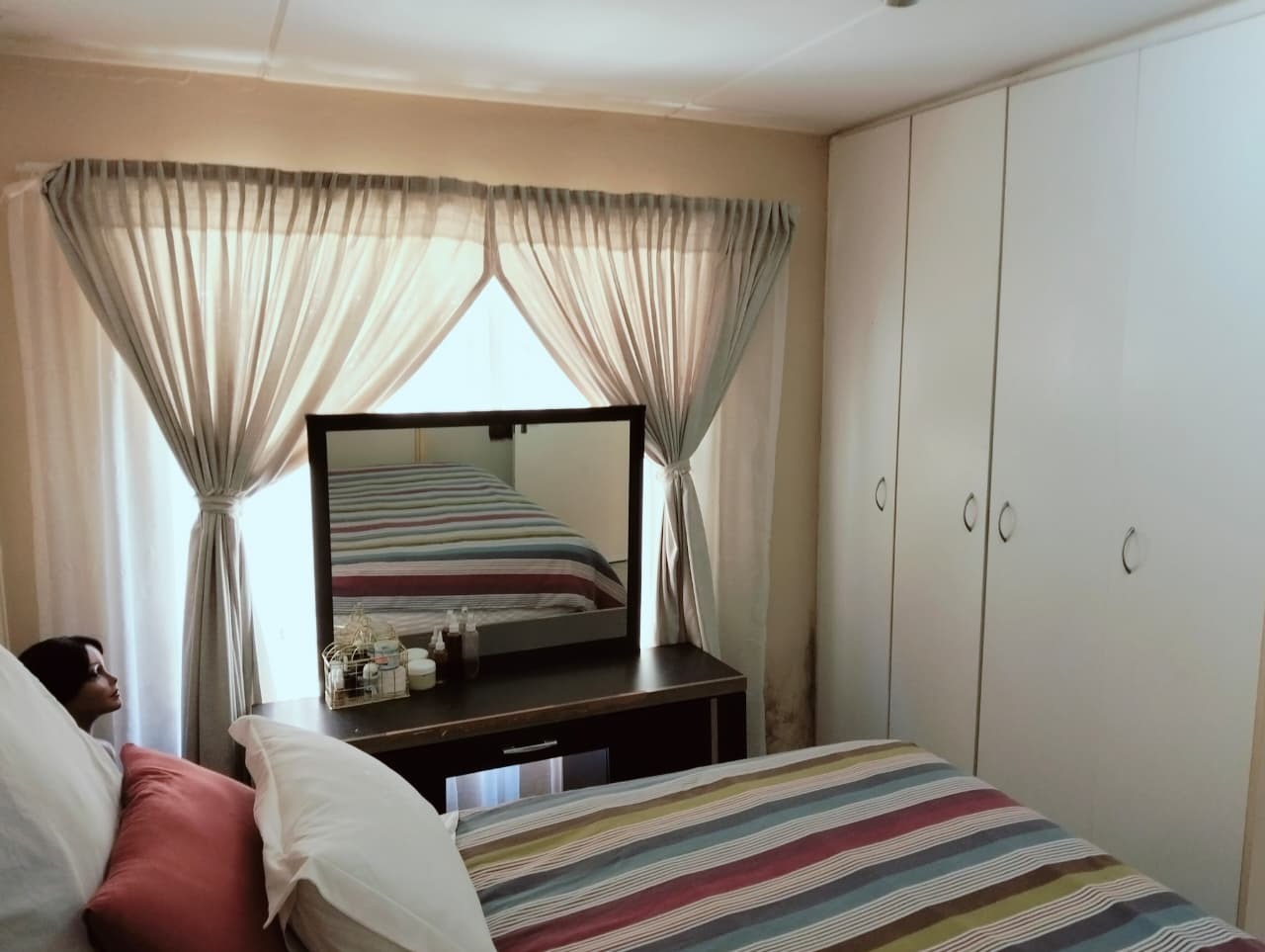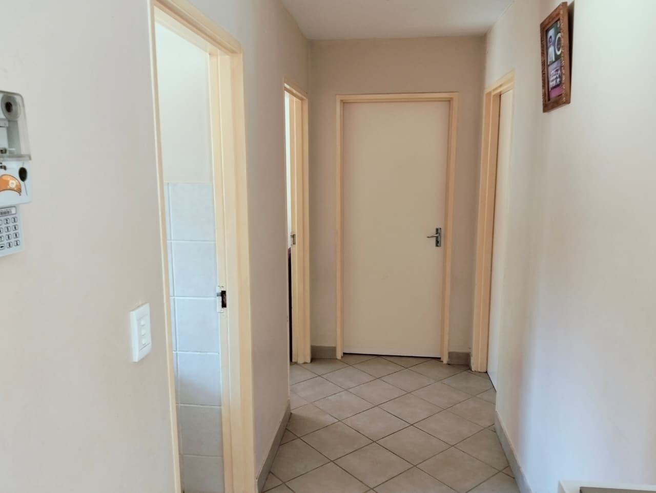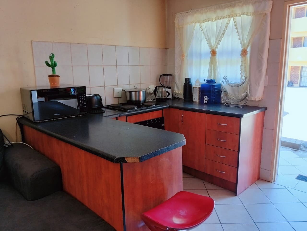 Inside, the residence features a comfortable lounge area with tiled flooring and ample natural light, creating a welcoming atmosphere for relaxation and family time. The functional kitchen boasts a U-shaped layout with dark countertops, wood-look cabinetry, an integrated oven and electric hob, and practical tiled flooring. It offers good counter space and includes provisions for a washing machine and a full-size refrigerator, catering to everyday needs. The open-plan design ensures a seamless flow within the living spaces.