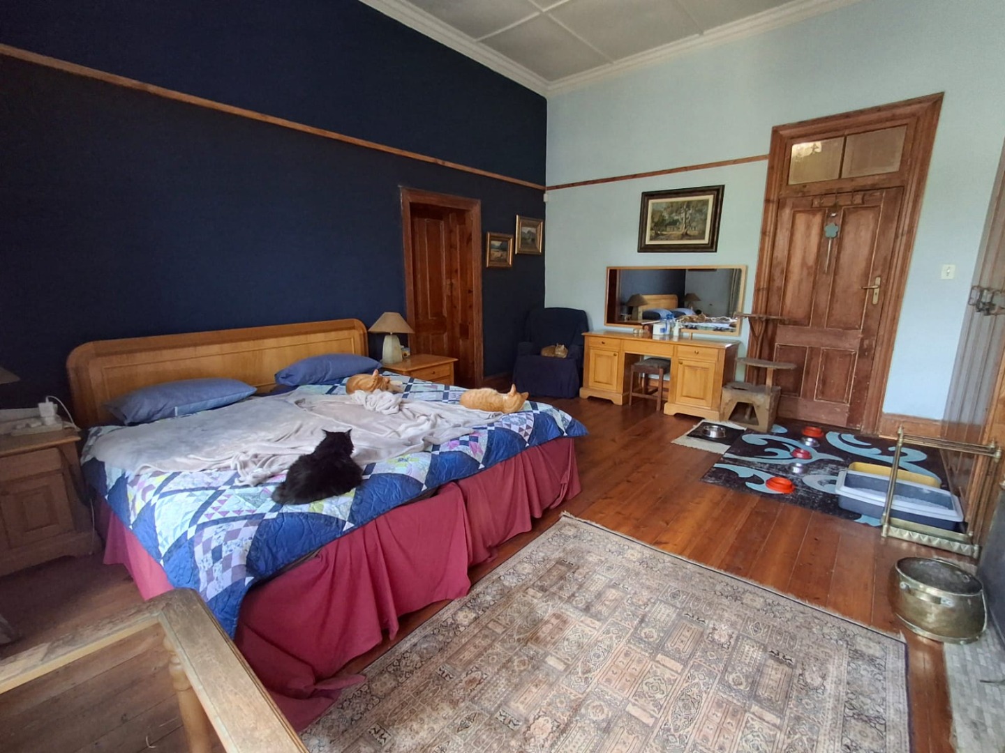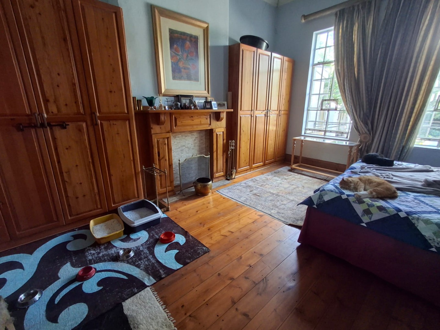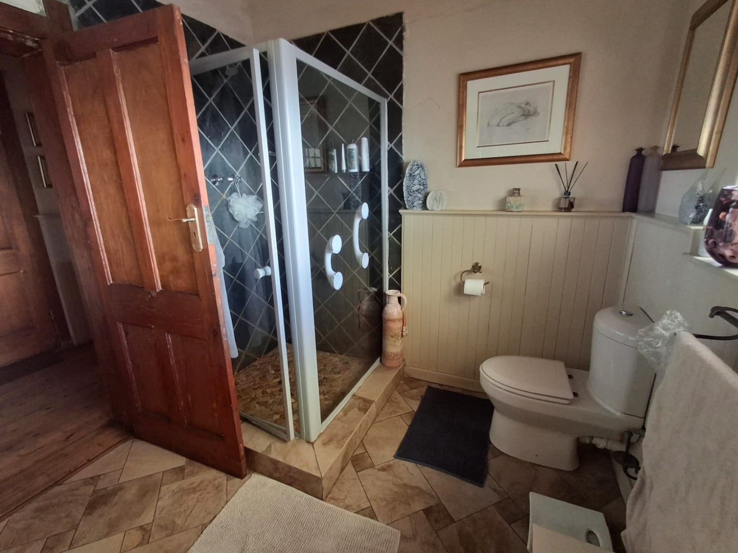 Accommodation in the main house includes three bedrooms. One bedroom features a private lounge or third bedroom with doors opening to a small private garden, complete with a full en-suite bathroom. The second bedroom serves as the main bedroom, offering generous space and built-in cupboards. A full guest bathroom completes the interior.
