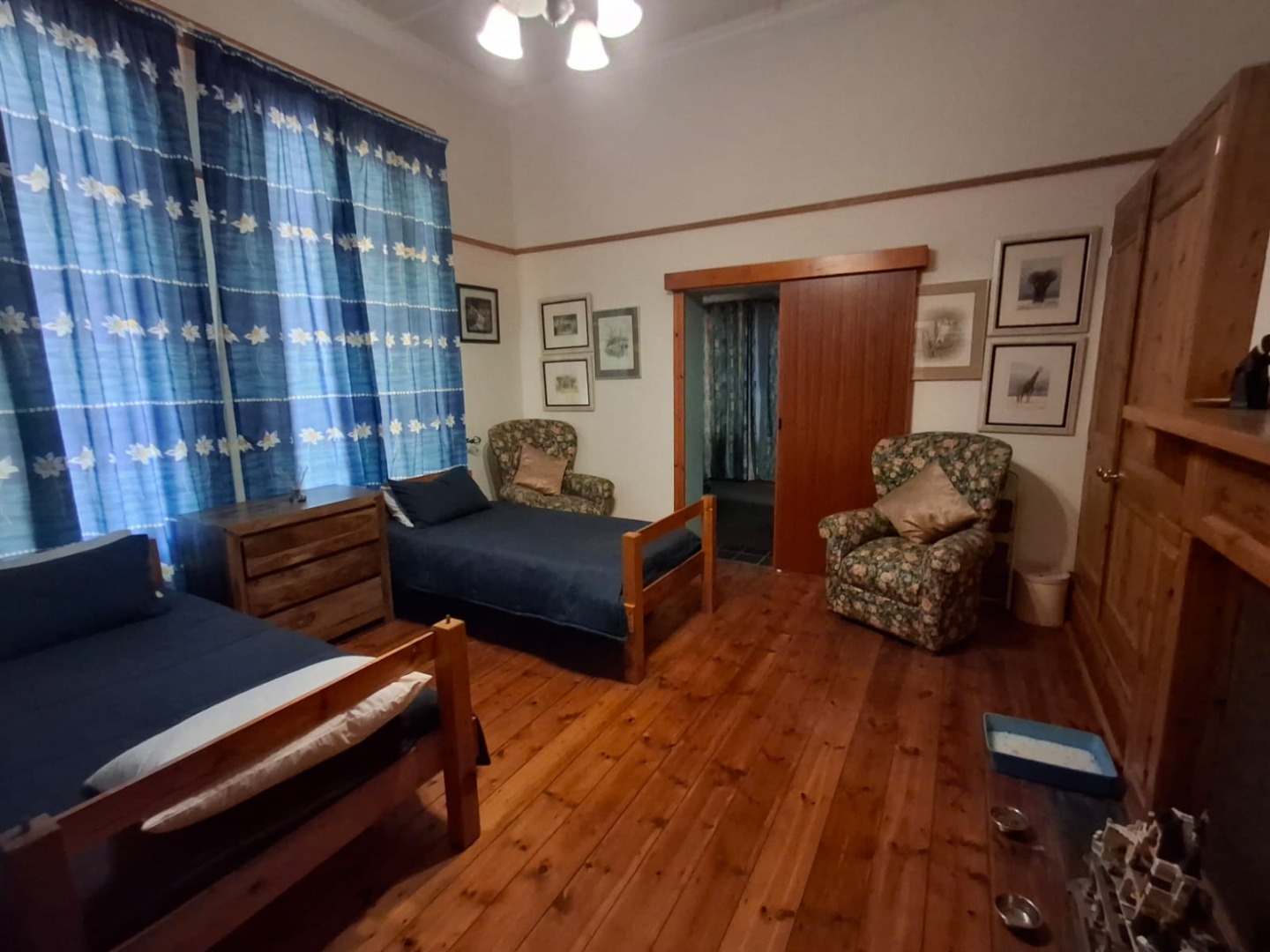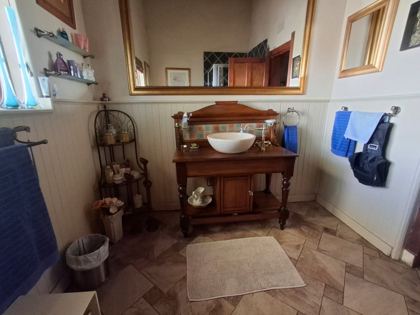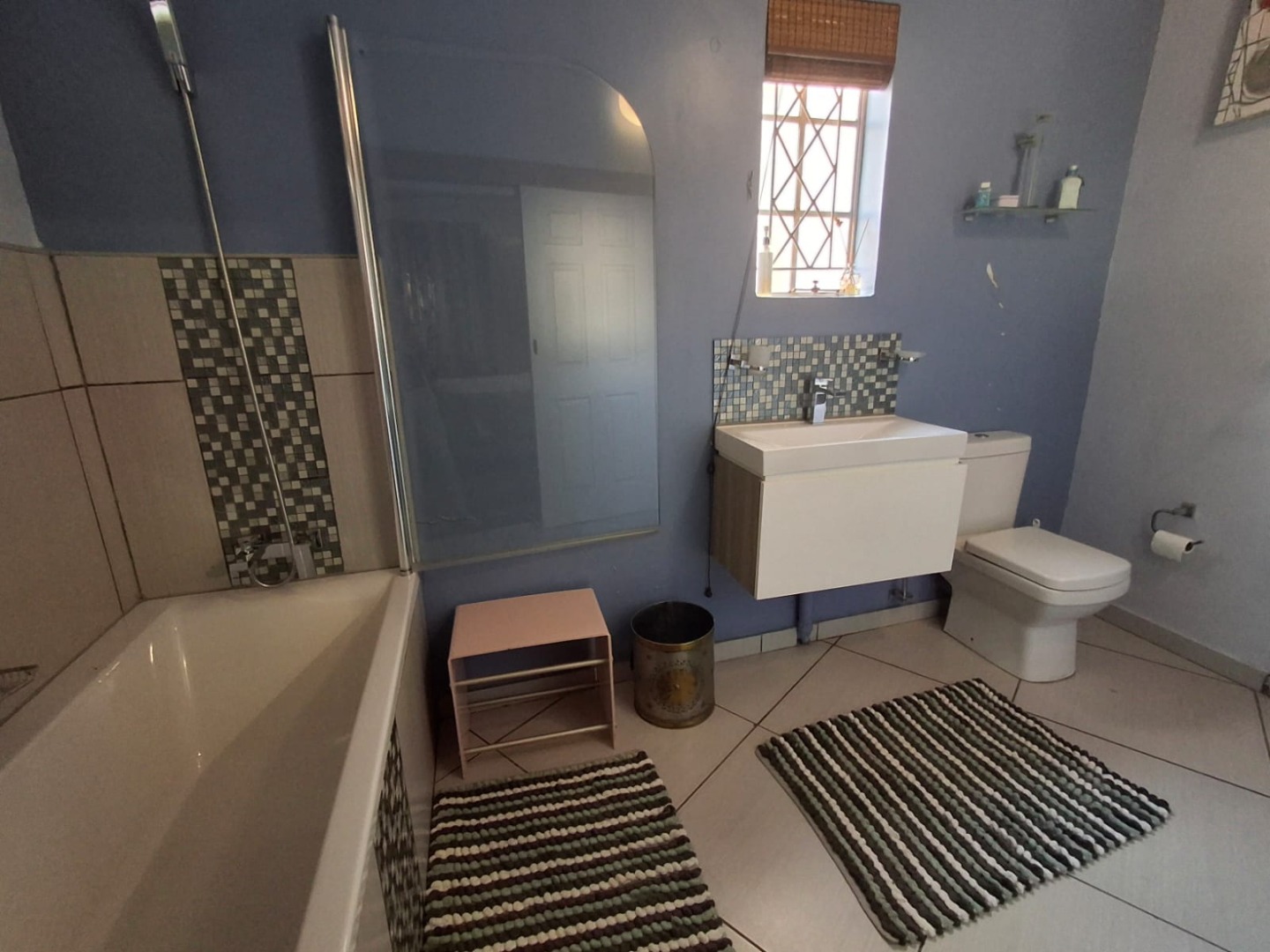 Accommodation in the main house includes three bedrooms. One bedroom features a private lounge or third bedroom with doors opening to a small private garden, complete with a full en-suite bathroom. The second bedroom serves as the main bedroom, offering generous space and built-in cupboards. A full guest bathroom completes the interior.