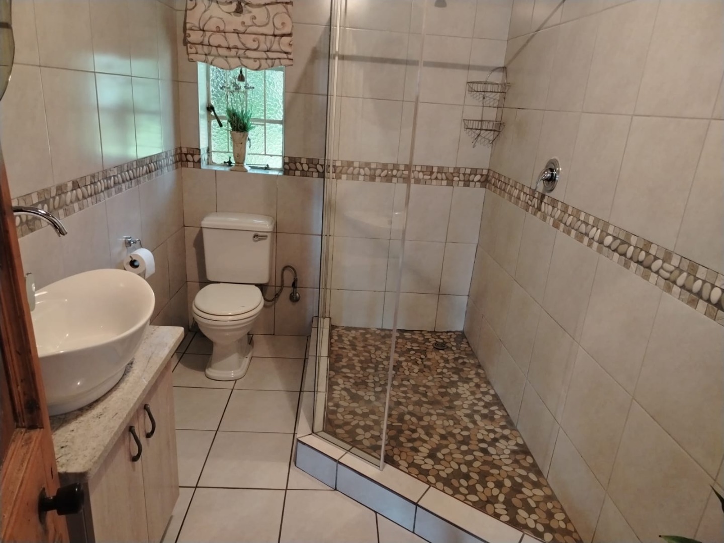Second bathroom with a double shower, basin, and toilet