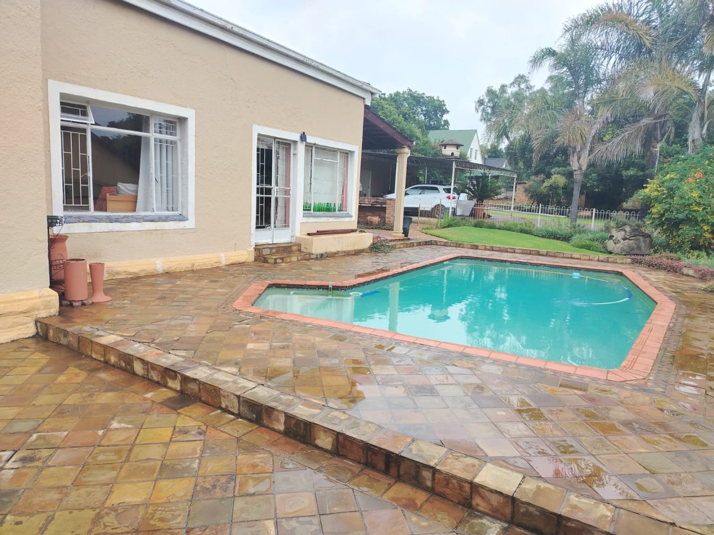 Sparkling swimming pool set in a beautifully paved
