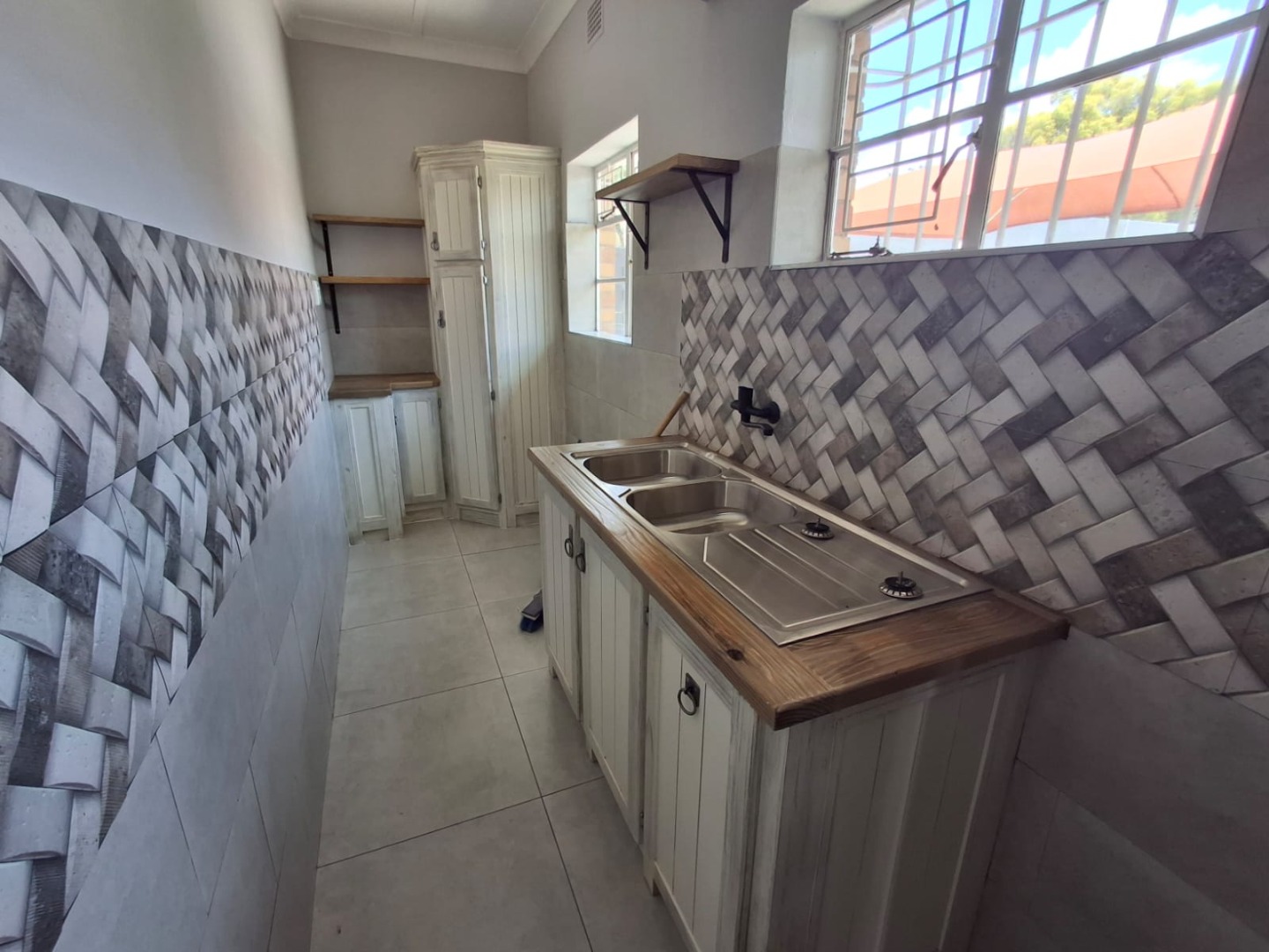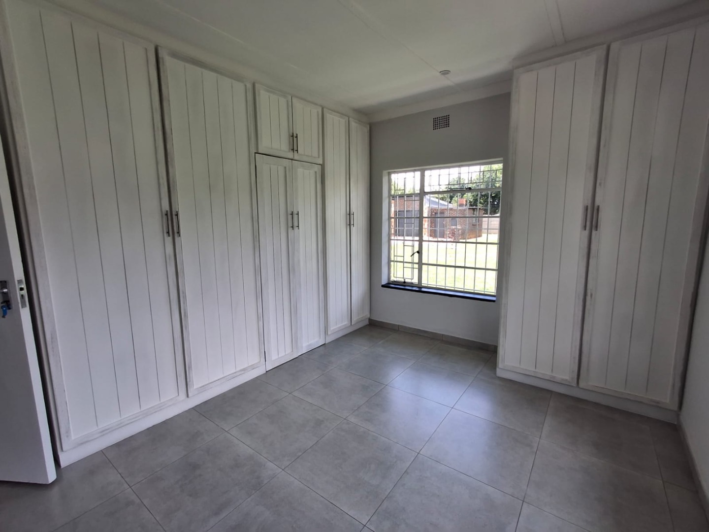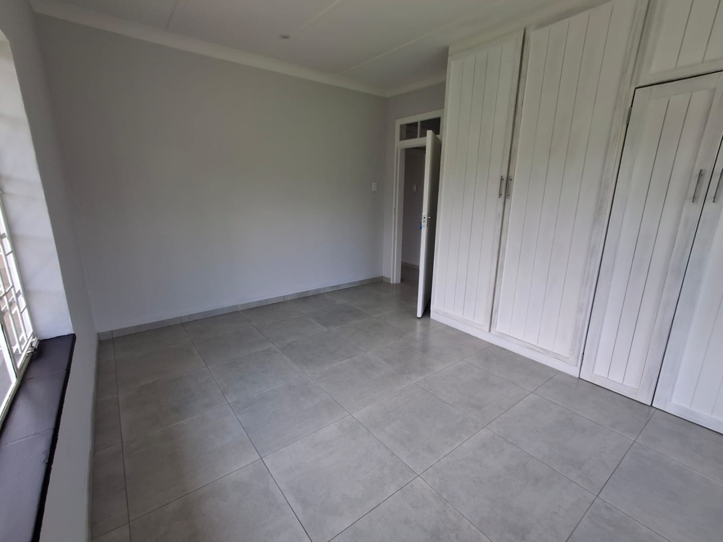 The home offers three well-sized bedrooms, all fitted with built-in cupboards. There are two modern bathrooms, including a full guest bathroom and a main en-suite. A passage cupboard provides additional storage, and the house is tiled throughout for easy maintenance.