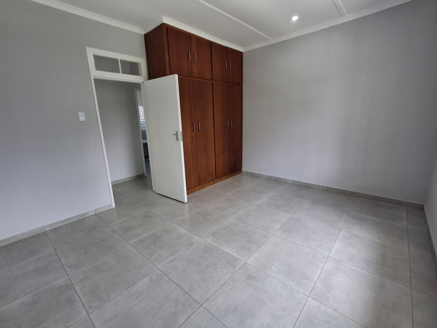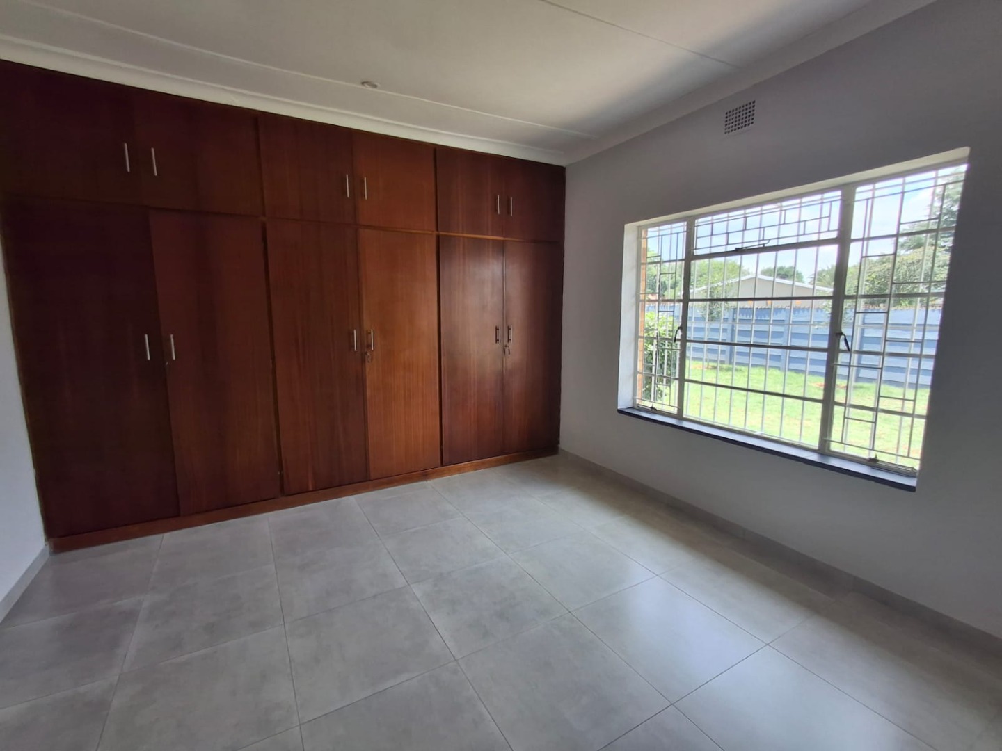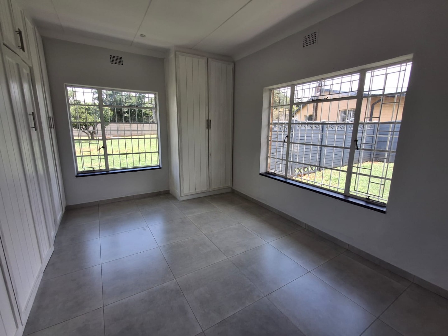 The home offers three well-sized bedrooms, all fitted with built-in cupboards. There are two modern bathrooms, including a full guest bathroom and a main en-suite. A passage cupboard provides additional storage, and the house is tiled throughout for easy maintenance.