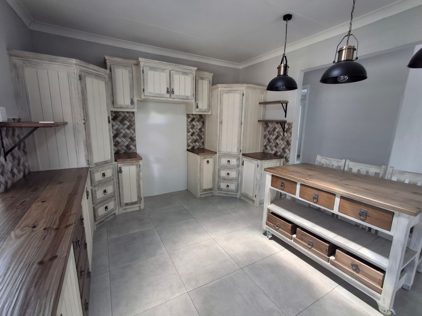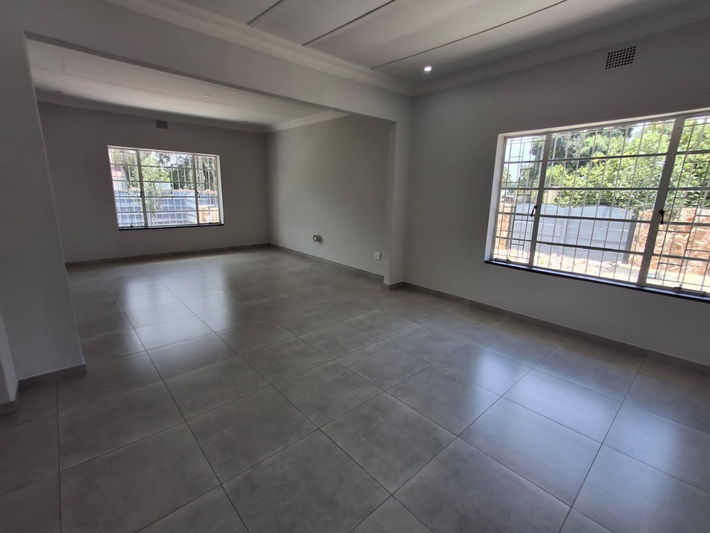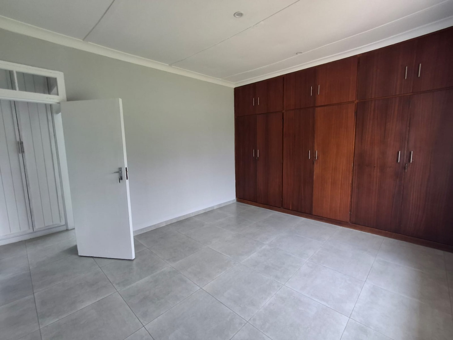 The home offers three well-sized bedrooms, all fitted with built-in cupboards. There are two modern bathrooms, including a full guest bathroom and a main en-suite. A passage cupboard provides additional storage, and the house is tiled throughout for easy maintenance.