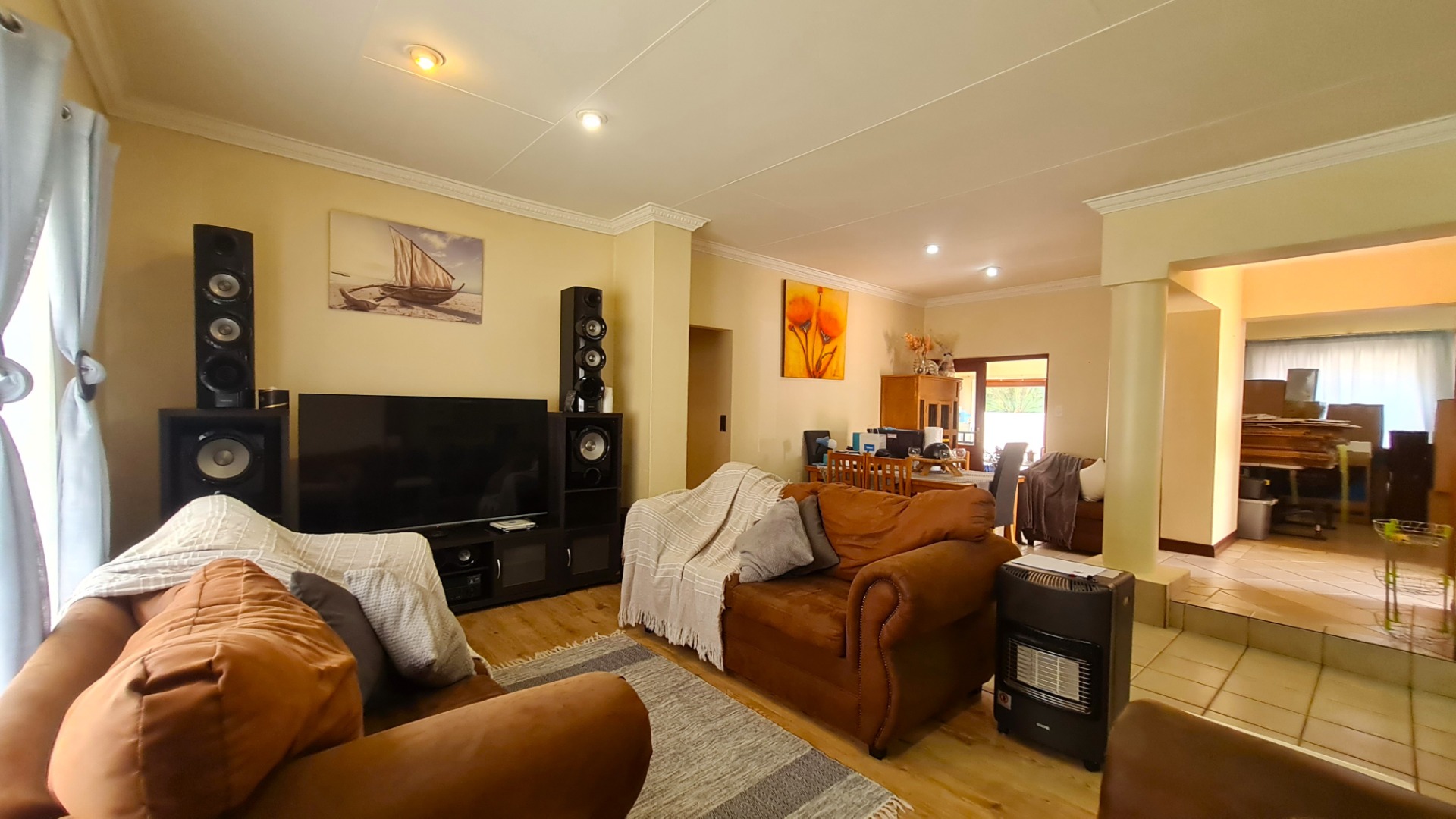 The interior boasts an open-plan design, seamlessly integrating the living, dining, and kitchen areas. The kitchen features rustic-style cabinetry, dark countertops, connection points for appliances, complemented by a practical breakfast bar. A dedicated study offers an ideal space for remote work. A notable braai room, complete with built-in cabinetry and large sliding glass doors, facilitates effortless indoor-outdoor transition.