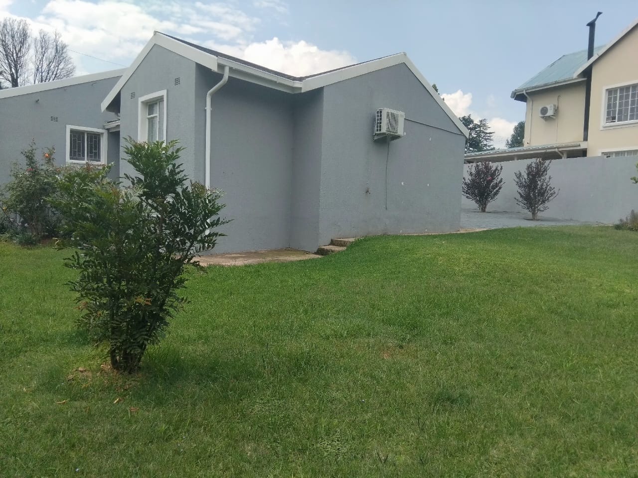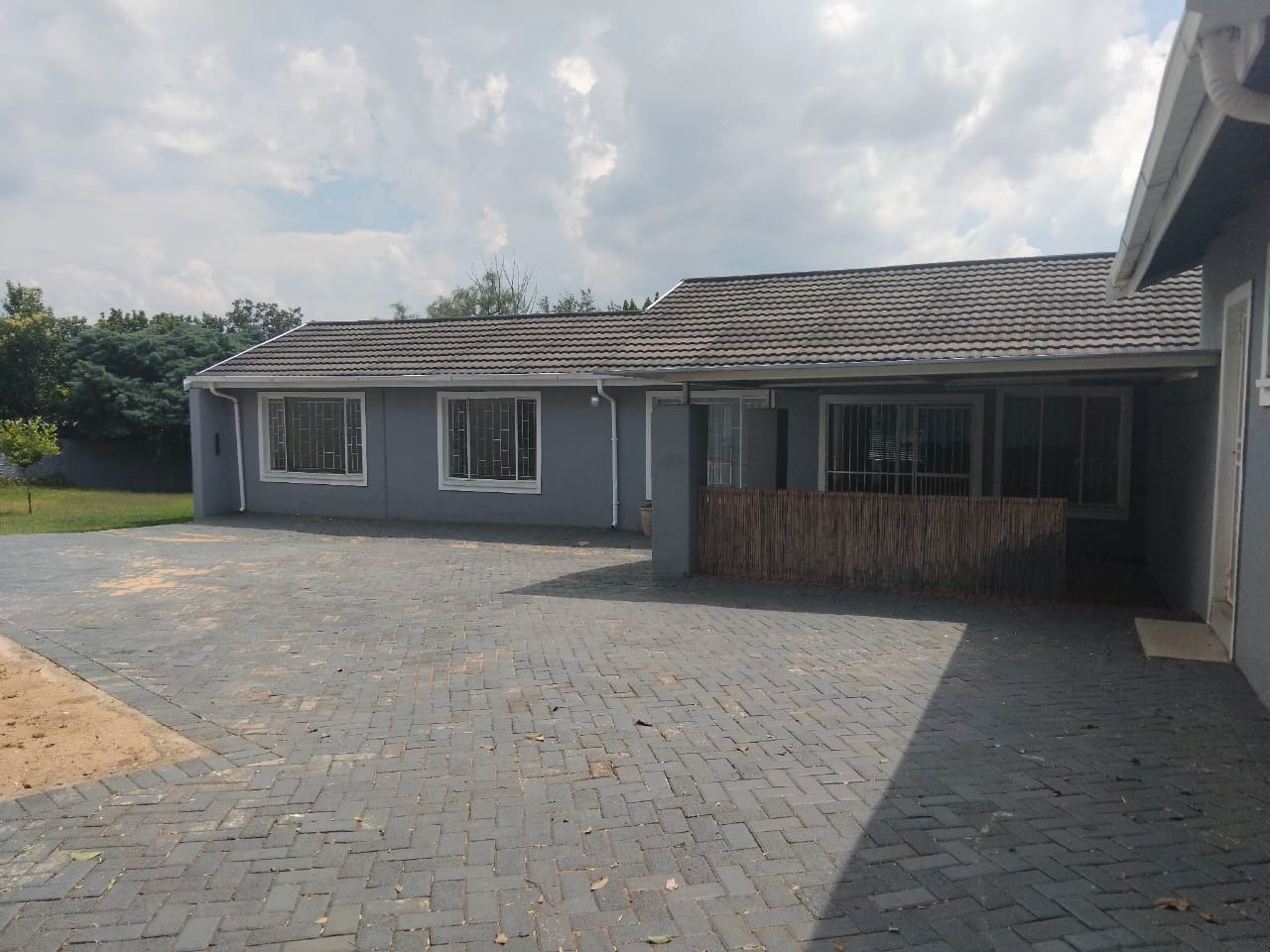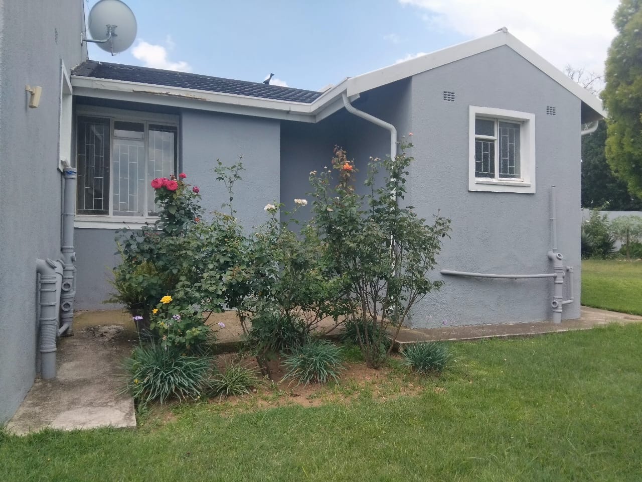 This distinguished residential property, situated in the desirable Jordaan Park, Heidelberg, presents an exceptional opportunity for discerning homeowners. The residence boasts a modern grey exterior complemented by a dark tiled roof, exuding a sophisticated kerb appeal. A meticulously paved pathway leads to a secure, gated entrance, flanked by established landscaping featuring vibrant shrubs and rose bushes, creating an inviting first impression.