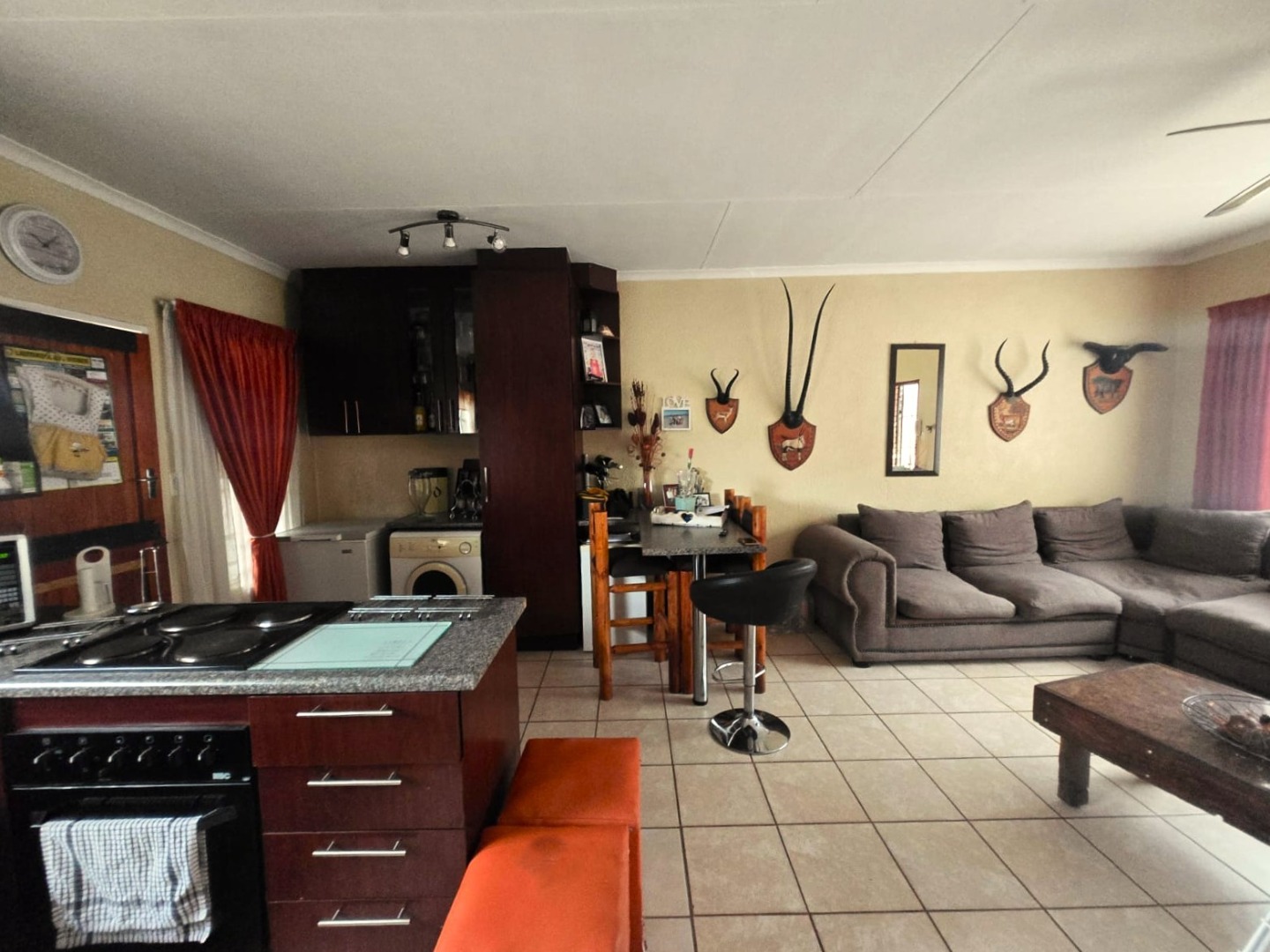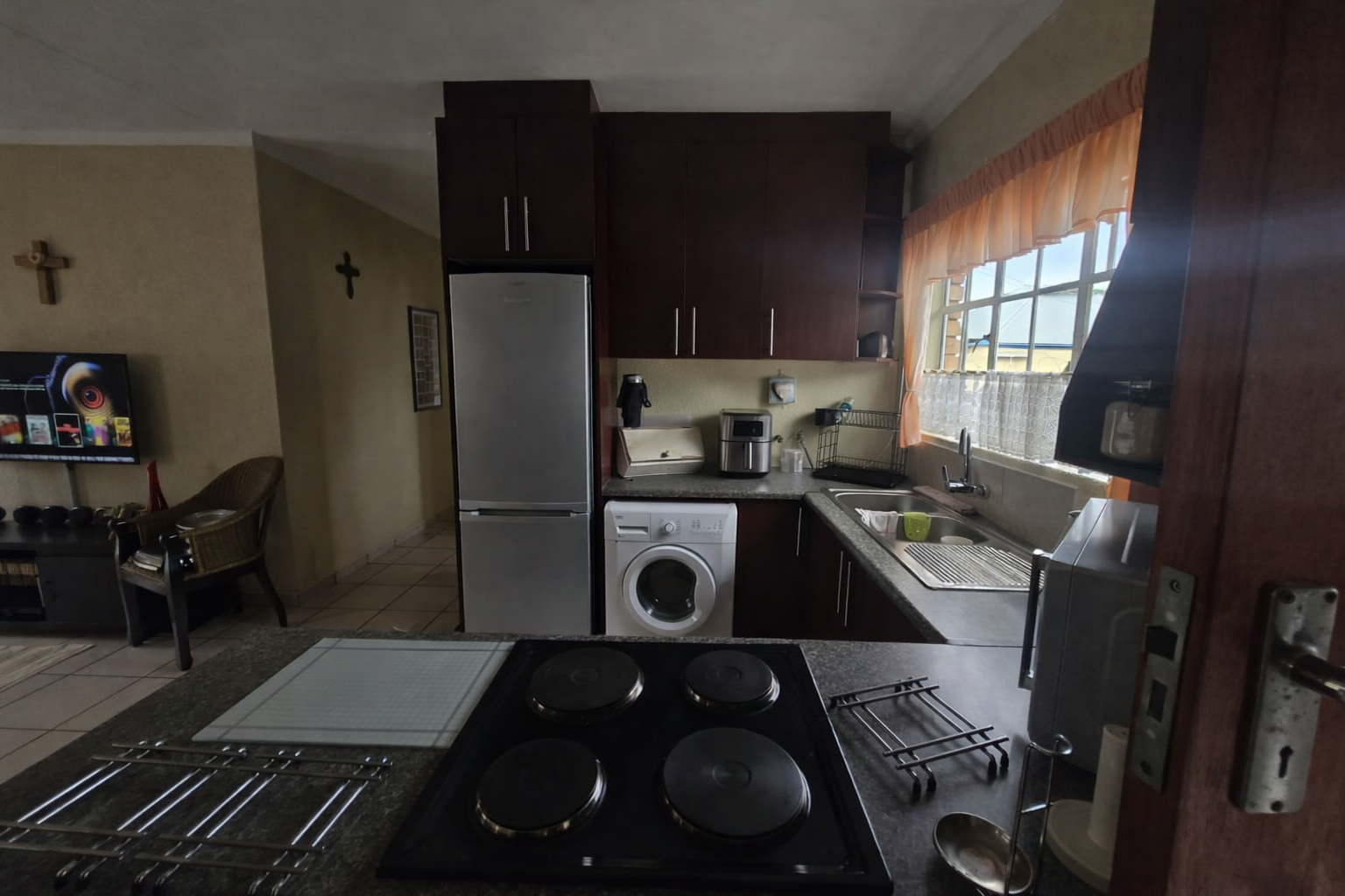Step inside to discover an inviting open-plan living and dining area, characterized by durable tiled flooring throughout. The functional kitchen is well-appointed with dark wood cabinetry, granite countertops, a built-in stove and oven, and integrated spaces for a fridge and washing machine, creating a practical and comfortable environment for daily living.