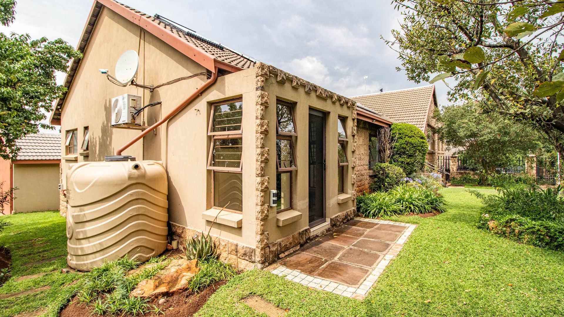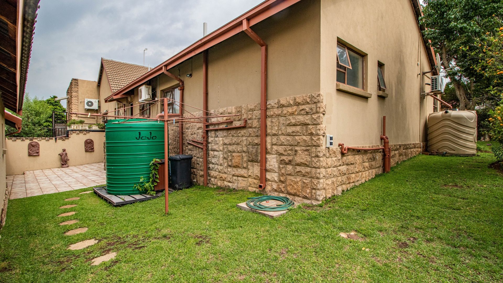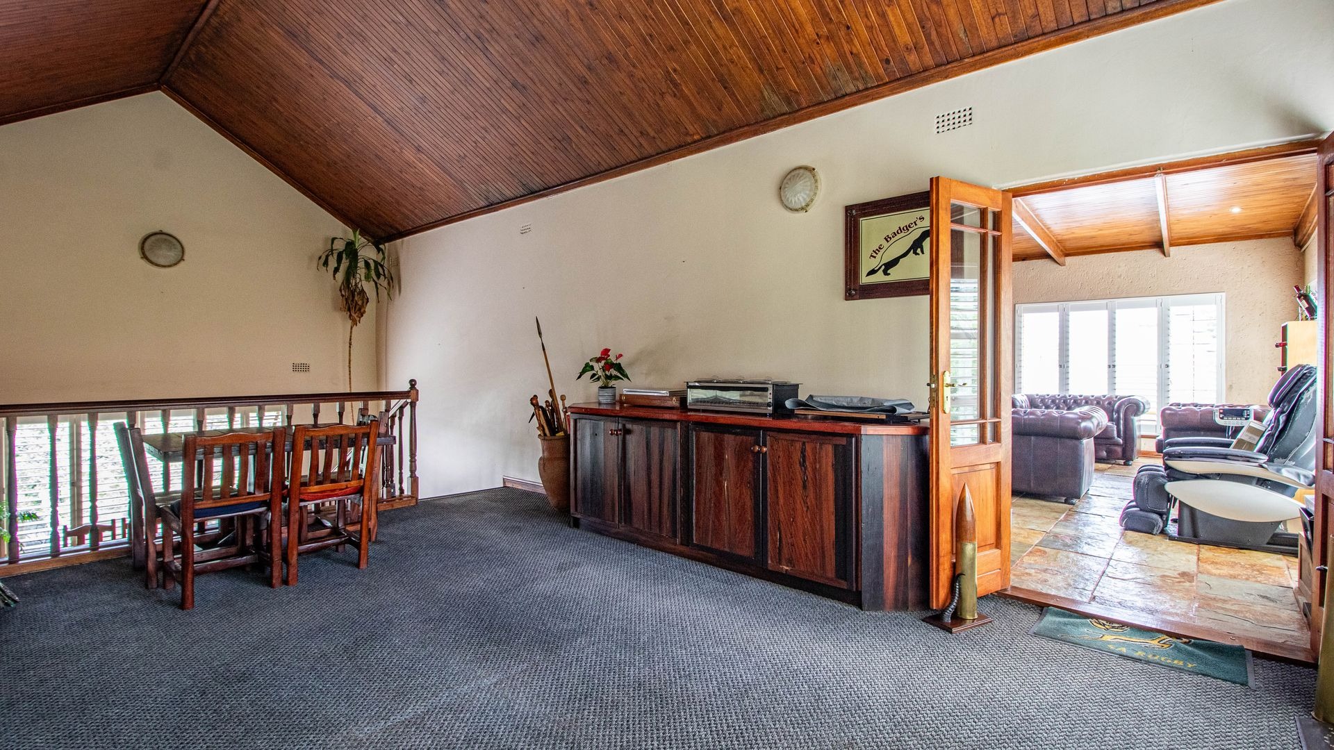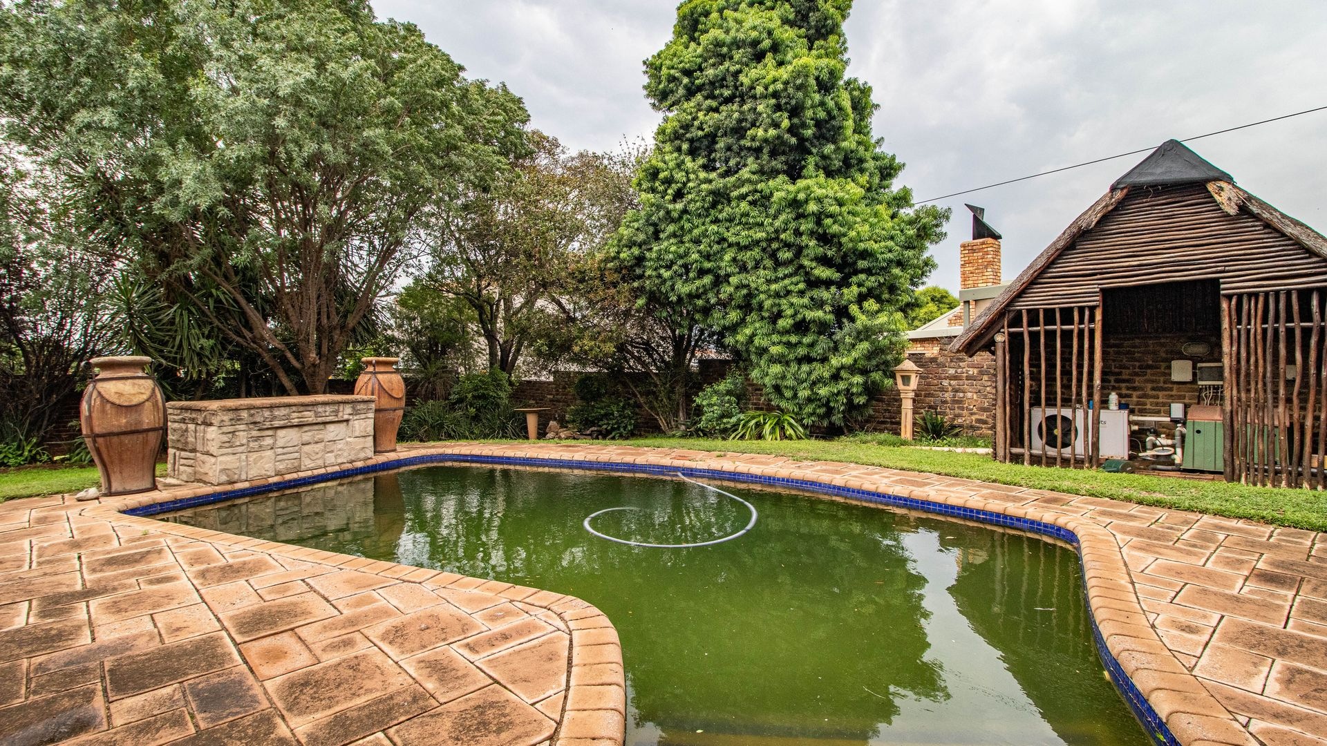 This residence comprises four spacious bedrooms and four bathrooms, two of which are en-suite, ensuring comfort and privacy for all occupants. A dedicated study provides an ideal space for work or quiet contemplation. The property extends its appeal outdoors with a large 1469 sqm erf, featuring a sparkling swimming pool, a lapa, and a built-in braai, perfect for outdoor entertaining. Additional amenities include a built-in bar, air conditioning, along with domestic rooms. The home is further enhanced by modern conveniences such as fibre connectivity, a battery inverter, and water tanks, ensuring a sustainable and connected lifestyle. With three garages and four parking spaces, there is ample room for vehicles. This suburban and country living property offers a blend of comfort, space, and security.