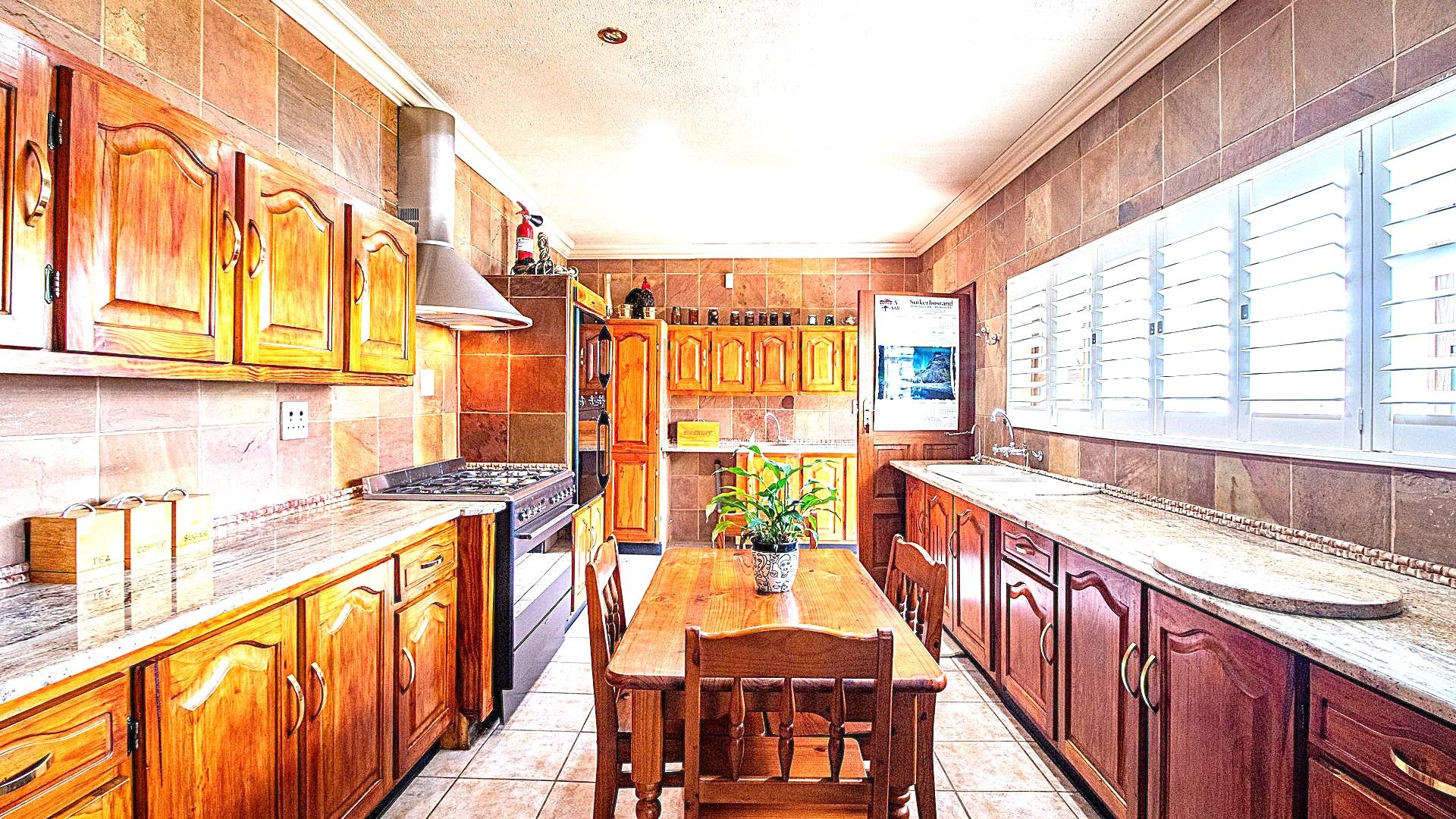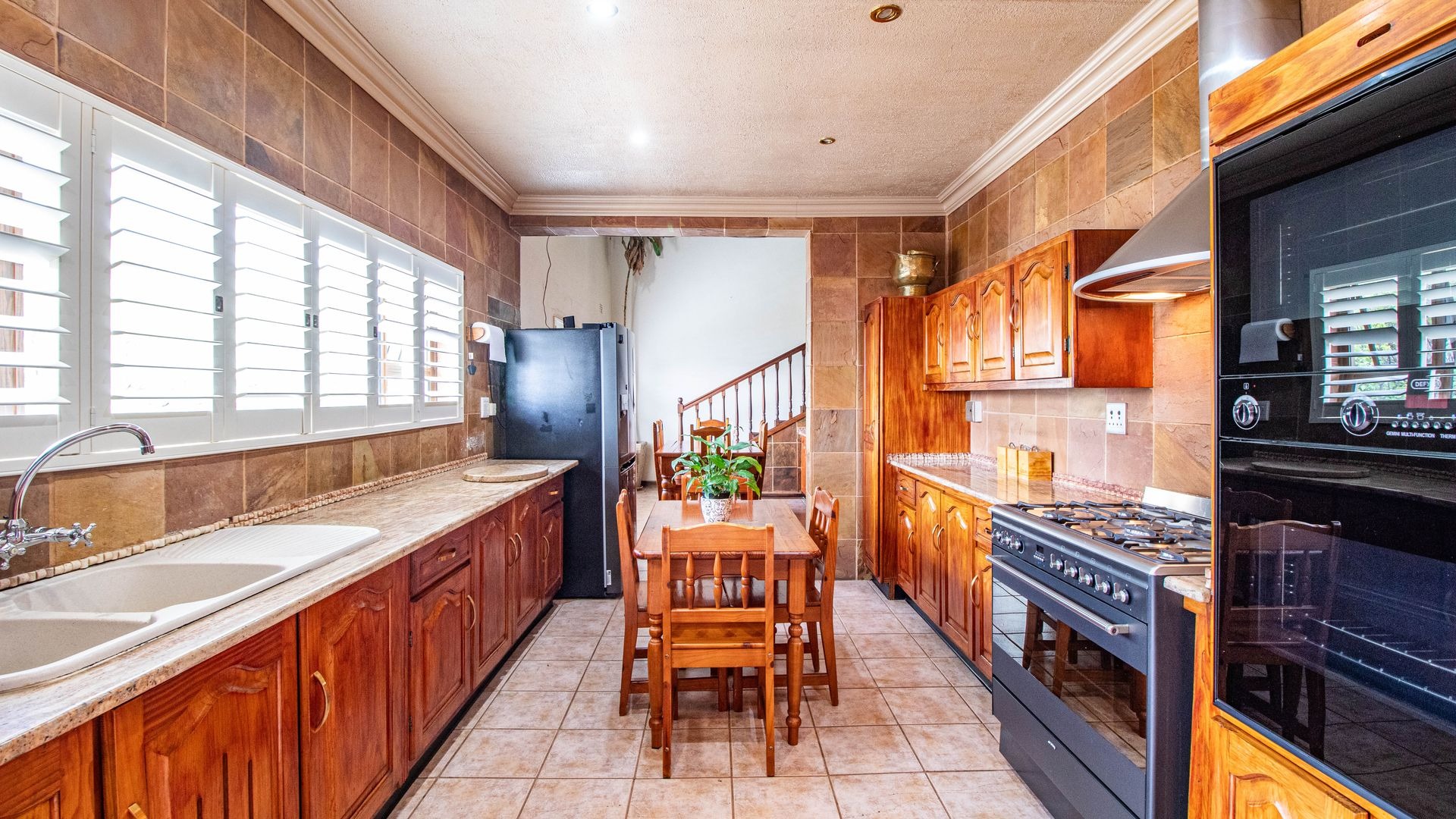 Step inside to an inviting entrance hall featuring a warm wooden ceiling and a classic wooden staircase. The interior offers generous living spaces, including a comfortable lounge, a dedicated dining room, and a family TV room, providing ample room for relaxation and entertainment with its own private bathroom. The well-appointed galley-style kitchen is a highlight, equipped with abundant wooden cabinetry, granite countertops, a gas stove, and a built-in double oven. It also features an integrated dining area and multiple windows with louvered shutters for natural light. A separate laundry room and storage facilities add to the home's practicality.