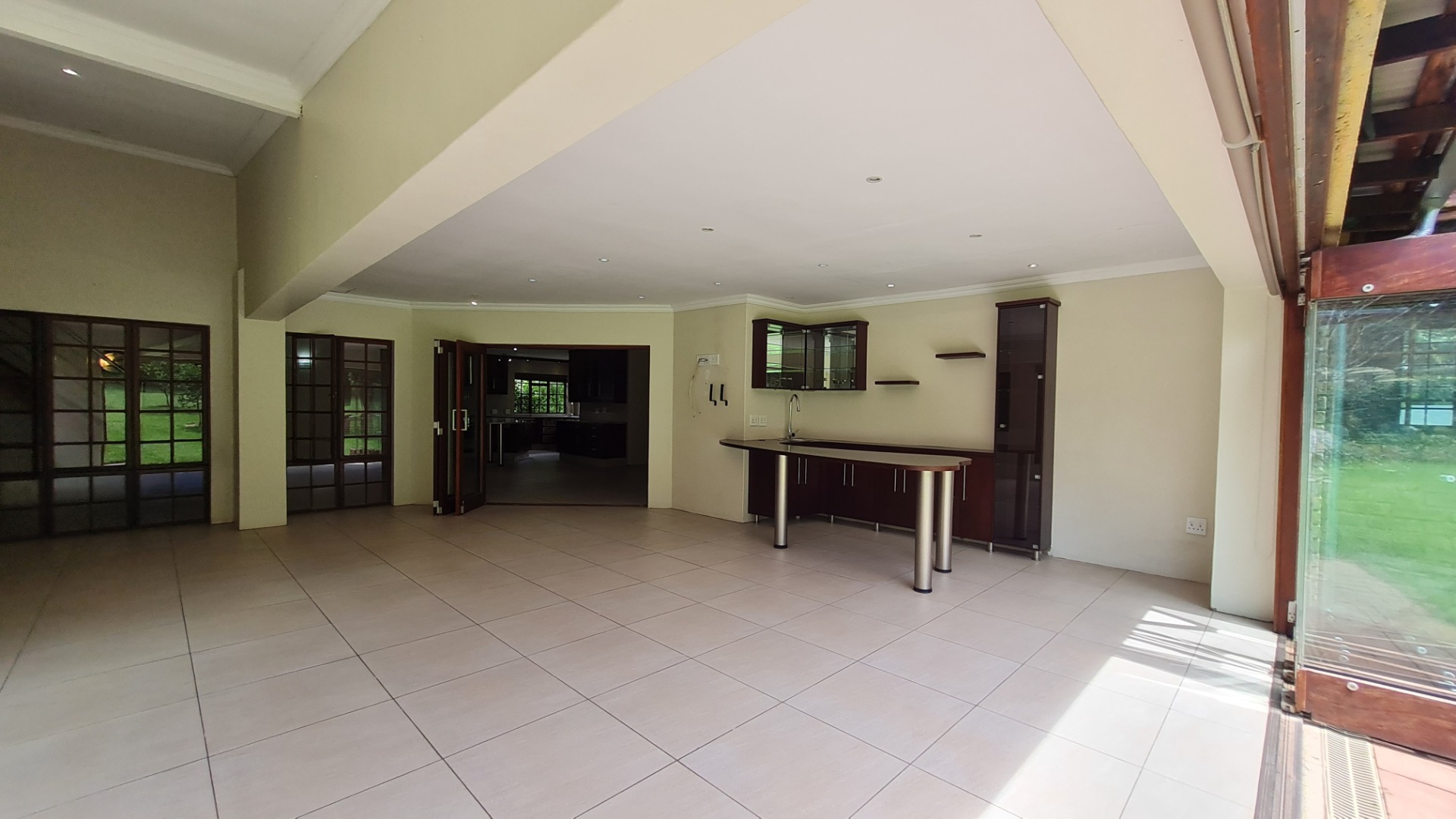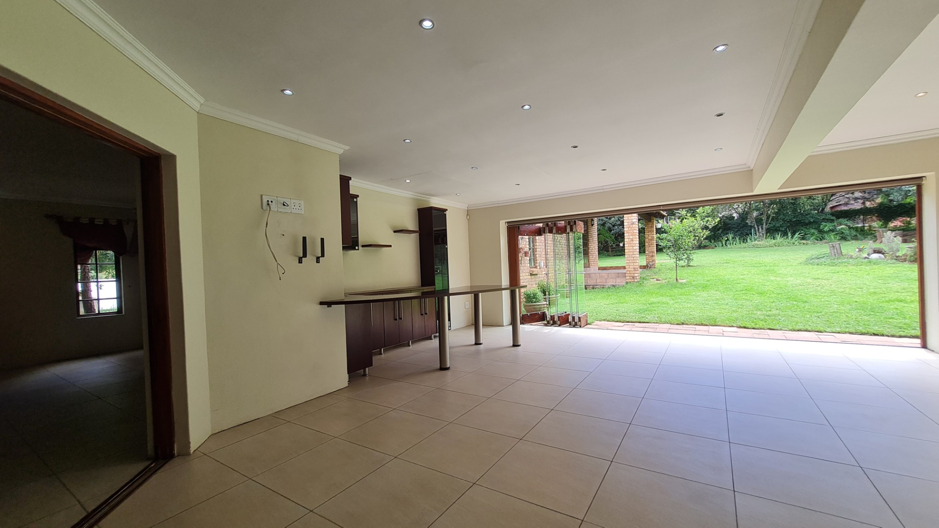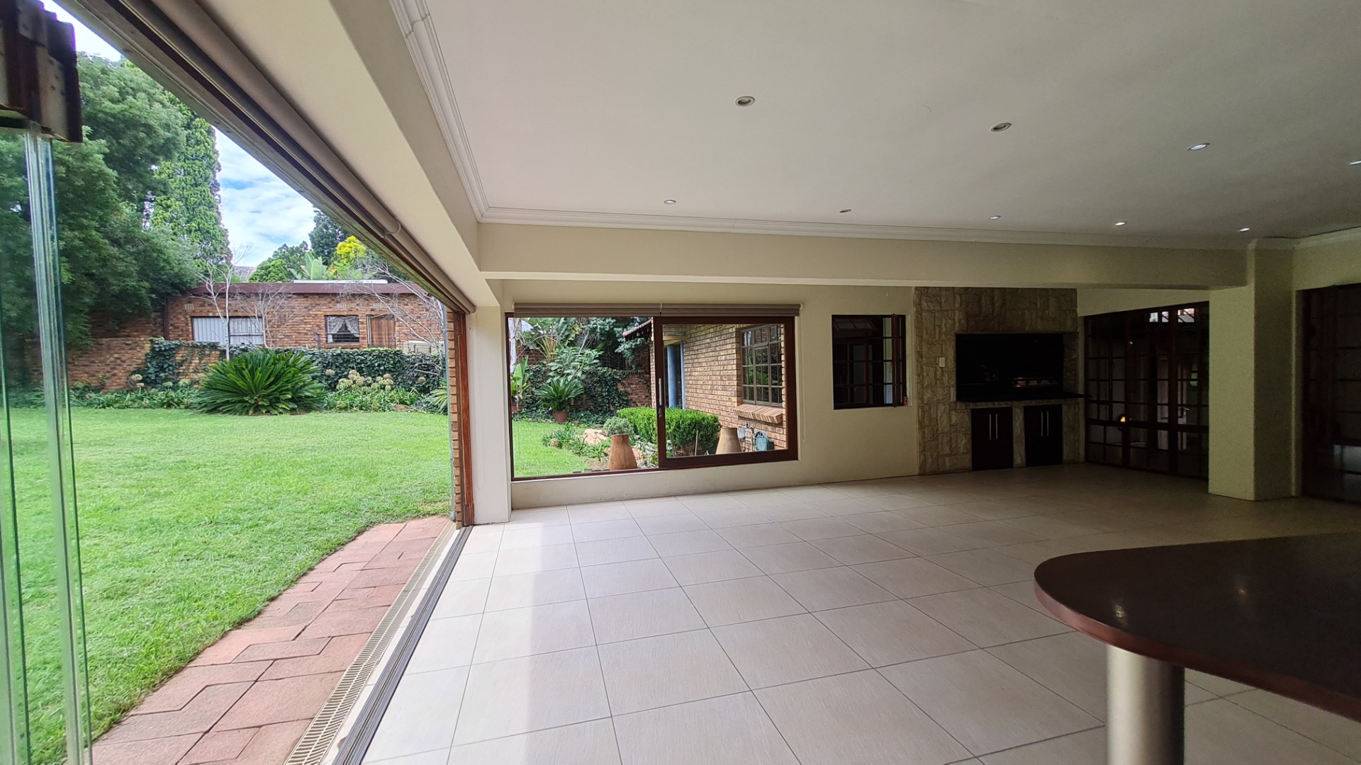 Delight in endless gatherings with loved ones in the expansive braai room, featuring a stylish built-in bar, both gas and wood-burning braai options, and elegant glass and wood stacking doors that open to a tranquil garden paradise.