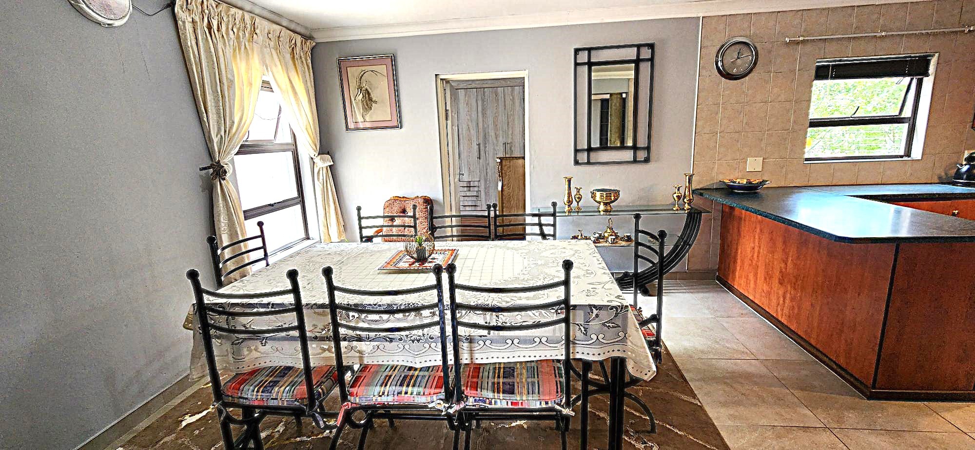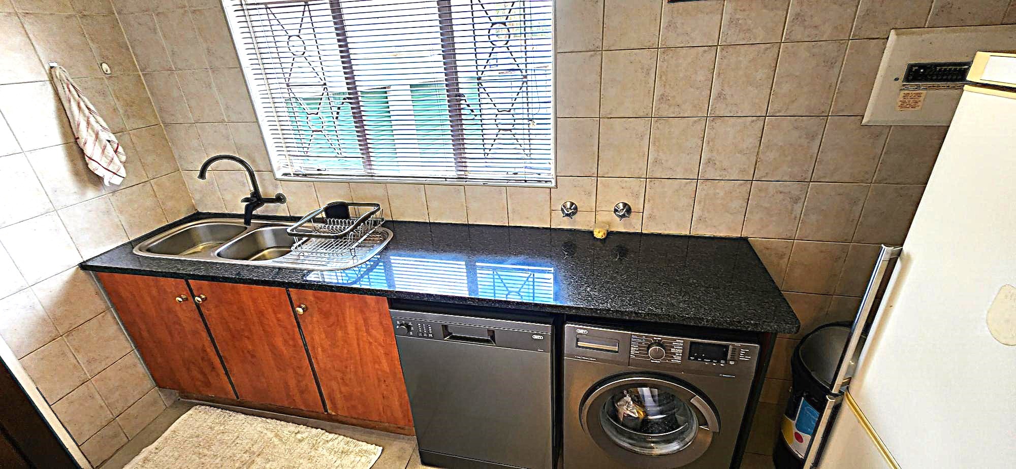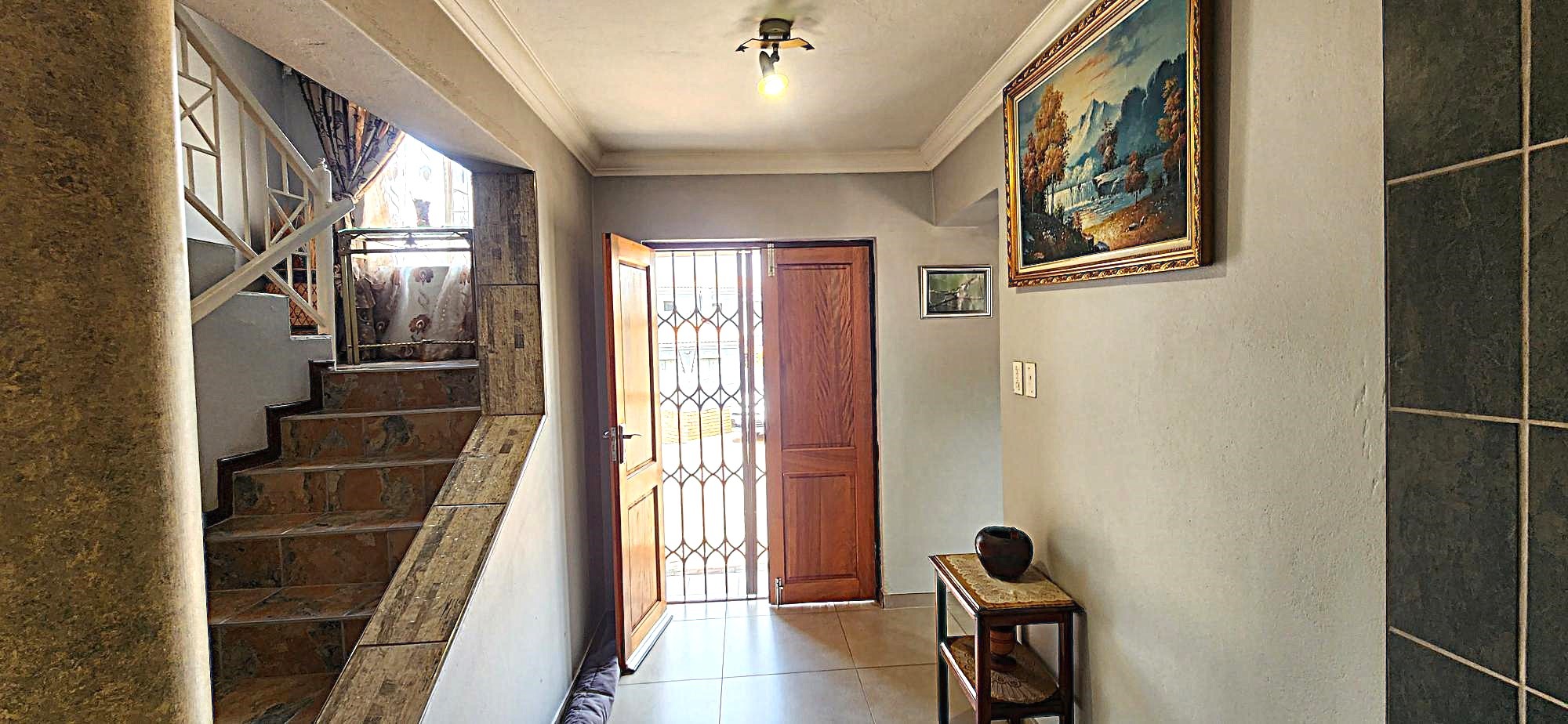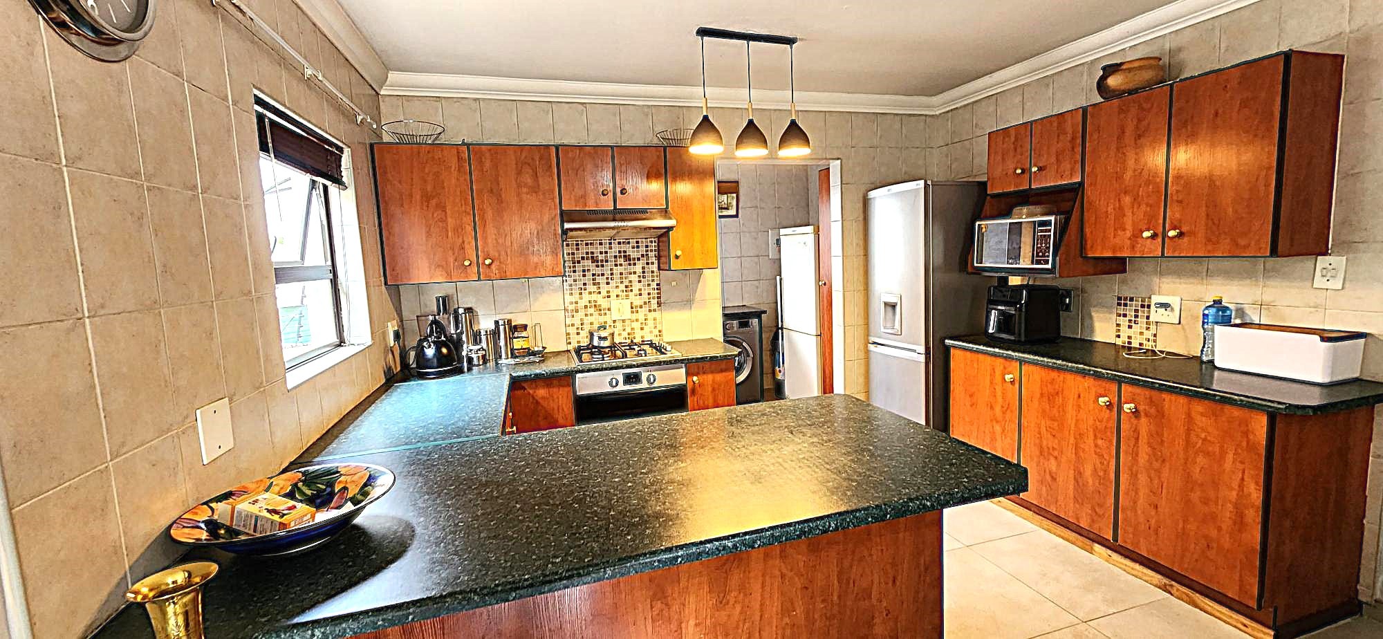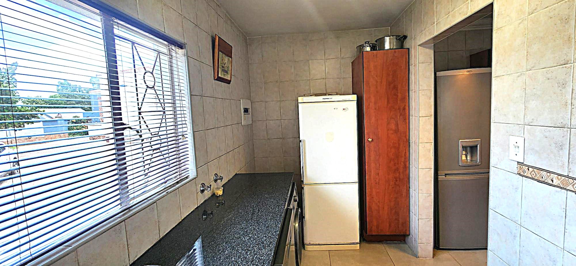 Security is a priority, with features such as burglar bars, a security gate, and spiked boundary walls, providing peace of mind. The home also embraces sustainability with a solar geyser and water tanks, contributing to reduced utility costs. Fibre connectivity is available, ensuring high-speed internet access for work and entertainment.