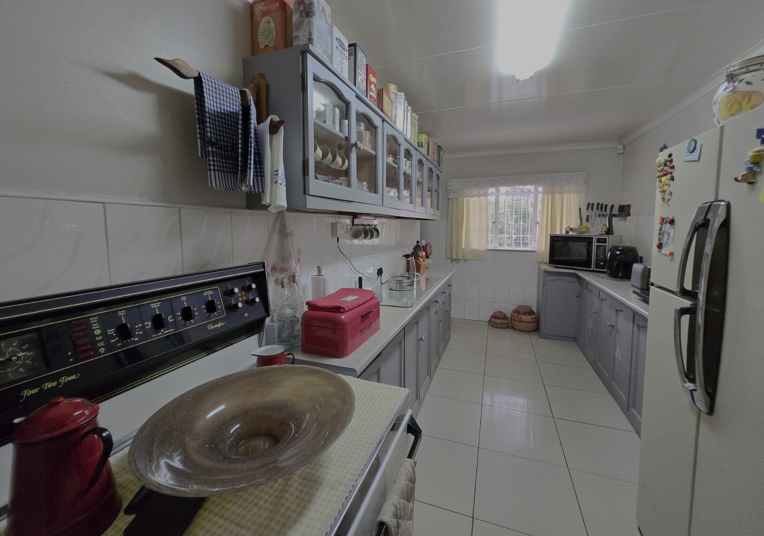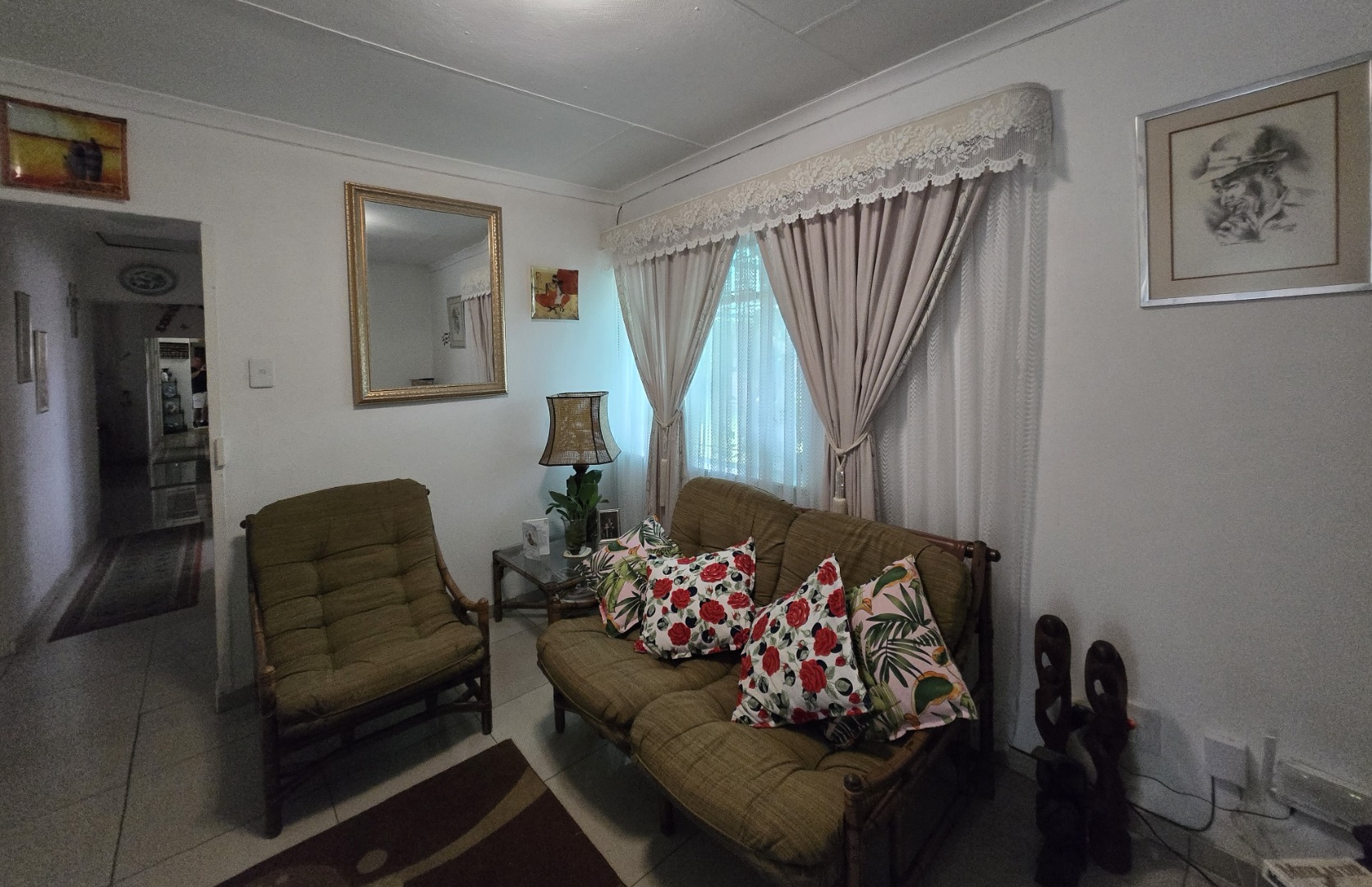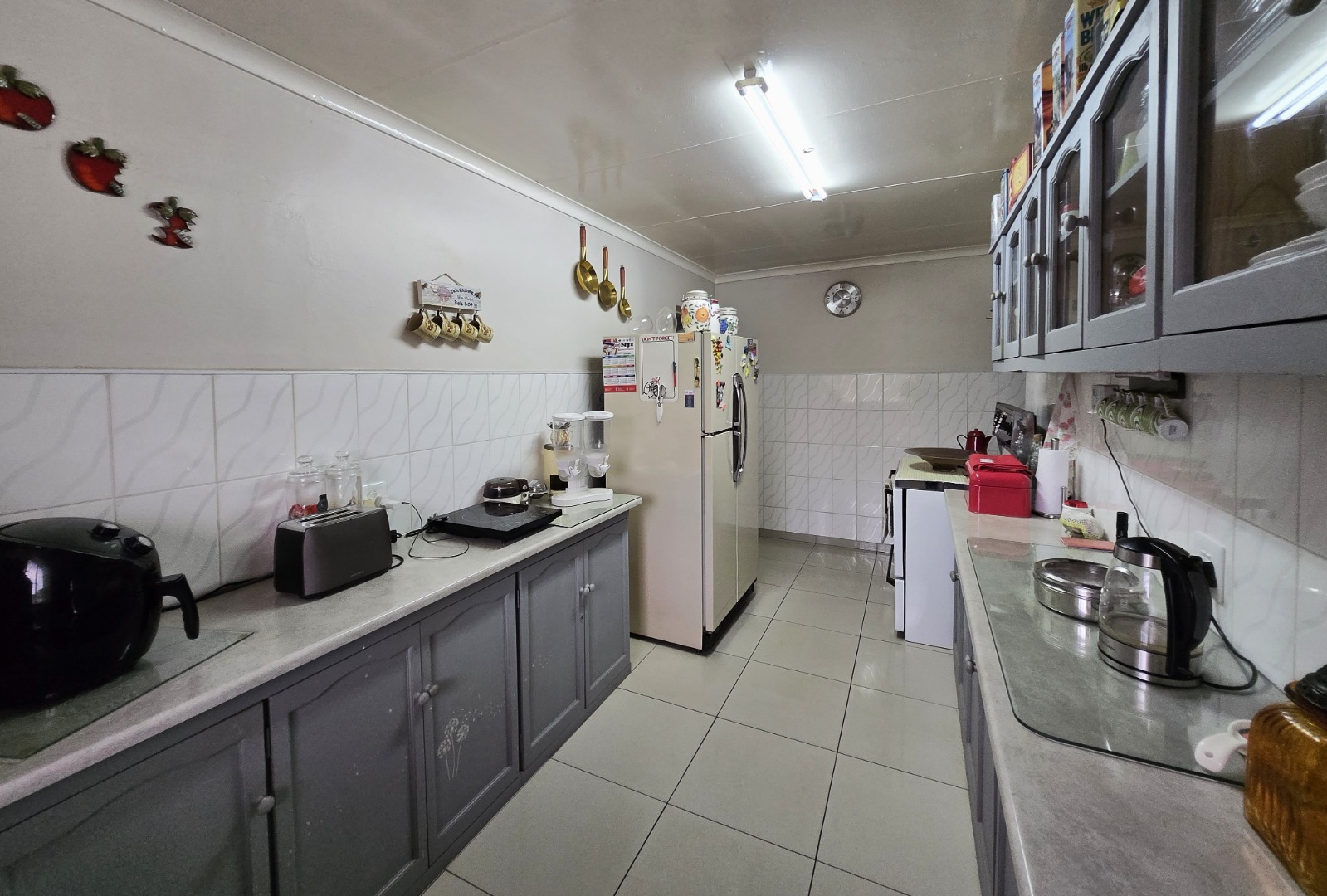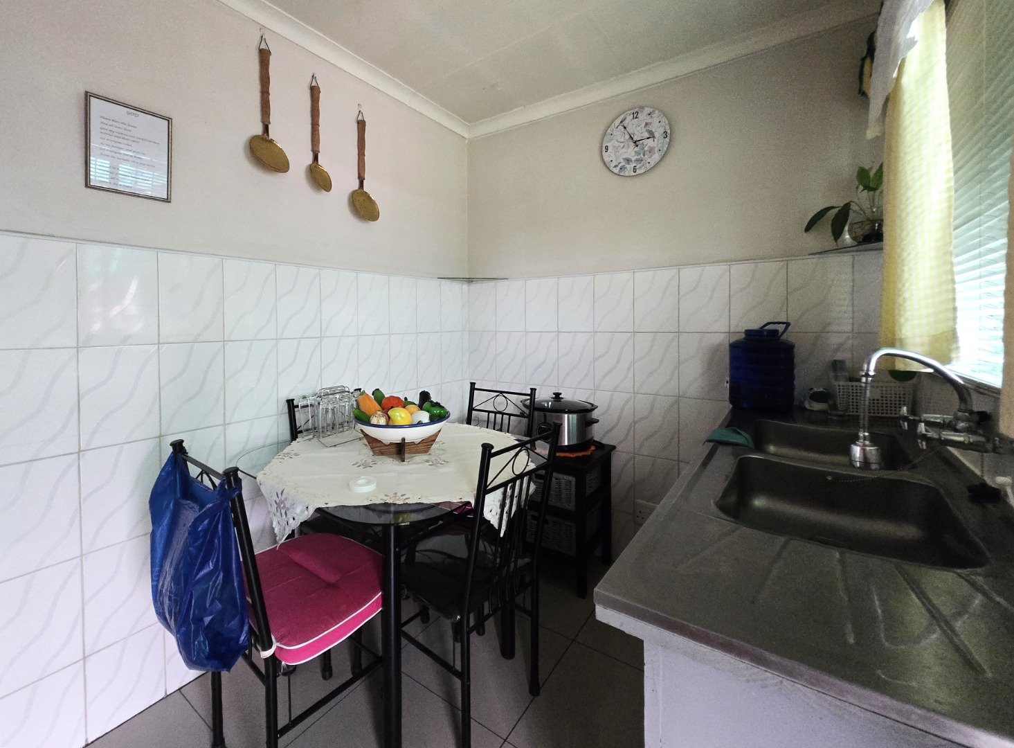 Step inside to discover a spacious dining room, bathed in natural light from a large window, offering an ideal setting for family gatherings. The functional kitchen boasts extensive storage with both upper and lower cabinets, durable tiled walls, and countertops, presenting a practical space ready for your personal touch. The layout includes one lounge and one dining area, ensuring distinct living zones.