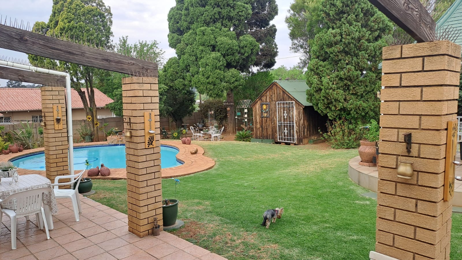 The property boasts a large yard with a sparkling swimming pool, a lovely patio overlooking the pool, as well as a dome entertainment area with pool views – ideal for relaxing or entertaining guests.