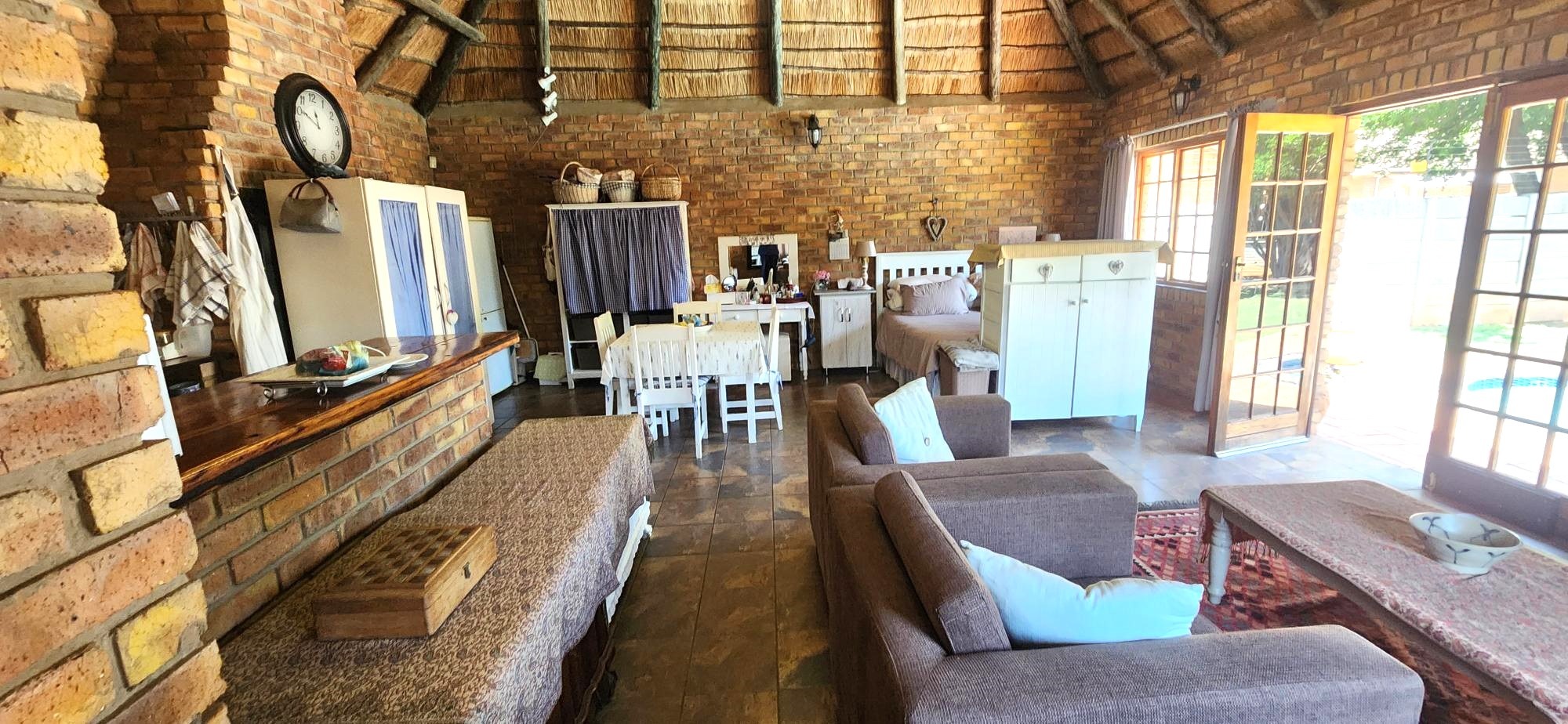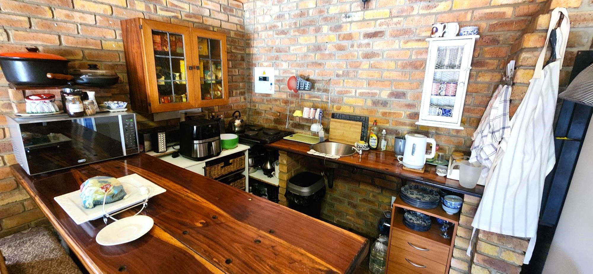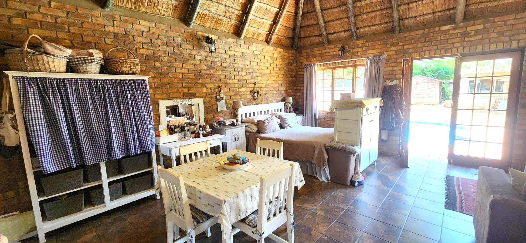 Inside, the home offers a unique blend of rustic charm and functional design. The open-plan living area, characterized by exposed brick walls and a distinctive thatched roof, seamlessly integrates a lounge, dining space, and a rustic kitchen. This versatile area benefits from natural light and direct outdoor access through large French doors, creating an inviting atmosphere. The kitchen, while rustic, is well-equipped with wooden countertops and space for various appliances.