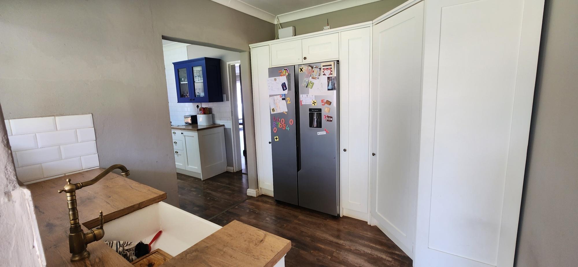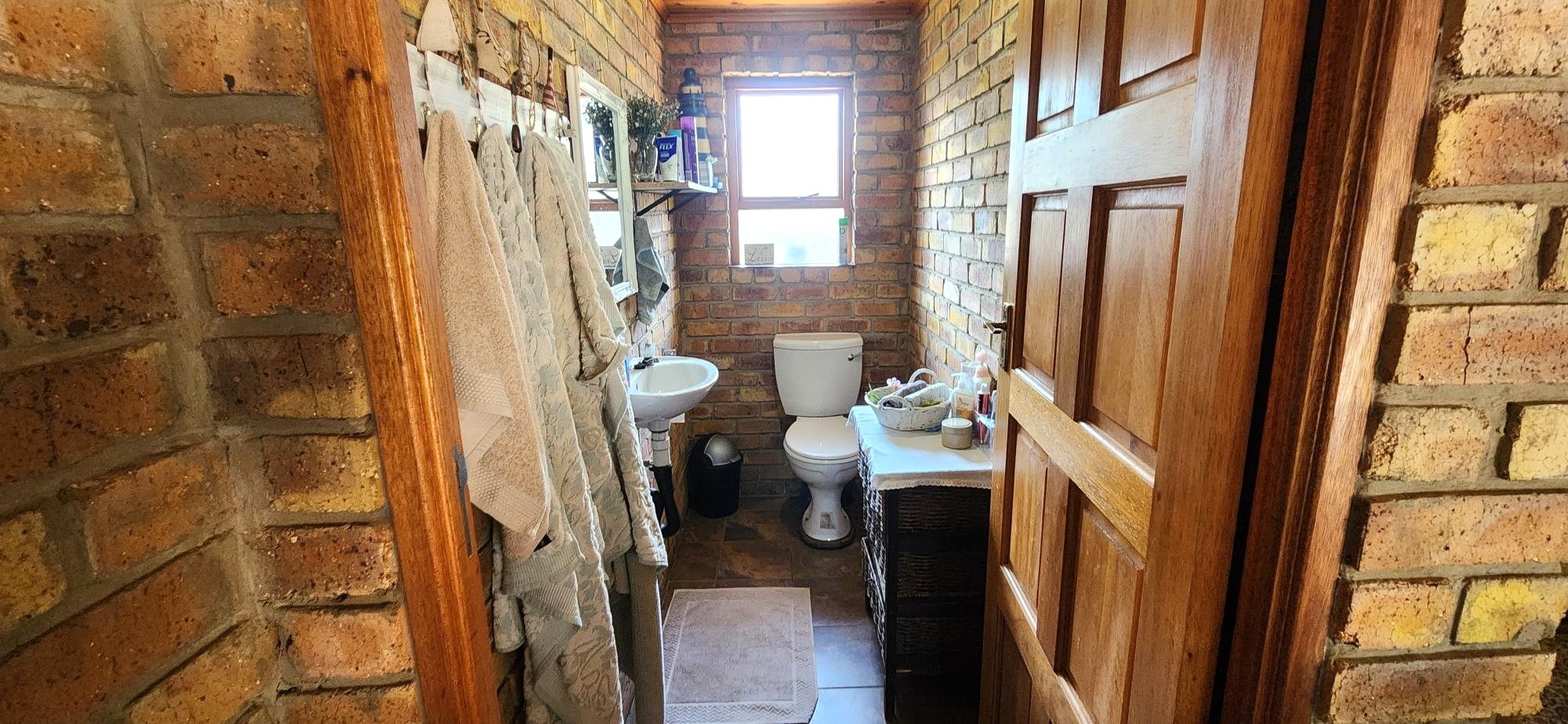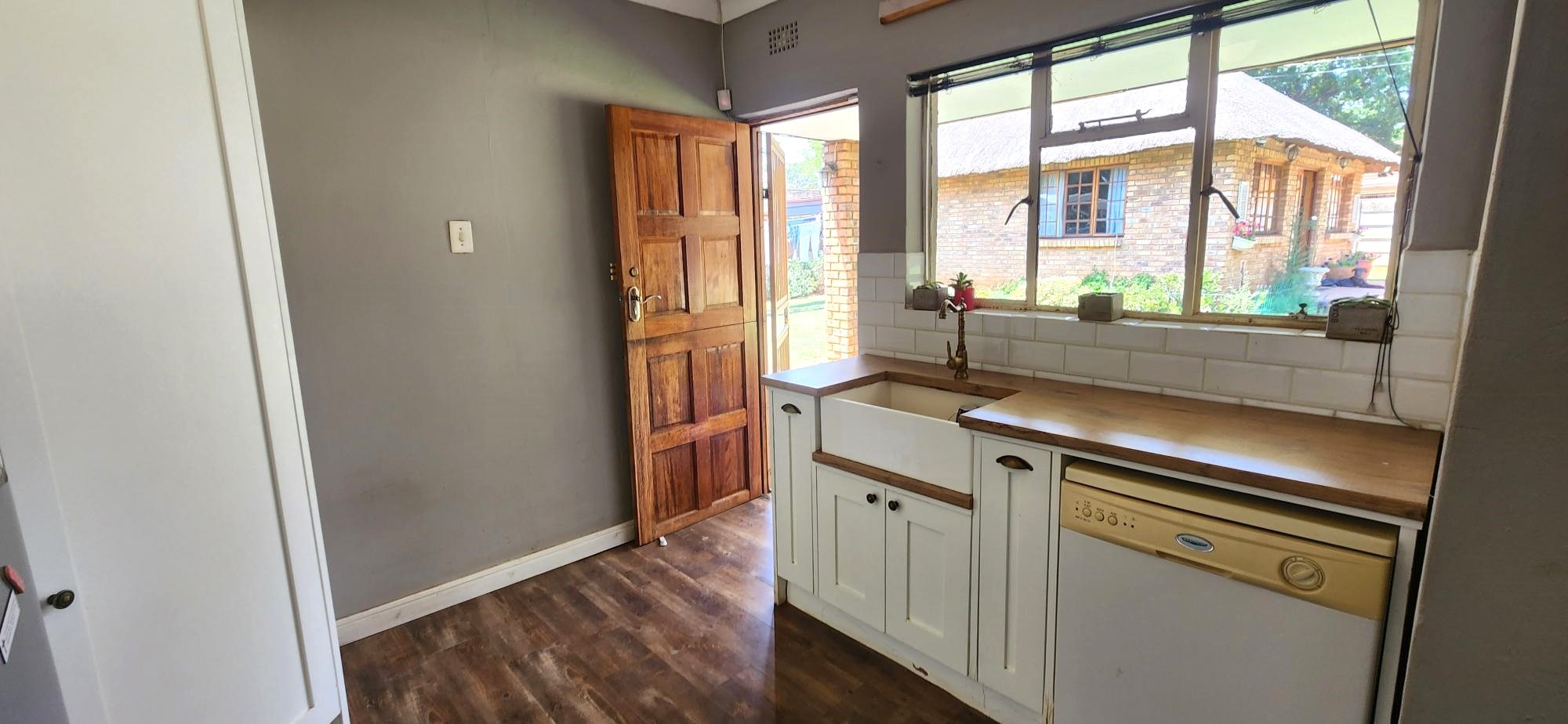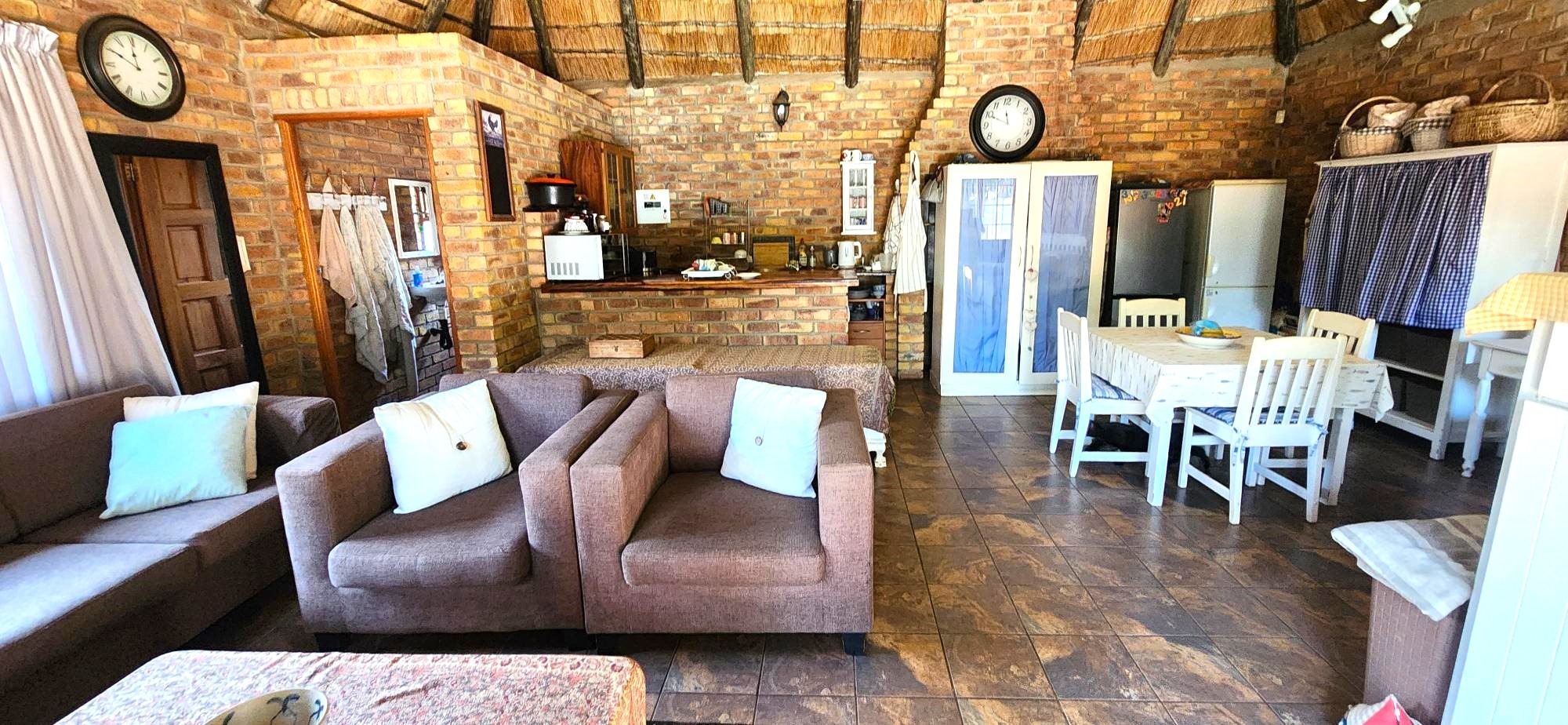 Inside, the home offers a unique blend of rustic charm and functional design. The open-plan living area, characterized by exposed brick walls and a distinctive thatched roof, seamlessly integrates a lounge, dining space, and a rustic kitchen. This versatile area benefits from natural light and direct outdoor access through large French doors, creating an inviting atmosphere. The kitchen, while rustic, is well-equipped with wooden countertops and space for various appliances.