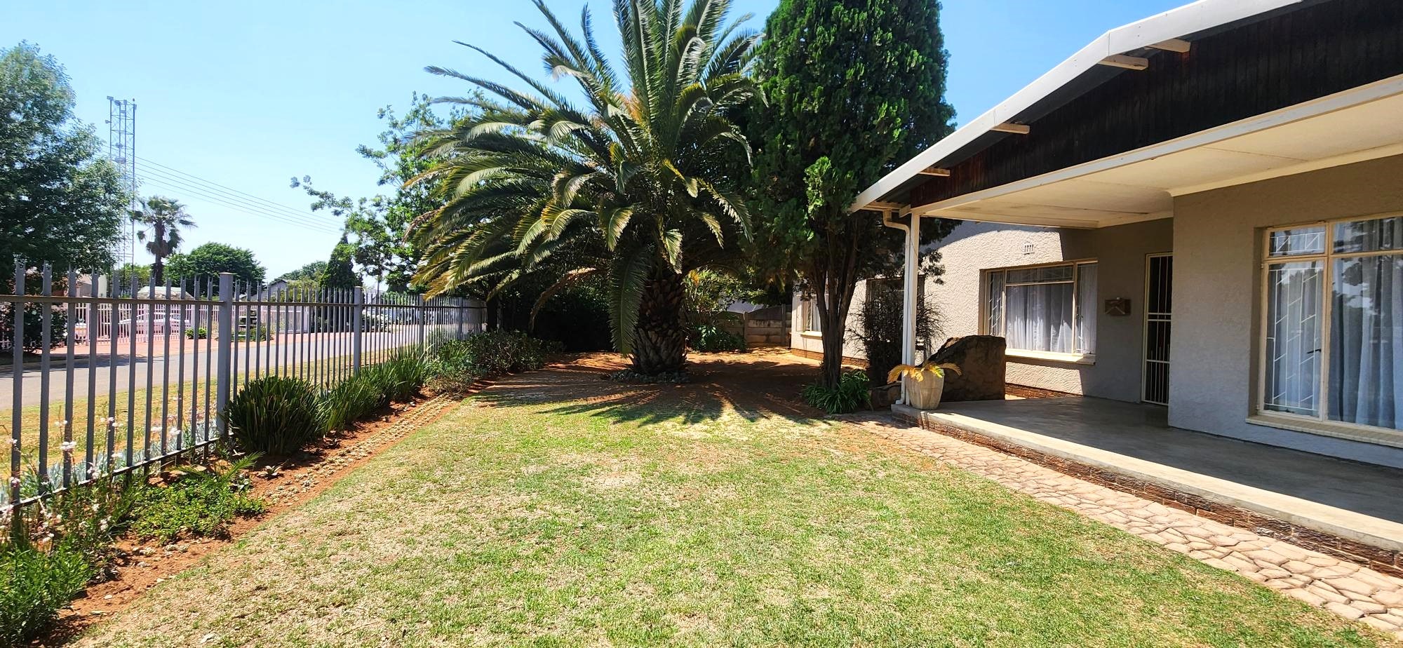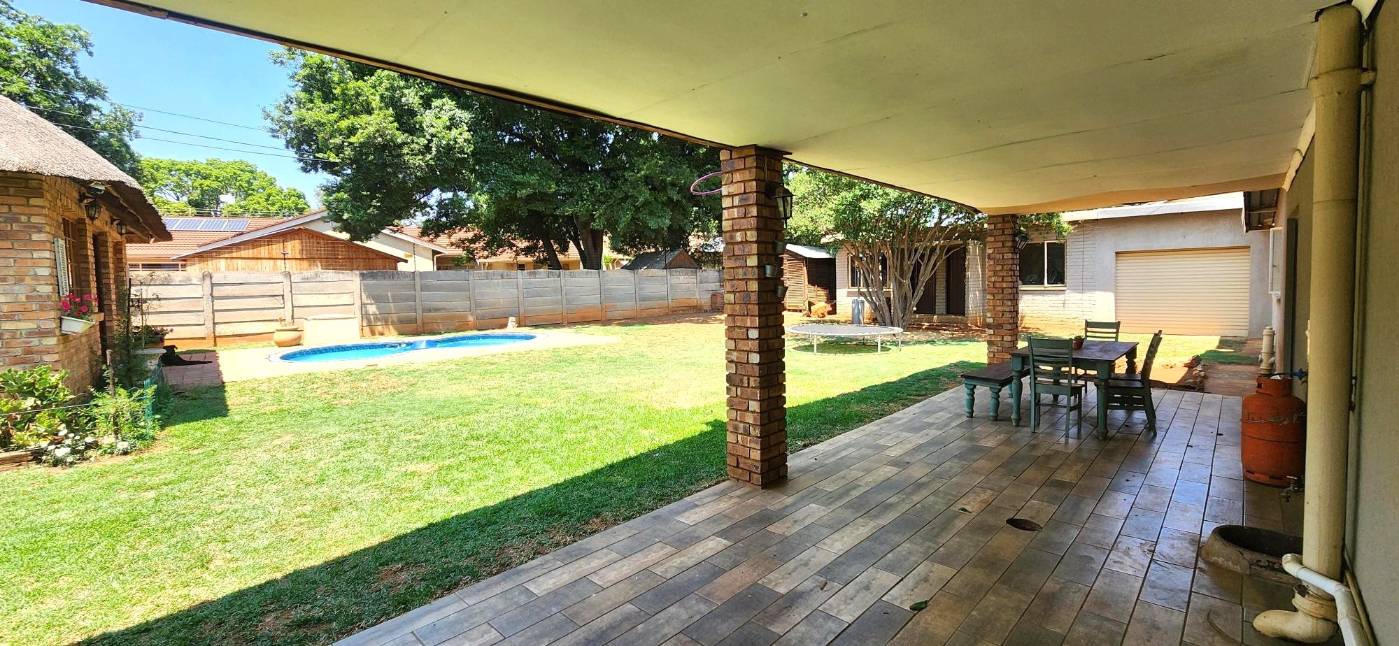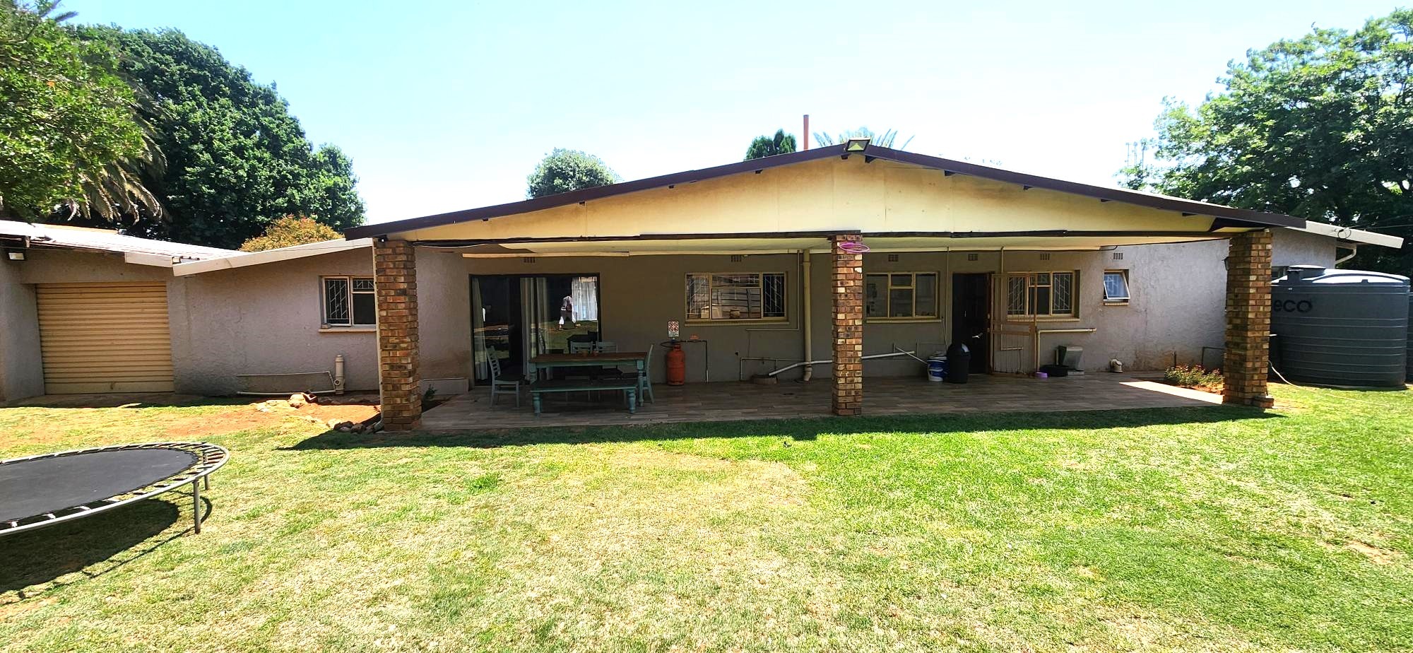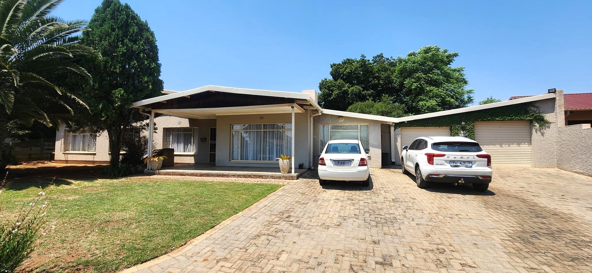 The exterior presents a welcoming kerb appeal with a paved driveway, providing abundant off-street parking, and leading to a double garage and covered carport. The front garden features established trees and a lawn, complemented by a neutral-toned facade and visible security features like burglar bars and security gates, ensuring peace of mind.