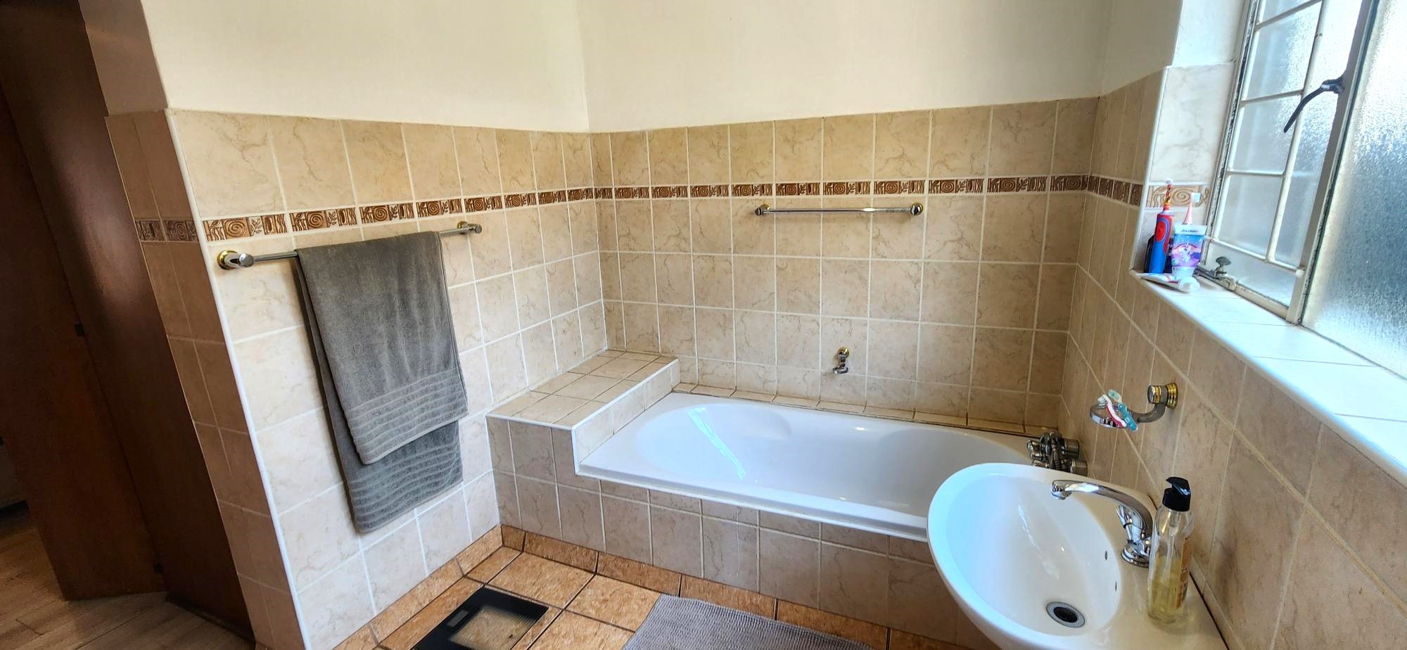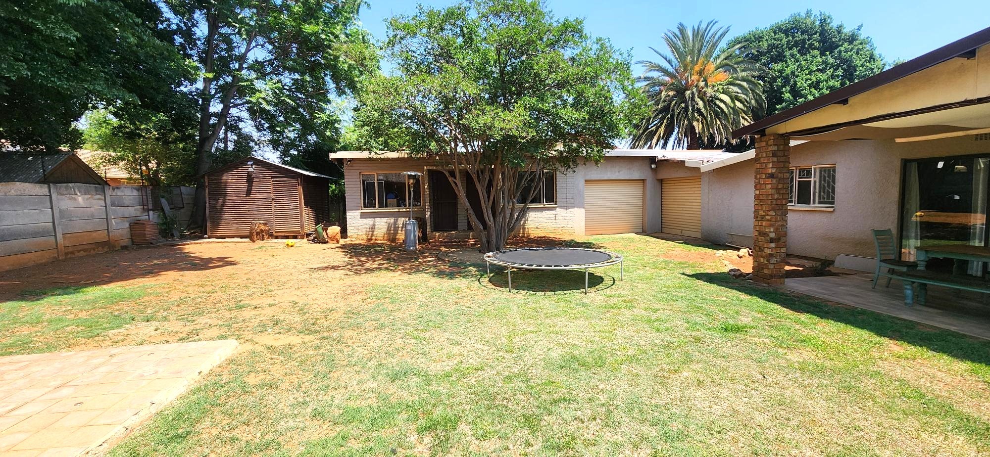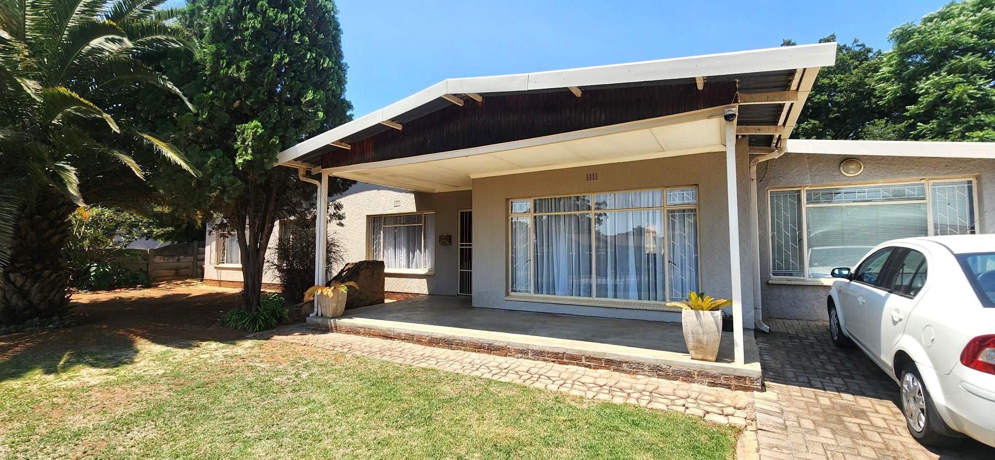 The exterior presents a welcoming kerb appeal with a paved driveway, providing abundant off-street parking, and leading to a double garage and covered carport. The front garden features established trees and a lawn, complemented by a neutral-toned facade and visible security features like burglar bars and security gates, ensuring peace of mind.