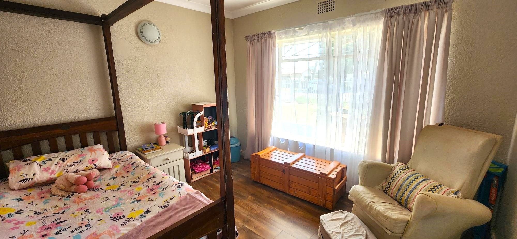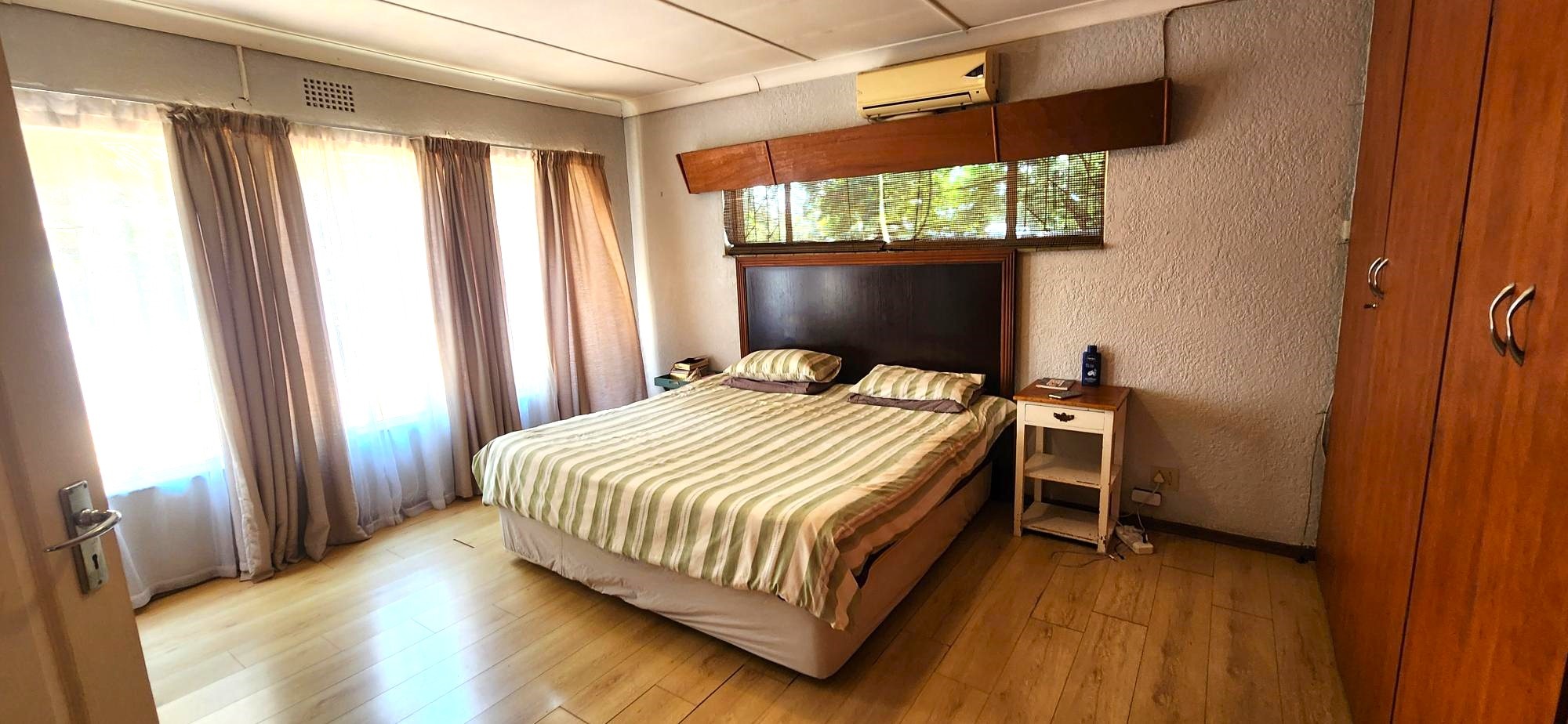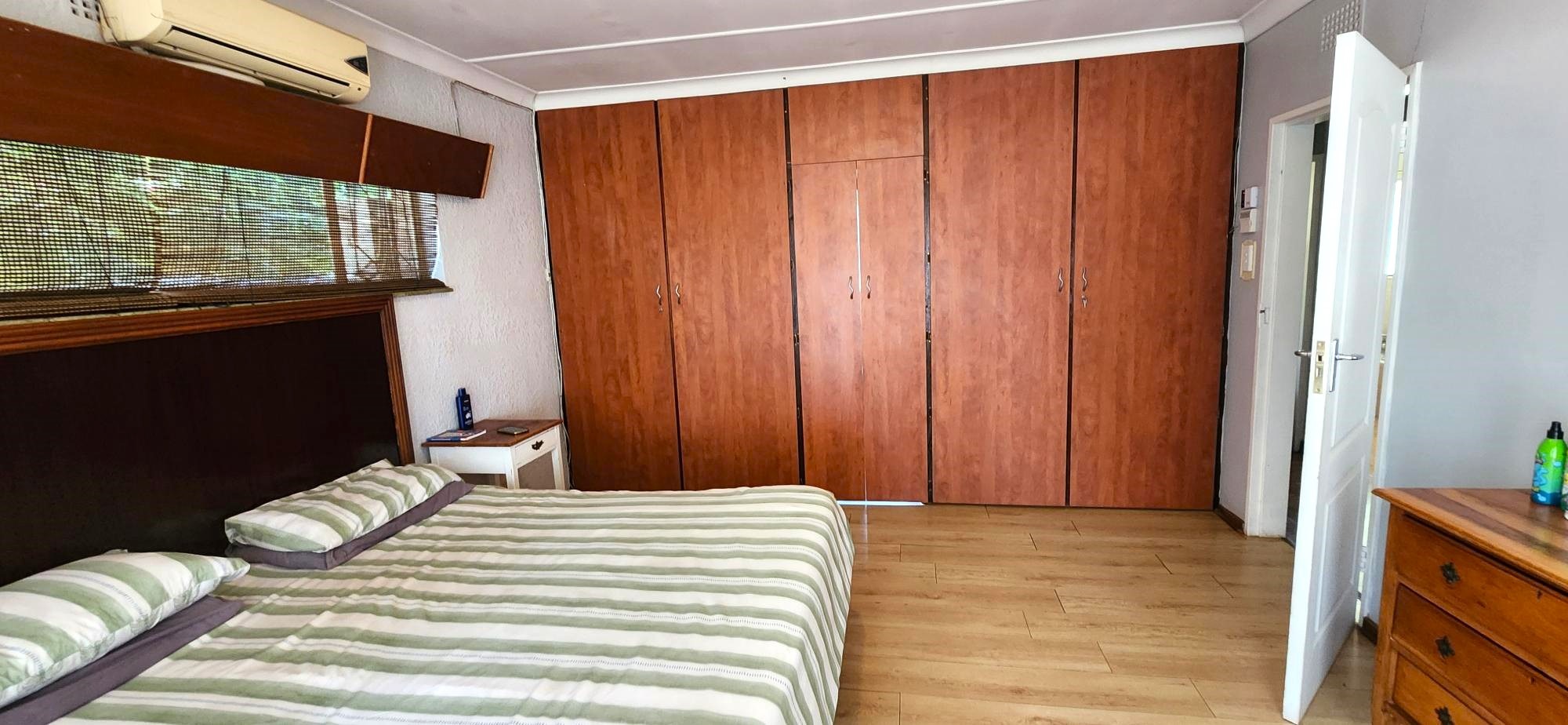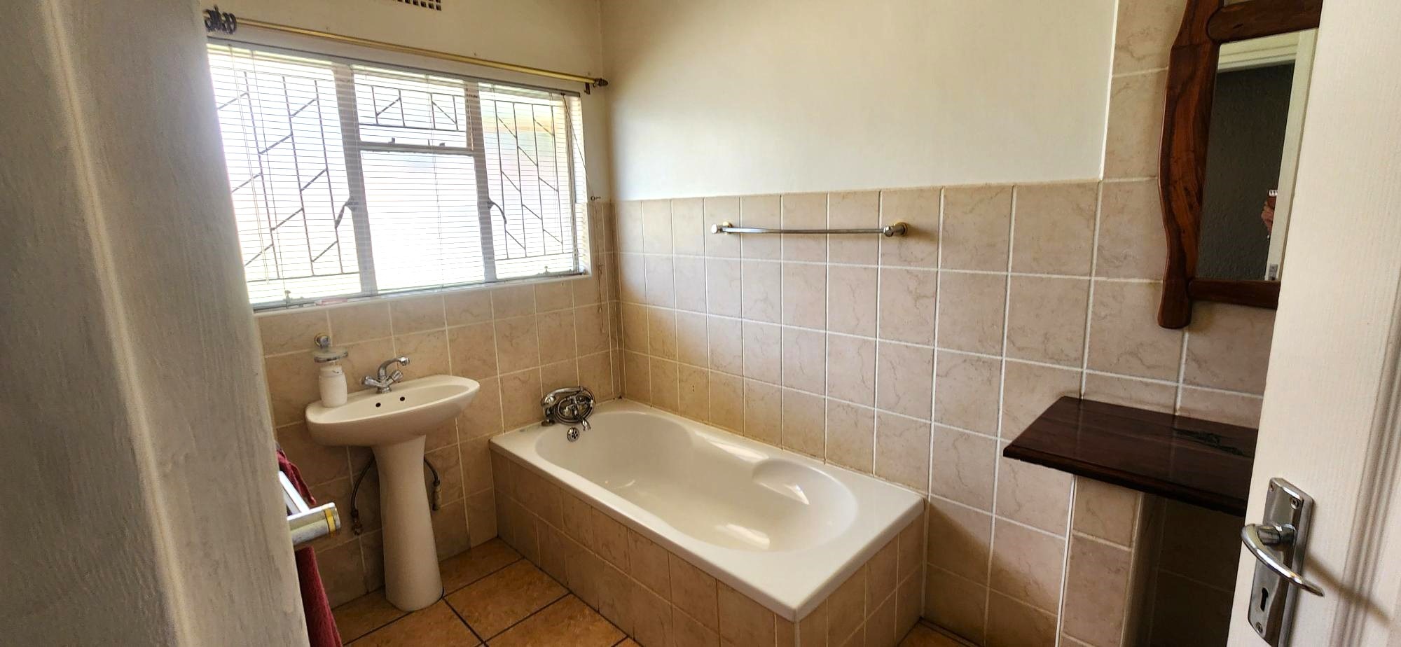 The exterior presents a welcoming kerb appeal with a paved driveway, providing abundant off-street parking, and leading to a double garage and covered carport. The front garden features established trees and a lawn, complemented by a neutral-toned facade and visible security features like burglar bars and security gates, ensuring peace of mind.