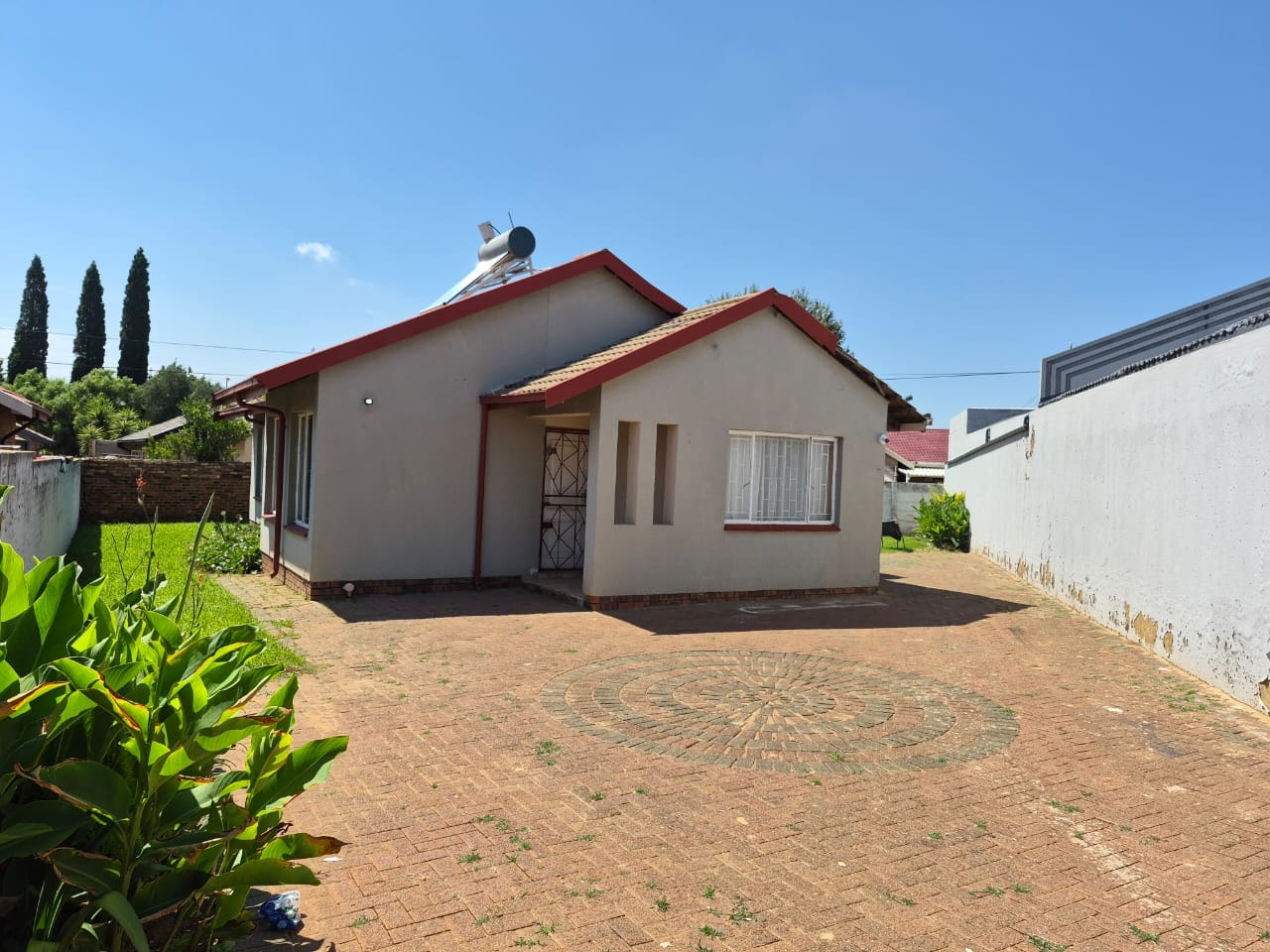 Presenting a residential property in Lenasia Ext 2, This single-story home features a light-coloured exterior with red roof trim, complemented by a paved driveway and an established garden, providing off-street parking for two vehicles. A solar water heater contributes to energy efficiency, enhancing the home's sustainability.