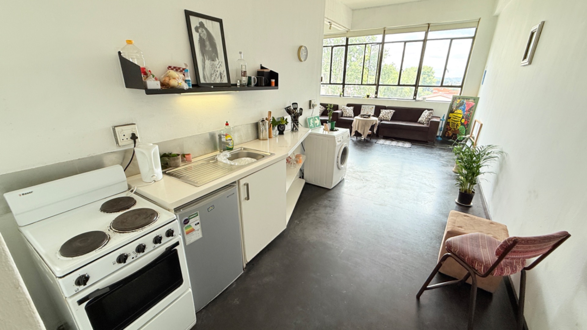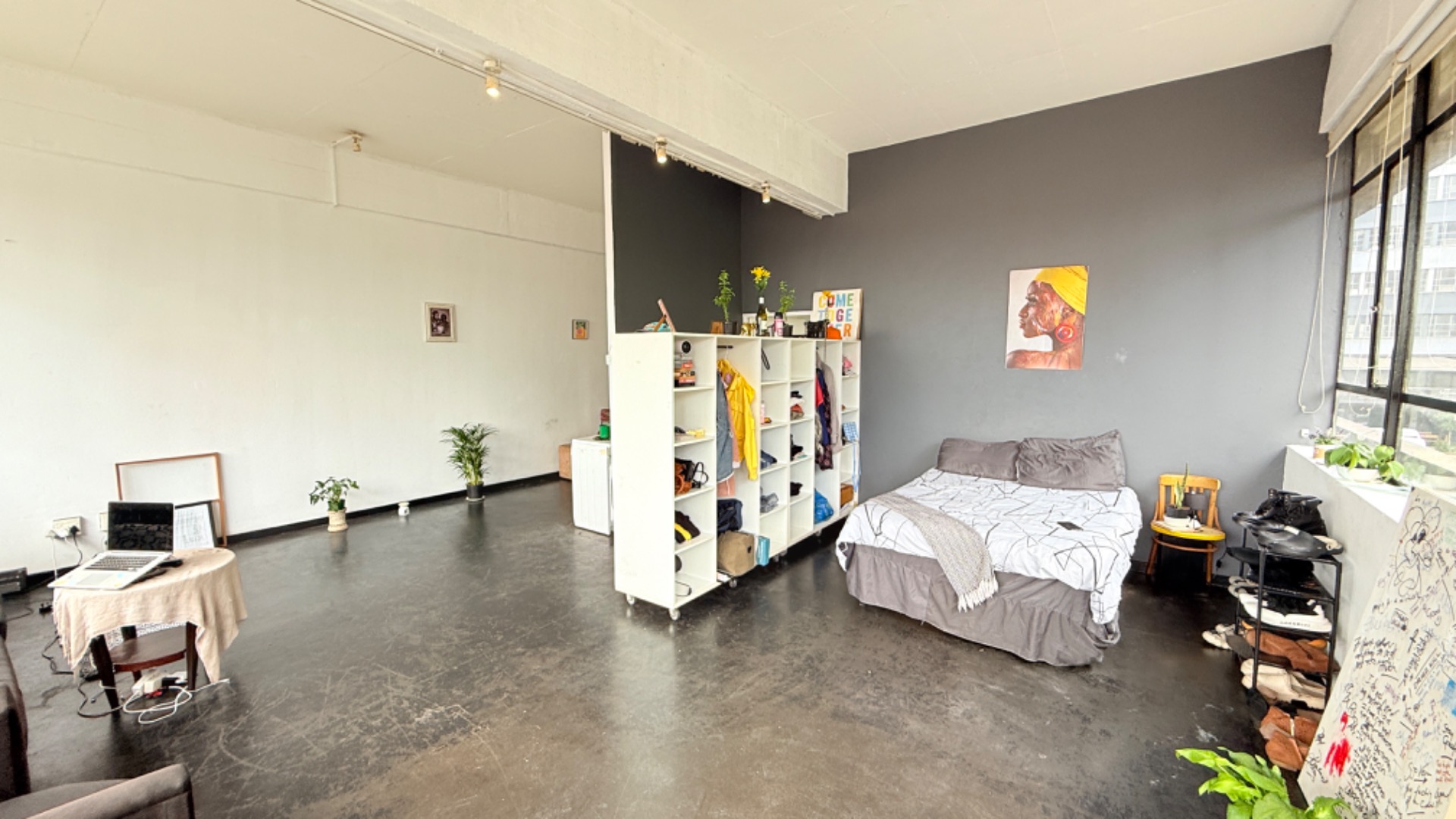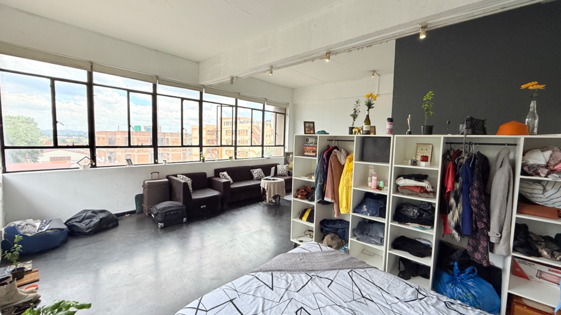 Discover urban living in this spacious 59 sqm open-plan studio apartment located in the vibrant Maboneng precinct of Johannesburg. This contemporary residence boasts high ceilings and expansive industrial-style windows that flood the space with abundant natural light, offering panoramic city views and glimpses of lush greenery. The versatile layout seamlessly integrates a comfortable lounge and dining area, providing a flexible environment for both relaxation and productivity. The modern industrial aesthetic is complemented by durable concrete floors, creating a stylish and low-maintenance living space. An integrated kitchenette is thoughtfully equipped with essential appliances, including a full-size stove, oven, mini-fridge, catering to all your daily needs.