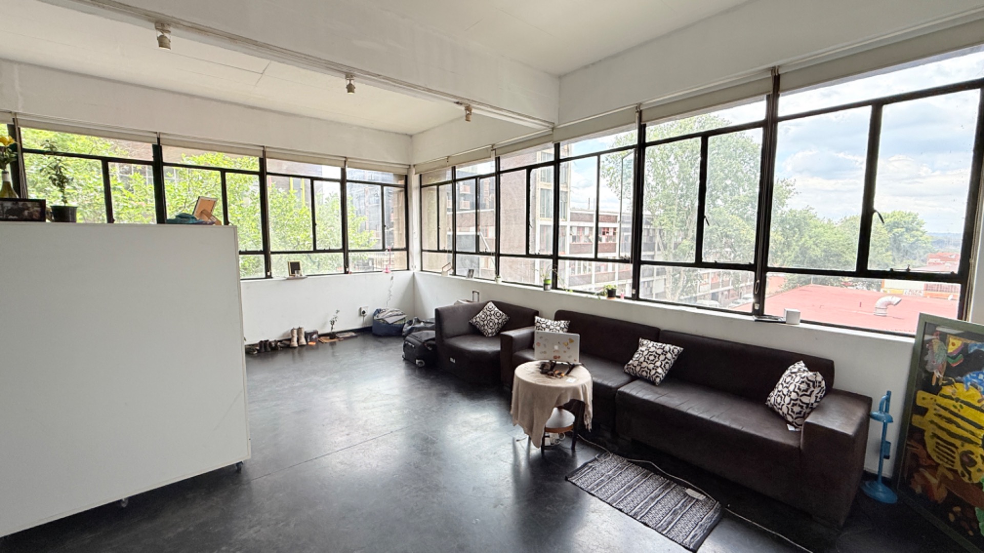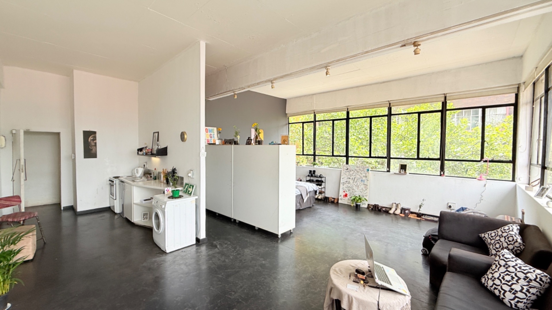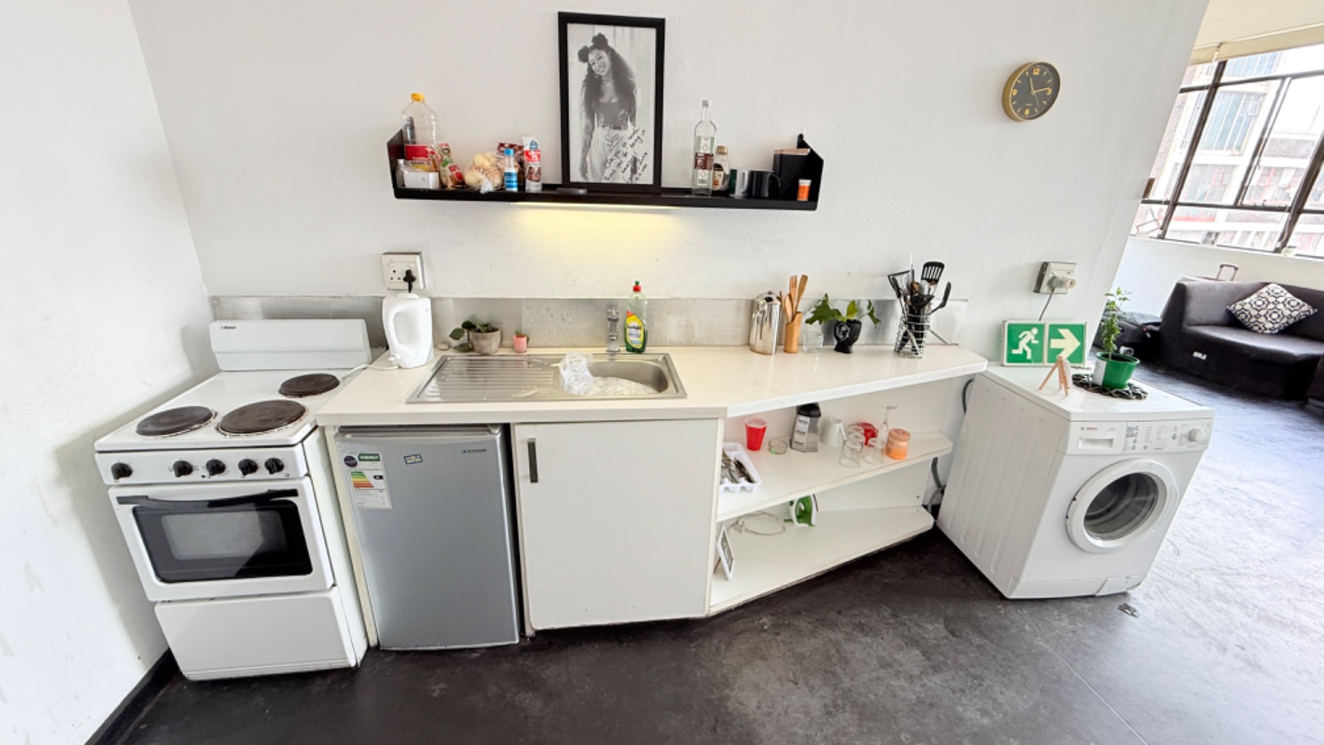 Discover urban living in this spacious 59 sqm open-plan studio apartment located in the vibrant Maboneng precinct of Johannesburg. This contemporary residence boasts high ceilings and expansive industrial-style windows that flood the space with abundant natural light, offering panoramic city views and glimpses of lush greenery. The versatile layout seamlessly integrates a comfortable lounge and dining area, providing a flexible environment for both relaxation and productivity. The modern industrial aesthetic is complemented by durable concrete floors, creating a stylish and low-maintenance living space. An integrated kitchenette is thoughtfully equipped with essential appliances, including a full-size stove, oven, mini-fridge, catering to all your daily needs.