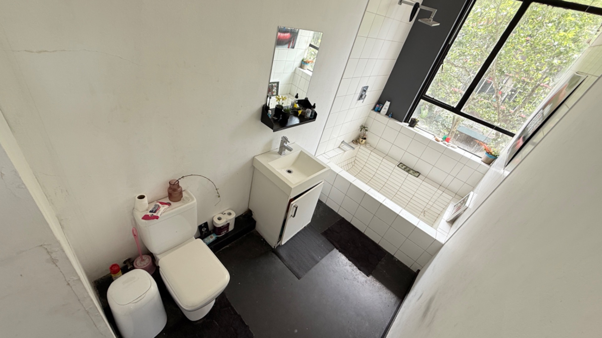The apartment features a well-appointed sleeping area, designed to maximise the open-plan feel while offering a sense of distinct living zones. Adjacent to this, the single bathroom includes a practical bathtub with an overhead shower and a vanity sink, ensuring comfort and functionality.