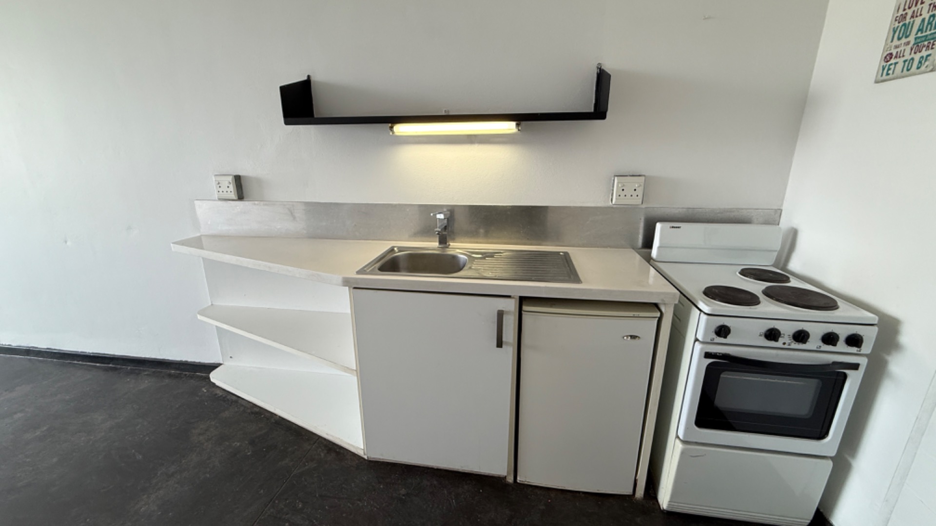 Step inside and you'll find a bright, open-plan living area that feels spacious thanks to the large windows letting in plenty of natural light. The freshly painted white walls and durable concrete flooring give it a clean, modern vibe that's super easy to personalise. There's even a handy Mobile shelving unit to help keep things tidy.