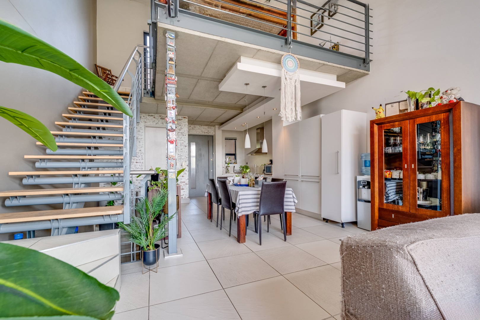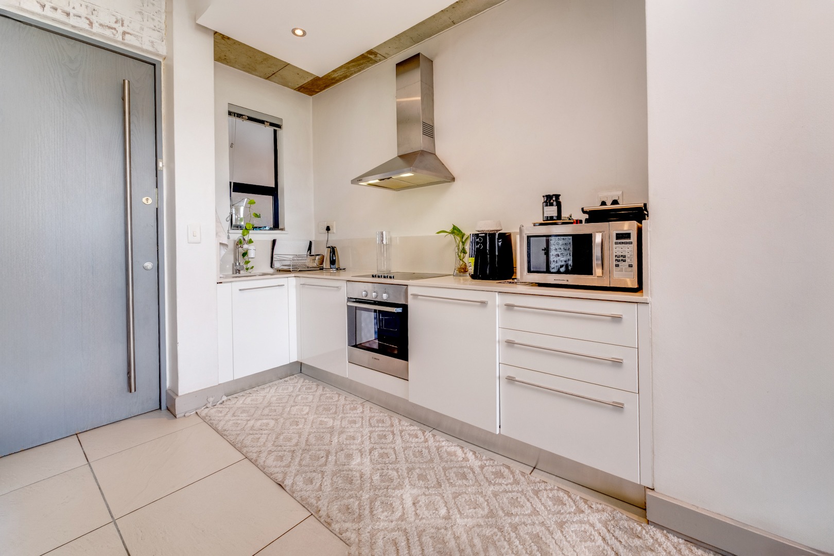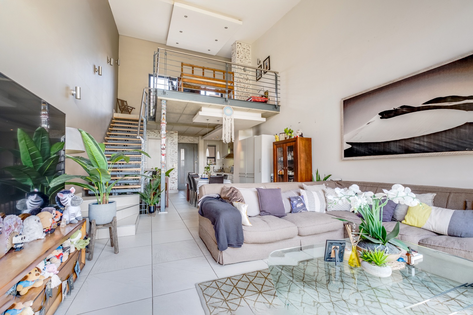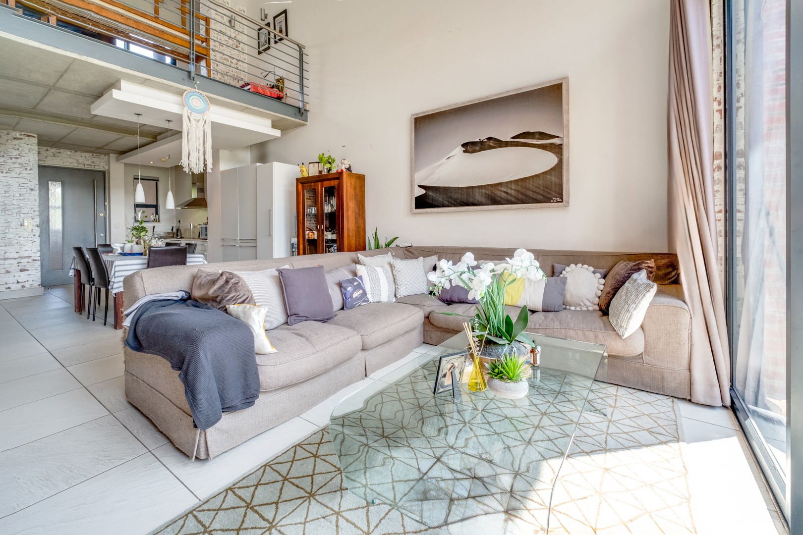 As you enter, you are welcomed by the double volume space boasting a well fitted kitchen with hidden appliances (Cesar stone finishes) open plan to the dining and living room areas, leading in turn to a private balcony. A loft area shares this space - perfect for a study - which opens onto an entertainment patio with a gas braai, ideal for kicking back and relaxing after another successful business day.