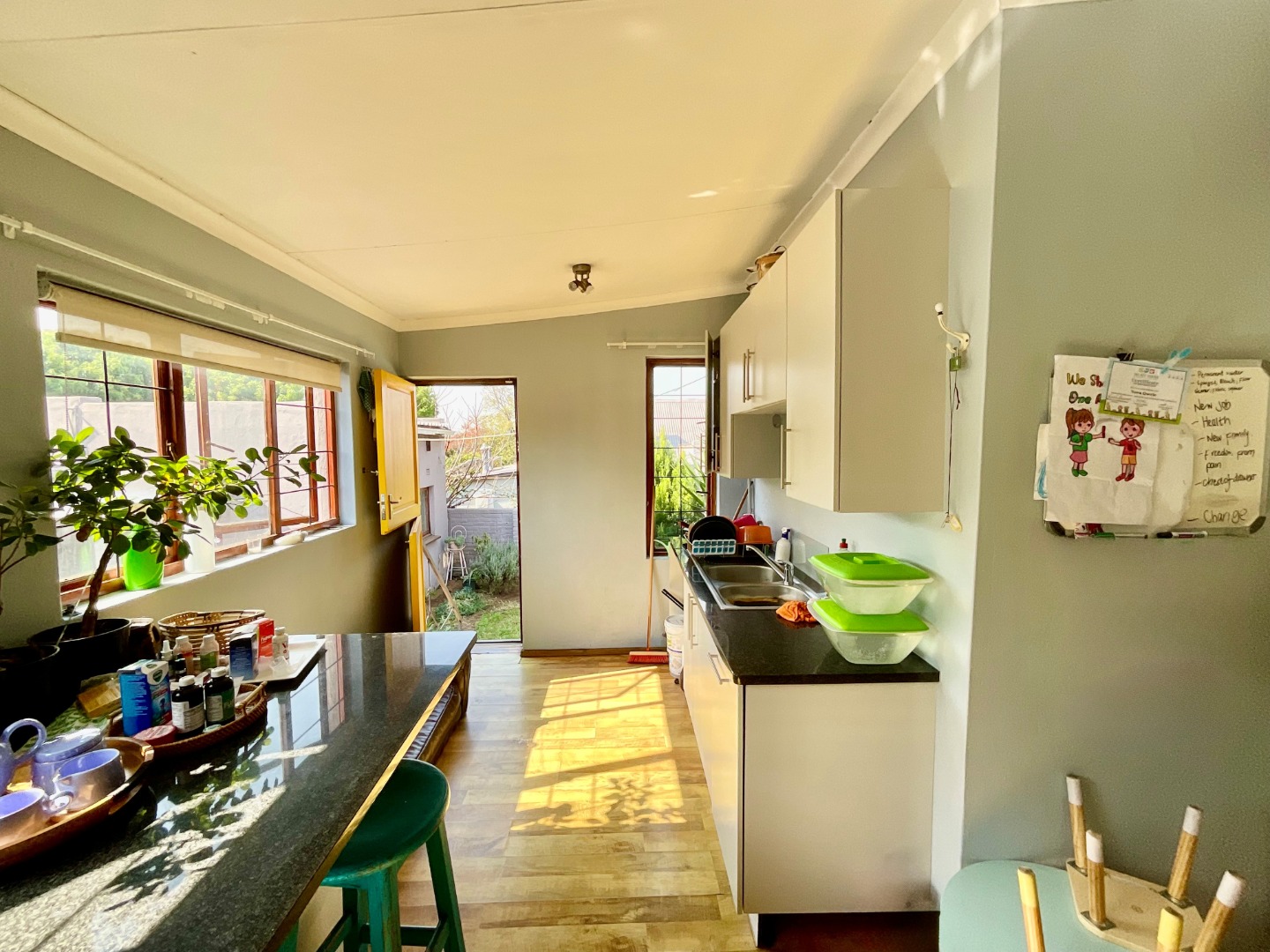 Inside, high ceilings and unique light fixtures give the rooms a sense of grandeur, while the windows flood the space with warm, golden afternoon light. A wood-burning fireplace anchors the cozy main bedroom, perfect for cool Johannesburg evenings. The kitchen, updated with modern conveniences, retains its vintage charm.