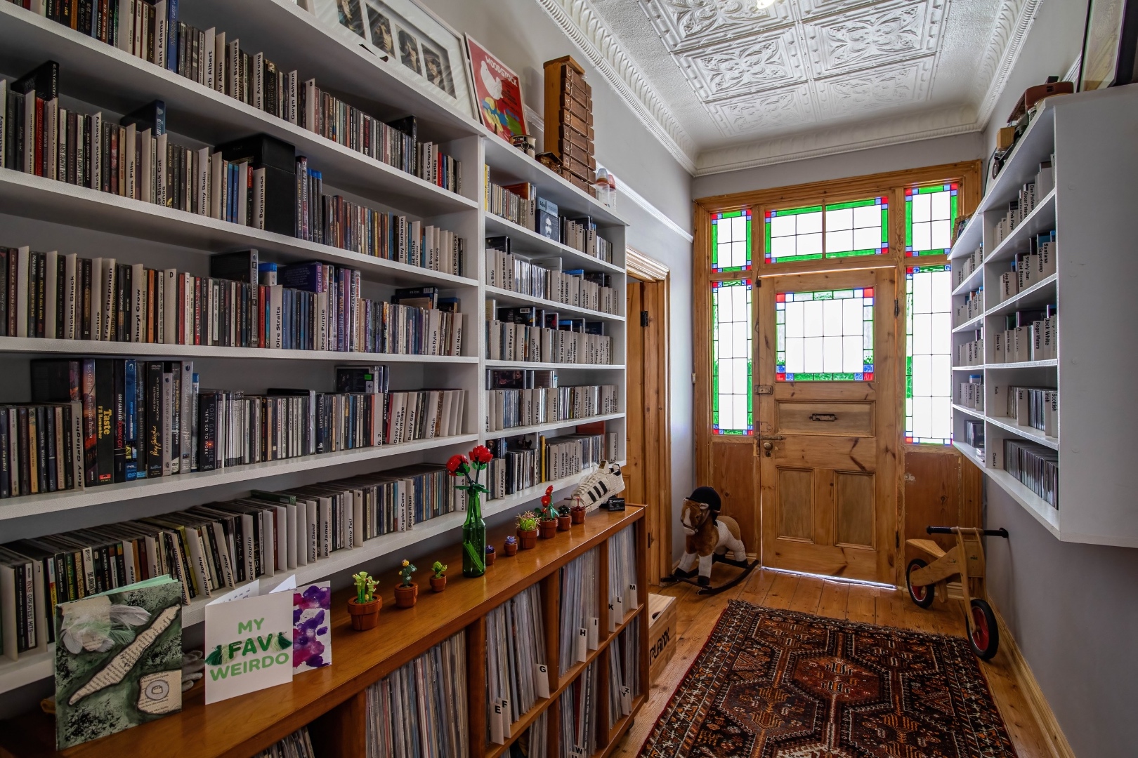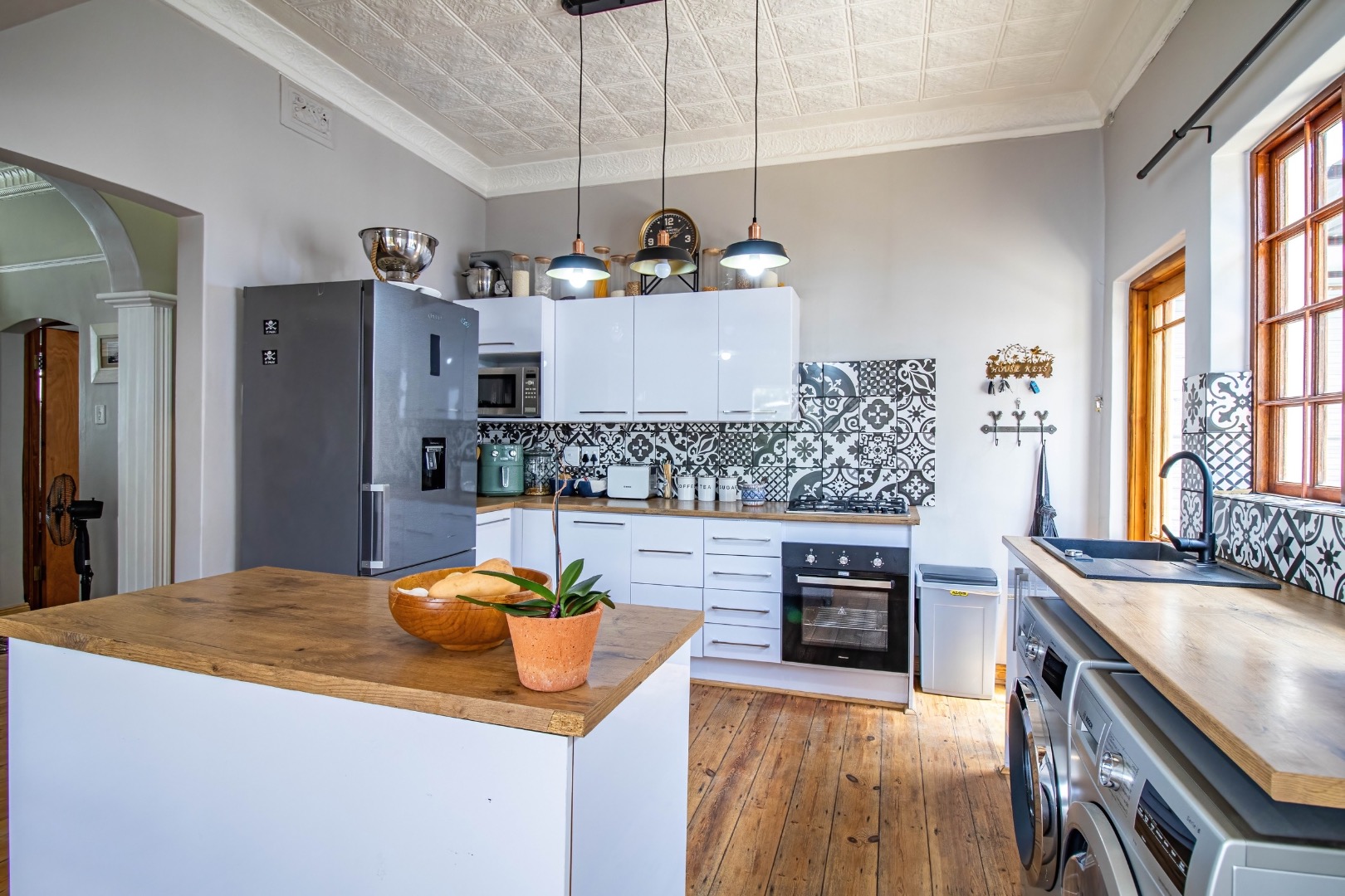 Inside, discover a delightful blend of character and modern comfort. Original hardwood floors flow throughout, complemented by unique pressed tin ceilings that add a touch of vintage charm. The open-plan living, dining, and kitchen areas create a wonderful, airy feel, perfect for everyday life and entertaining. The kitchen is a real highlight, featuring sleek white cabinetry, warm wooden countertops, a stylish patterned backsplash, and even integrated laundry appliances for convenience.