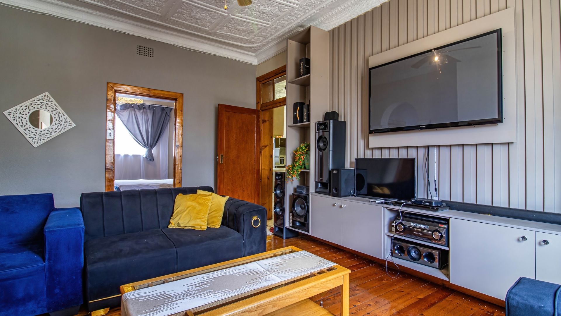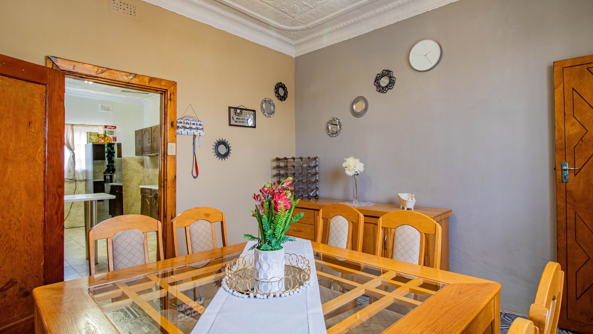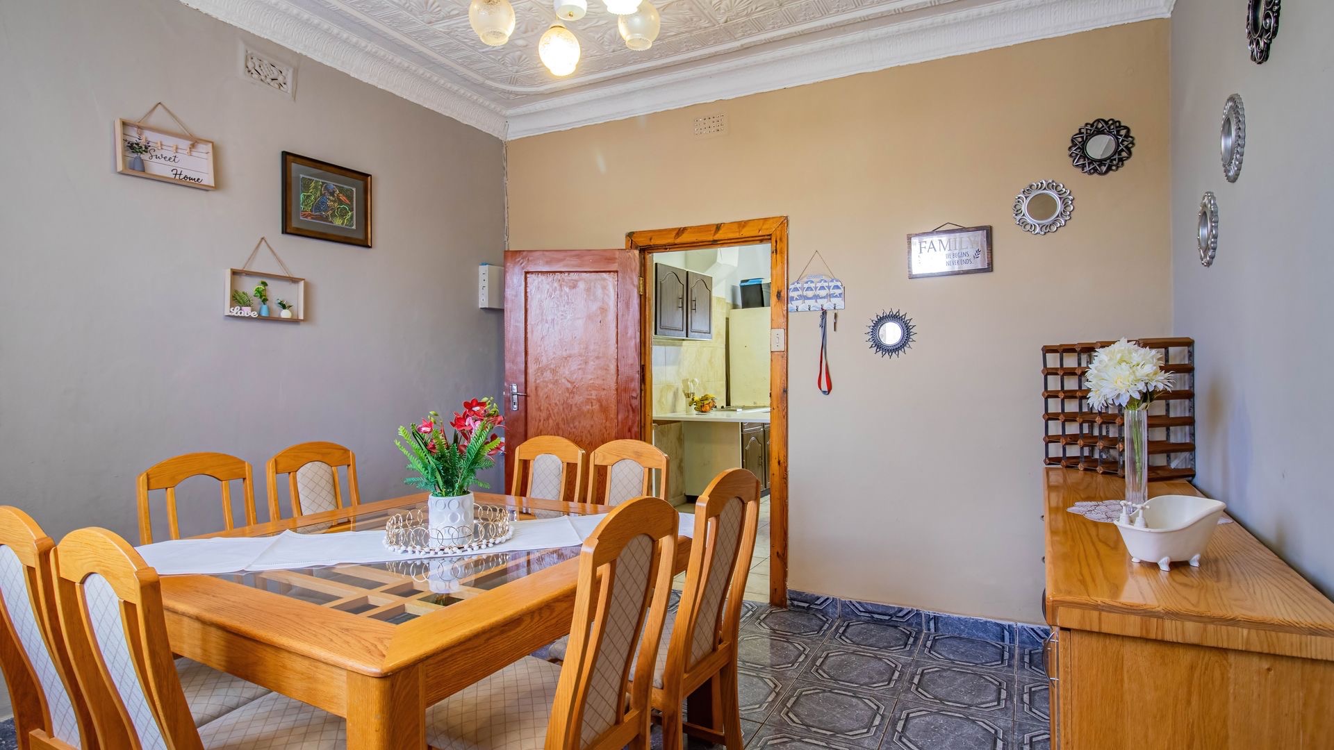 Inside, an entrance hall leads to generous living areas, including a comfortable lounge and a dedicated dining room. Both spaces boast distinctive pressed ceilings and polished hardwood floors, adding character and warmth. Built-in entertainment units provide functional storage, while the decorative fireplace serve as a charming focal point. Large windows ensure ample natural light throughout the home.