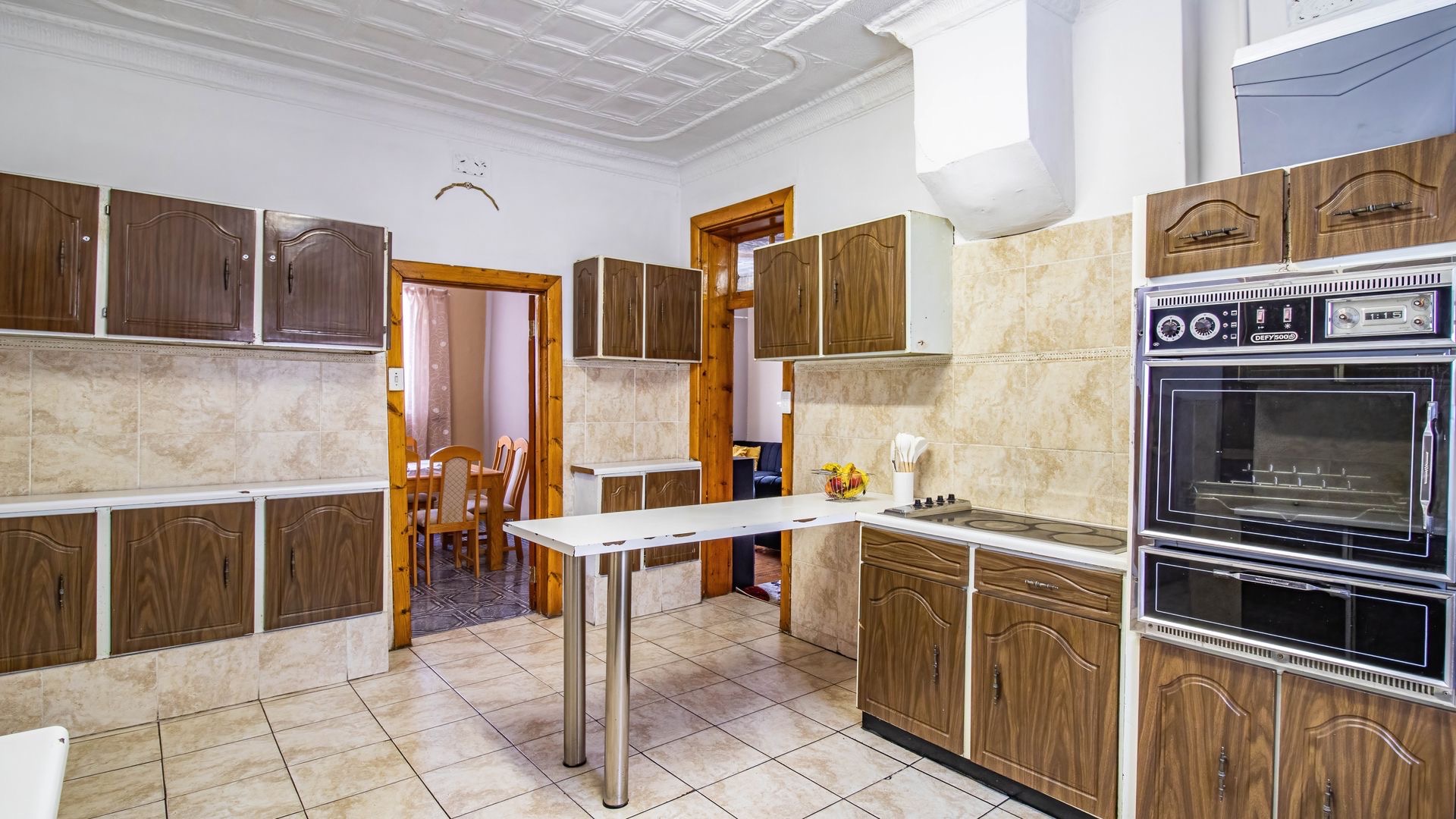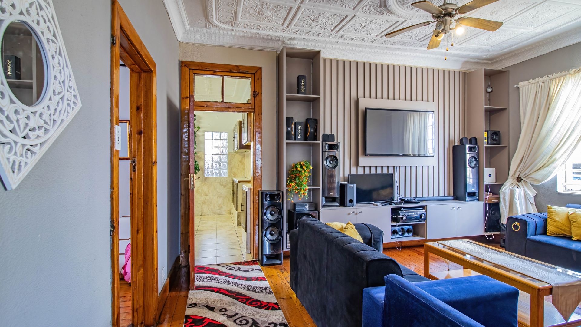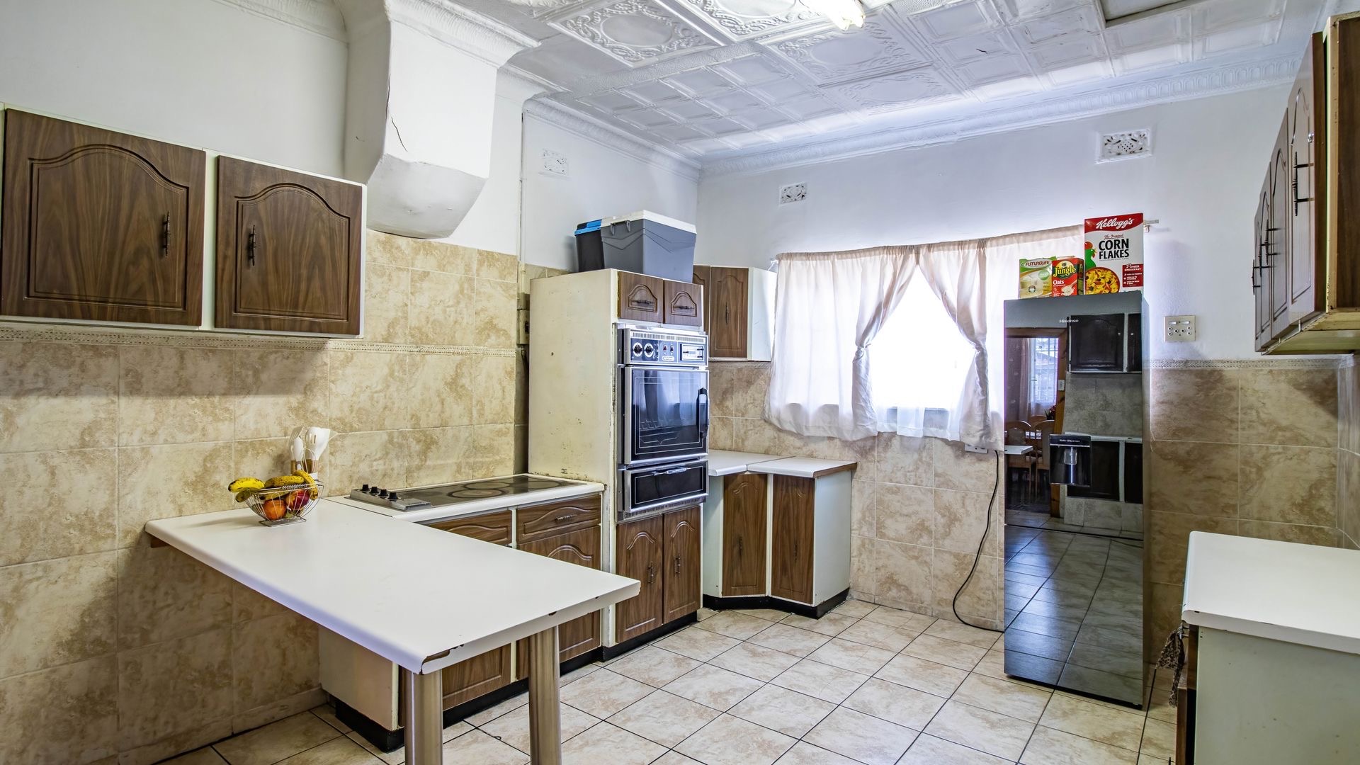 Inside, an entrance hall leads to generous living areas, including a comfortable lounge and a dedicated dining room. Both spaces boast distinctive pressed ceilings and polished hardwood floors, adding character and warmth. Built-in entertainment units provide functional storage, while the decorative fireplace serve as a charming focal point. Large windows ensure ample natural light throughout the home.