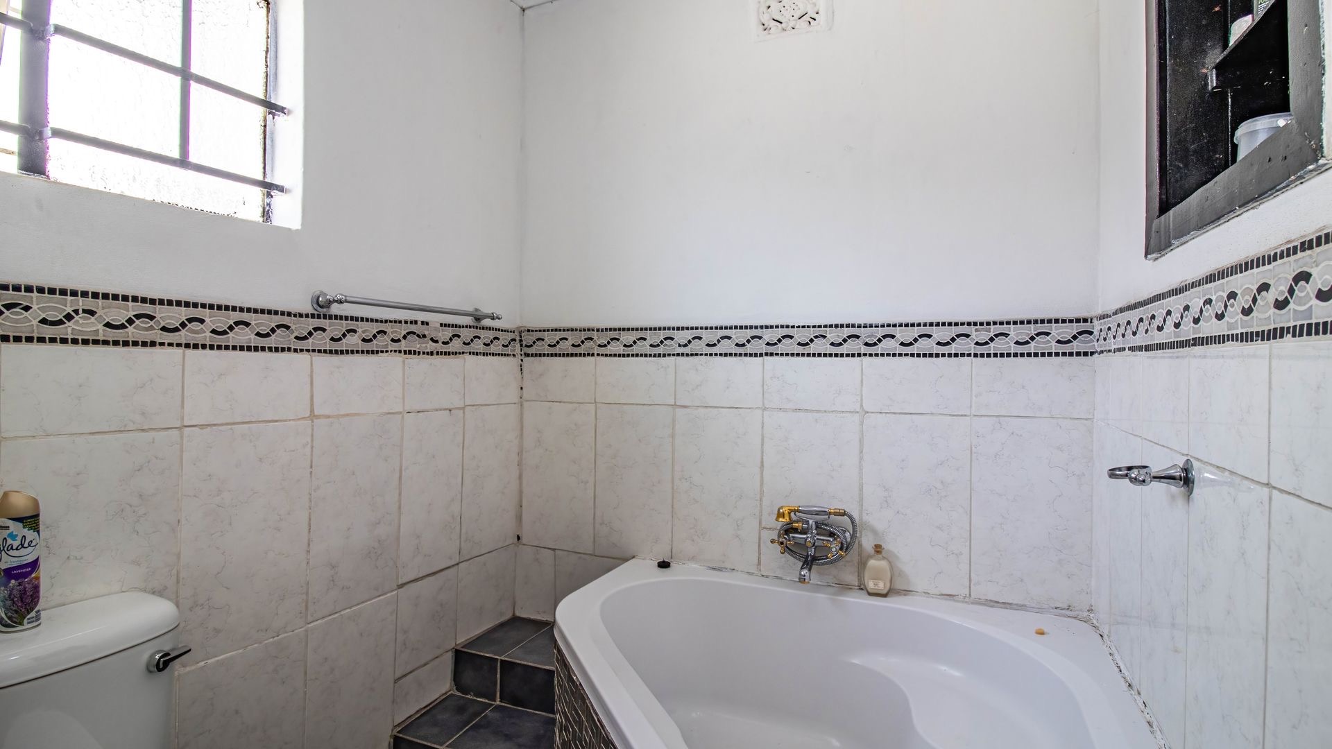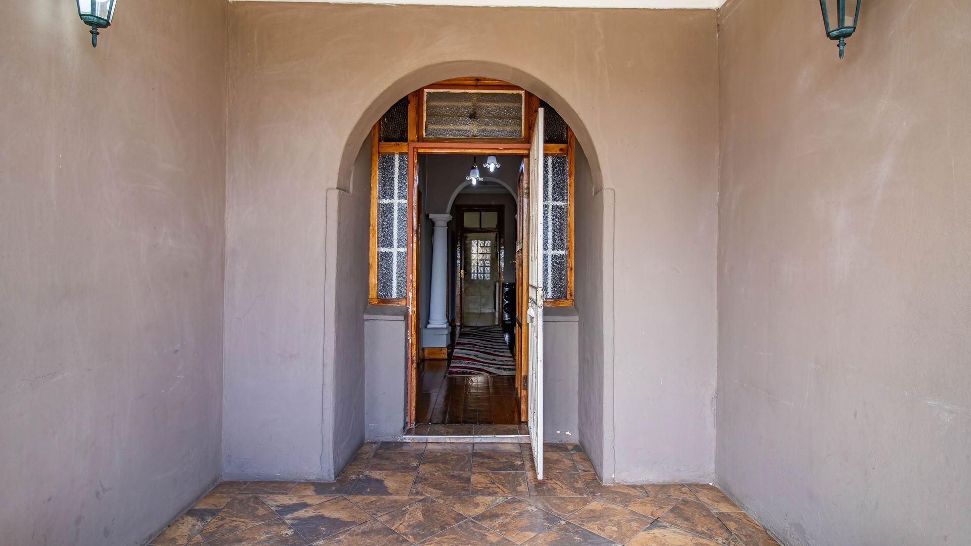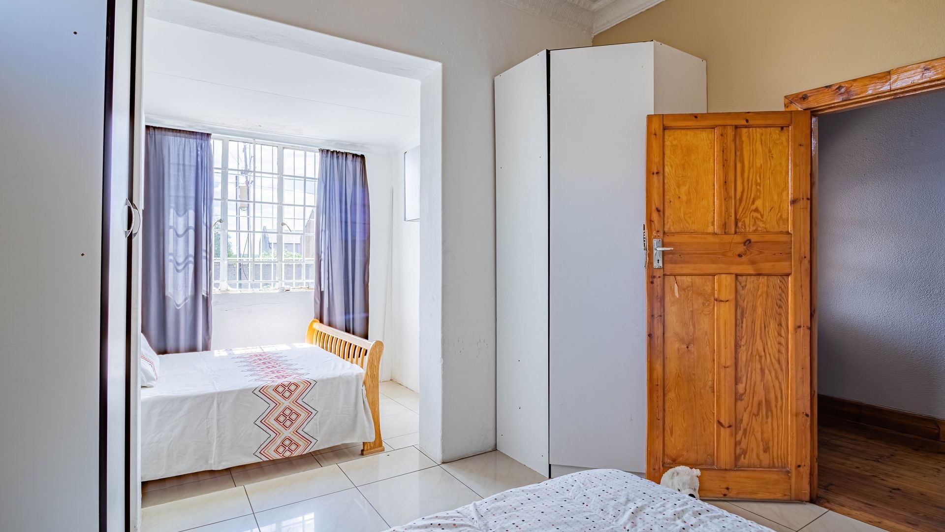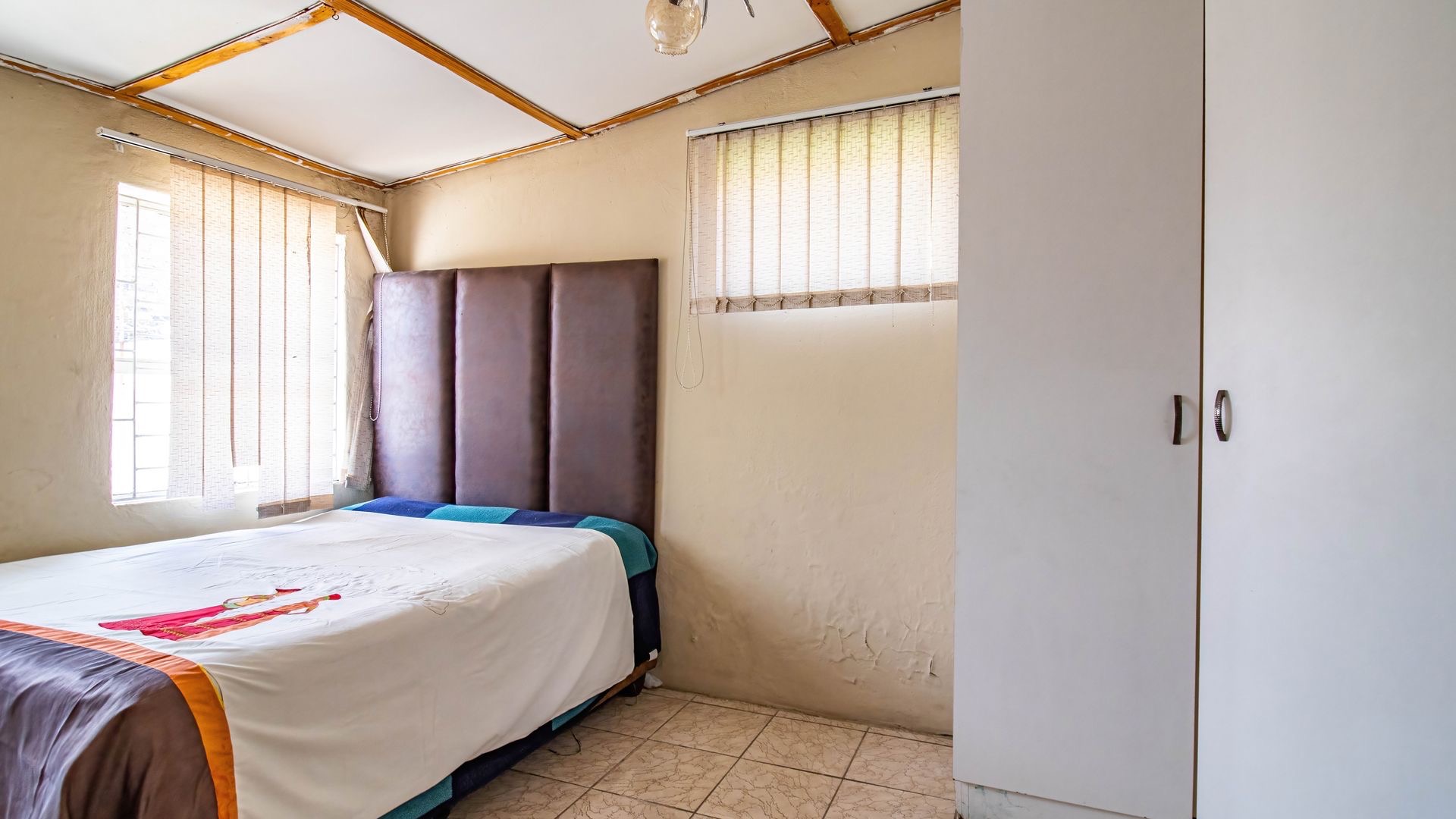 Situated in the suburban area of Newclare, Johannesburg, this substantial 5-bedroom residence offers a secure and spacious living environment. The property features a robust exterior with a tall, totally walled perimeter, an access gate, and burglar bars for enhanced peace of mind. A low-maintenance garden and paved driveway contribute to its practical kerb appeal, complemented by an inviting arched entrance.