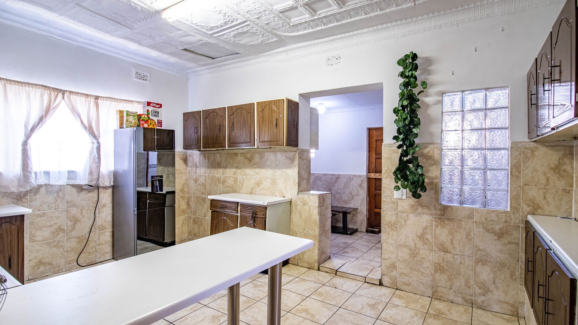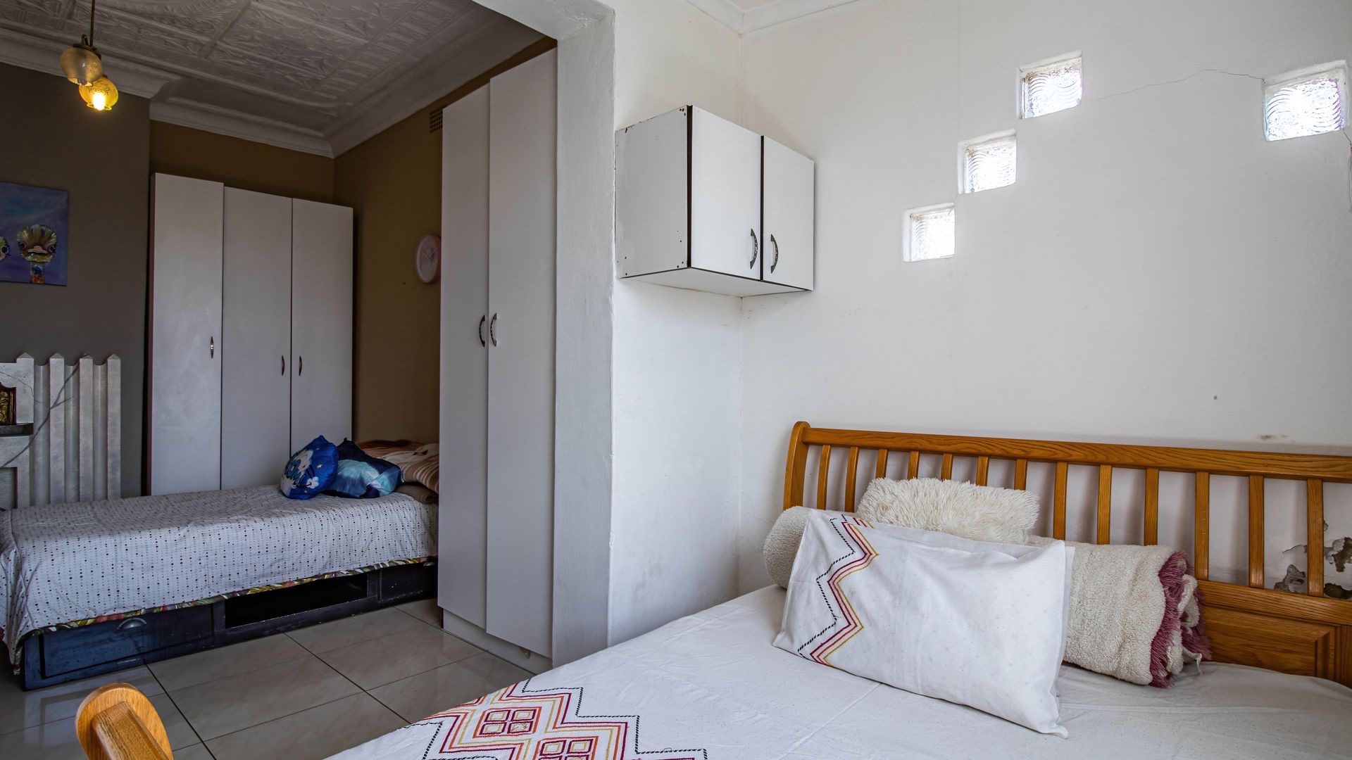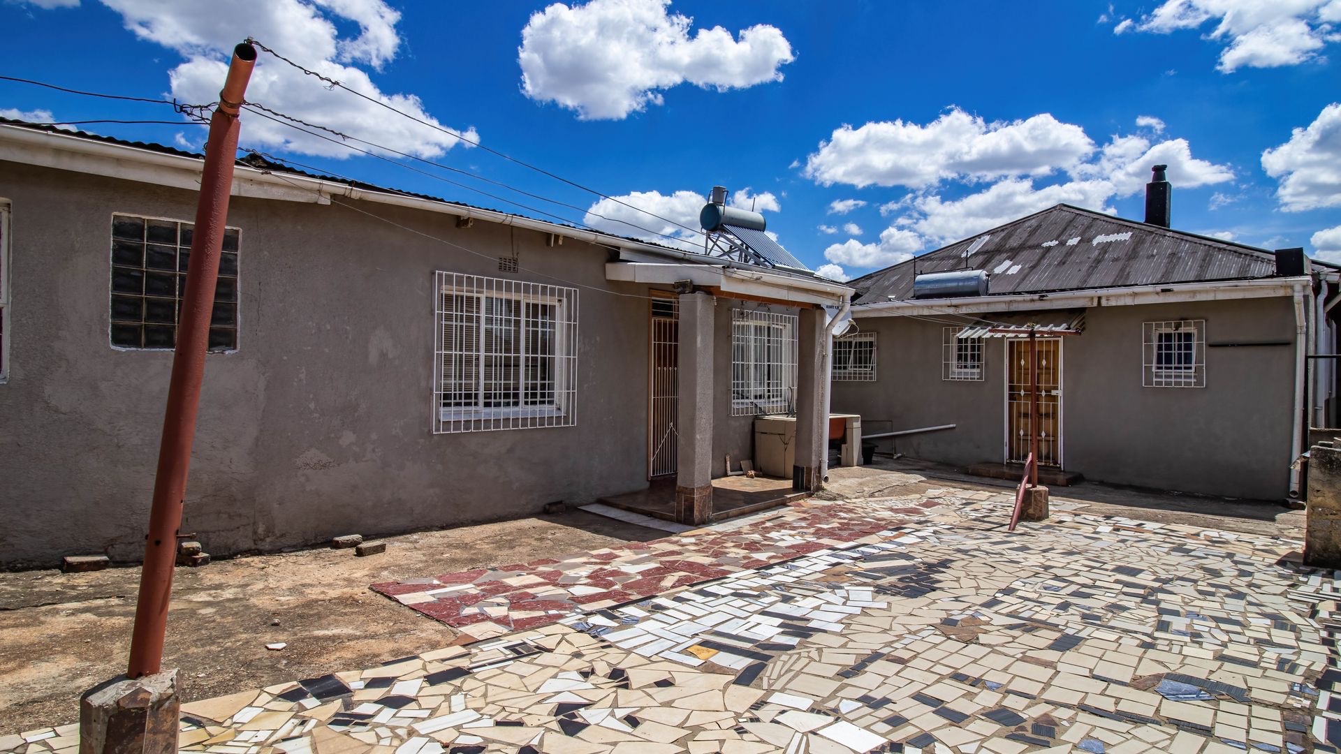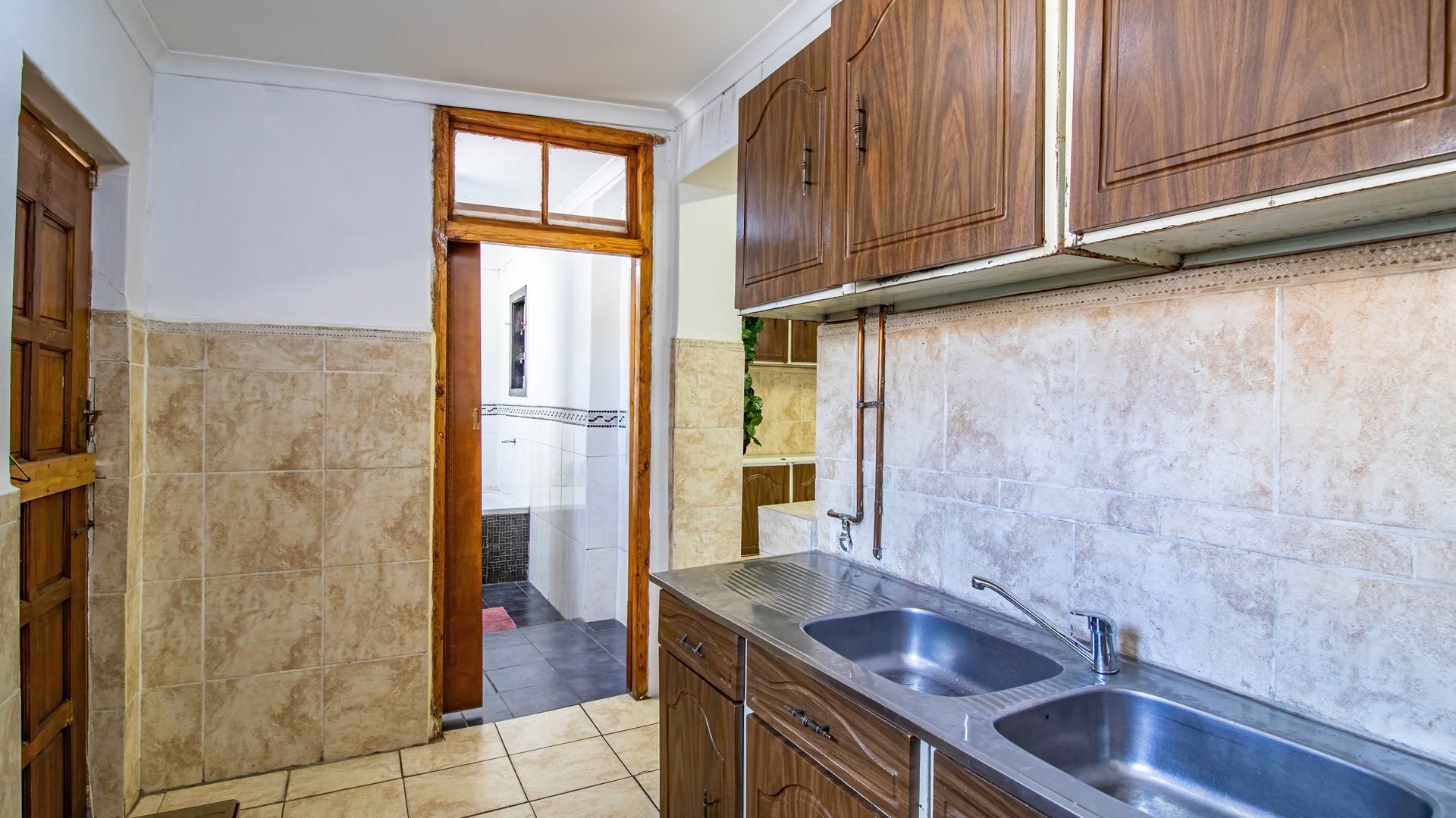 Situated in the suburban area of Newclare, Johannesburg, this substantial 5-bedroom residence offers a secure and spacious living environment. The property features a robust exterior with a tall, totally walled perimeter, an access gate, and burglar bars for enhanced peace of mind. A low-maintenance garden and paved driveway contribute to its practical kerb appeal, complemented by an inviting arched entrance.