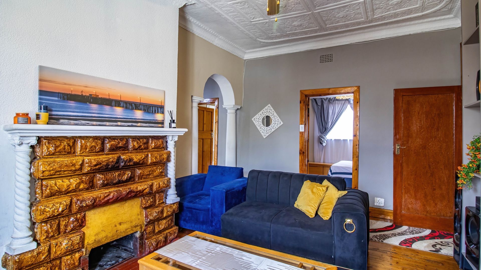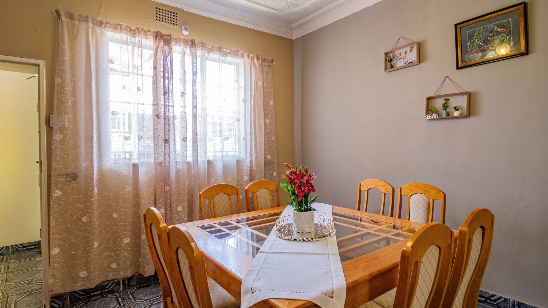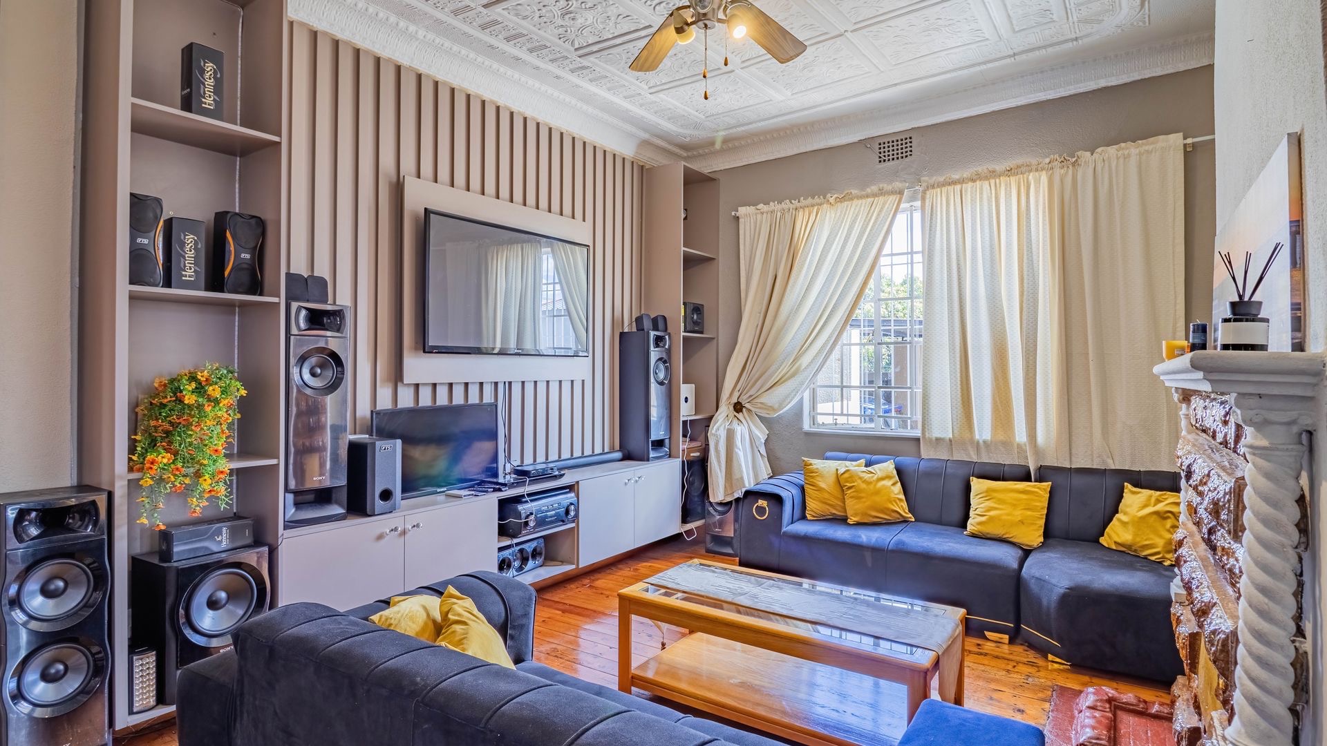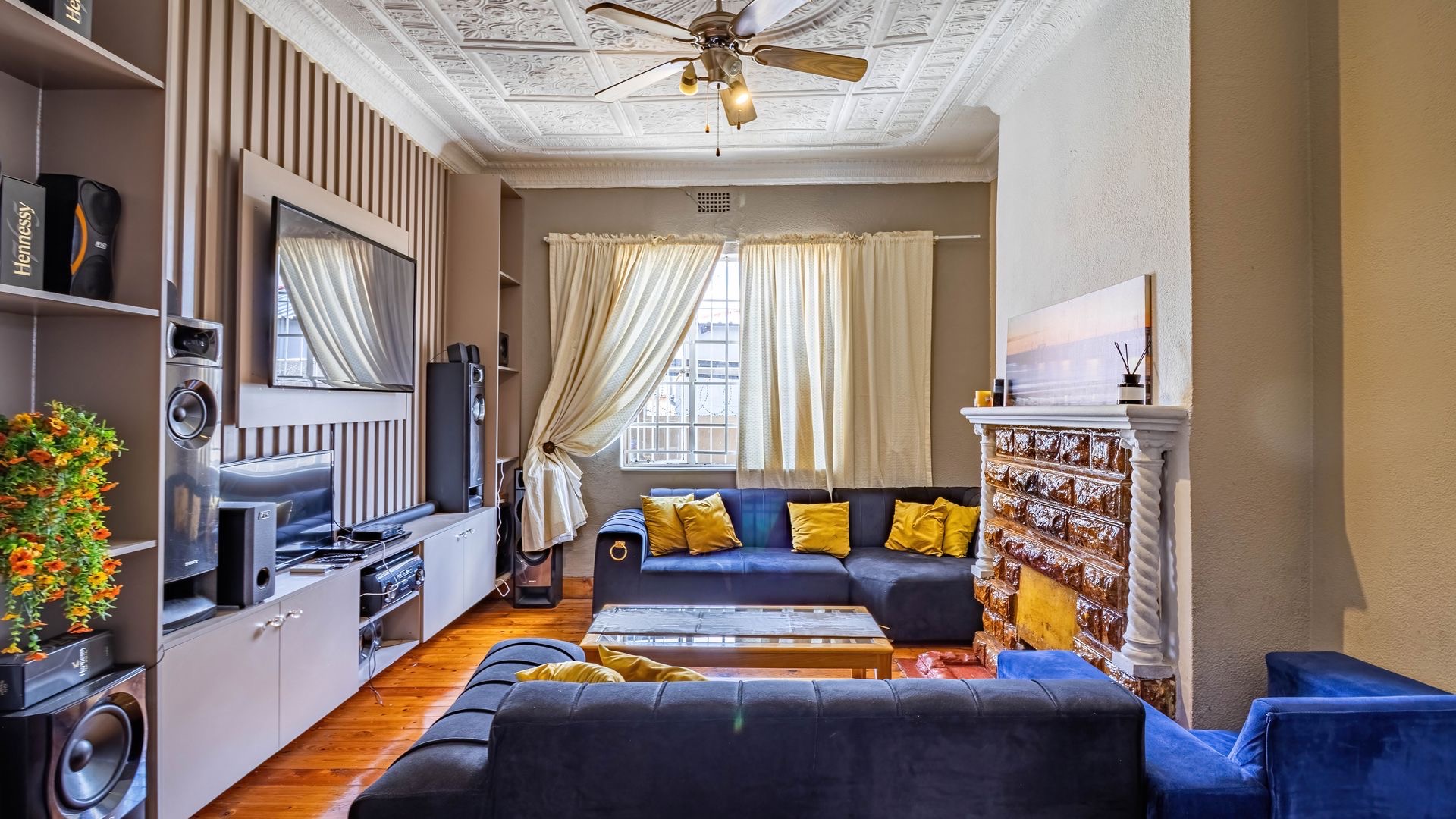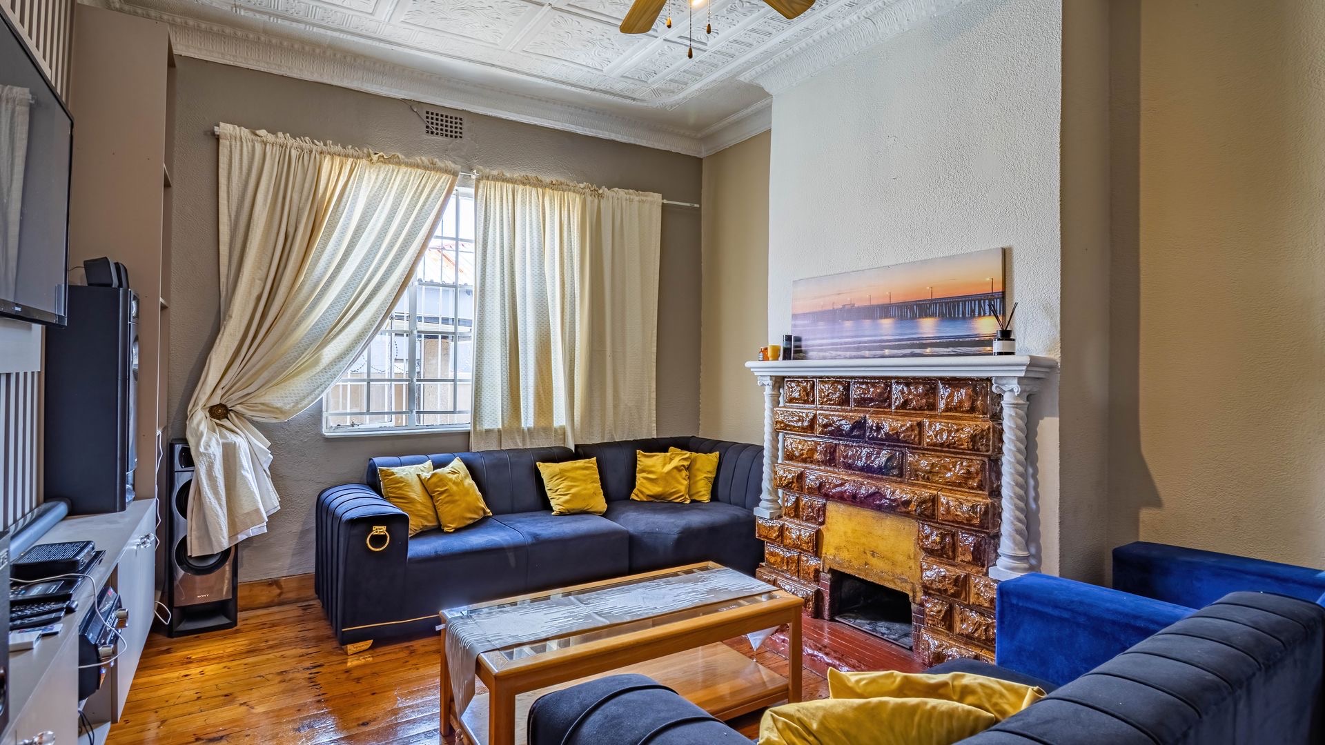Inside, an entrance hall leads to generous living areas, including a comfortable lounge and a dedicated dining room. Both spaces boast distinctive pressed ceilings and polished hardwood floors, adding character and warmth. Built-in entertainment units provide functional storage, while the decorative fireplace serve as a charming focal point. Large windows ensure ample natural light throughout the home.