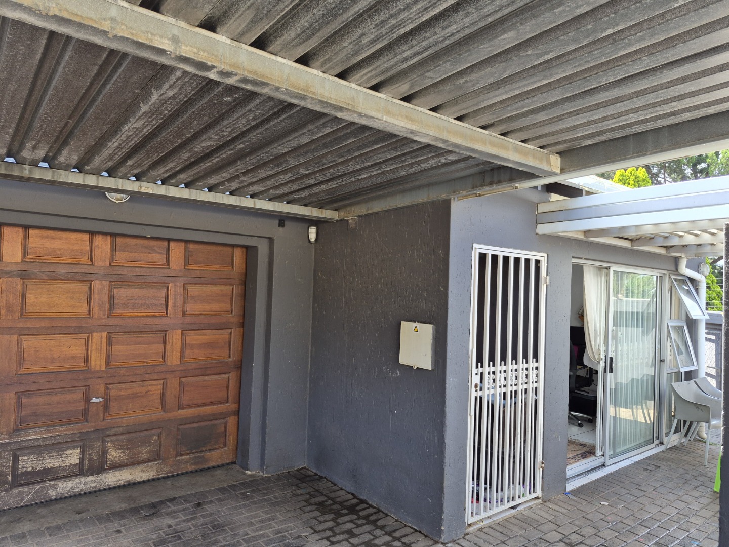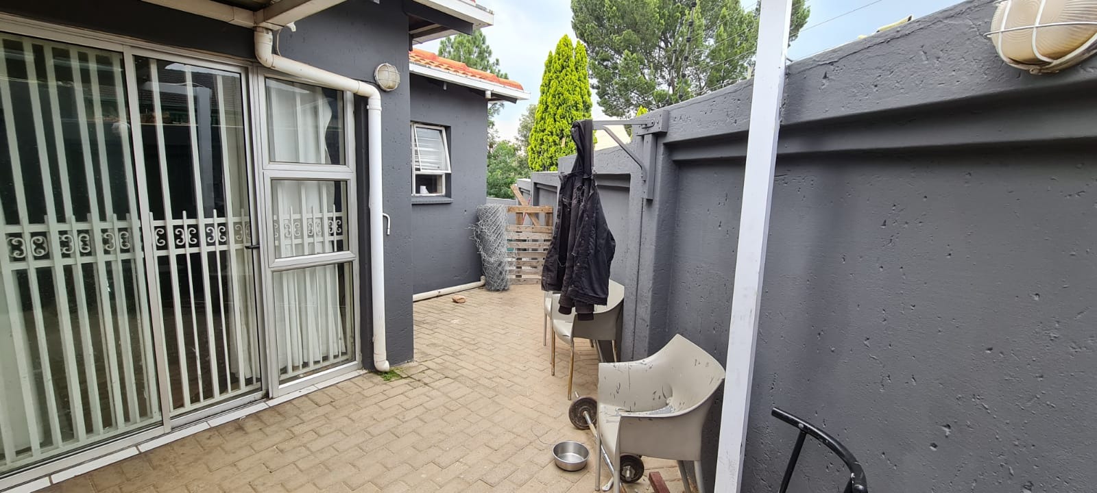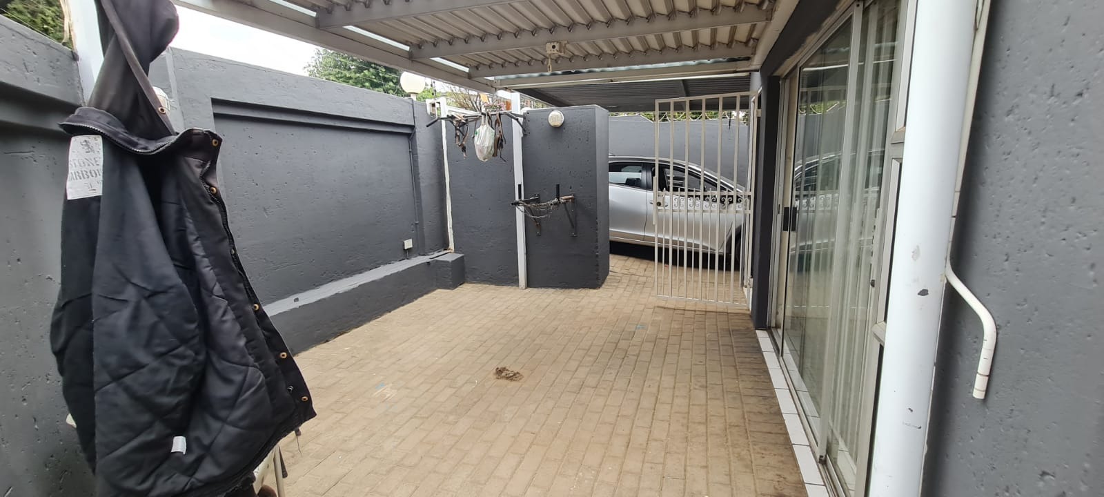 Externally, the property offers practical amenities including a covered carport and additional paved areas, providing convenient parking solutions. The presence of a garden allows for outdoor enjoyment, and pets are permitted. Security is comprehensively addressed with burglar bars, an access gate, and a totally walled perimeter, reinforcing peace of mind for residents.