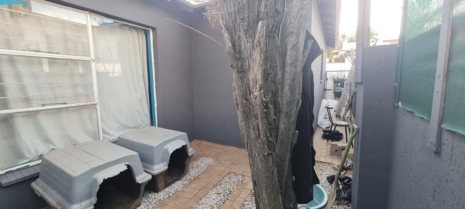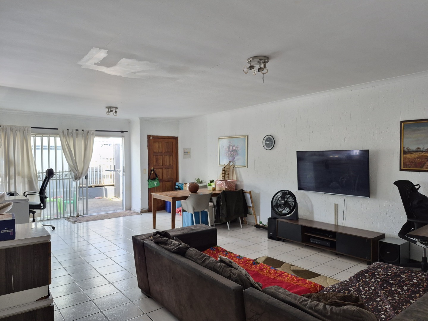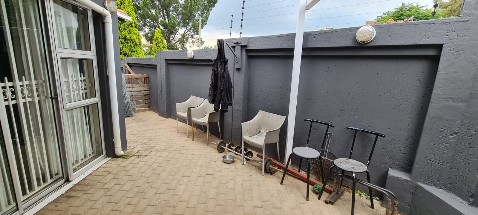 Externally, the property offers practical amenities including a covered carport and additional paved areas, providing convenient parking solutions. The presence of a garden allows for outdoor enjoyment, and pets are permitted. Security is comprehensively addressed with burglar bars, an access gate, and a totally walled perimeter, reinforcing peace of mind for residents.